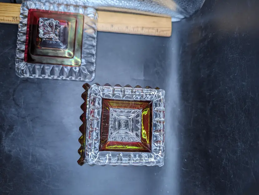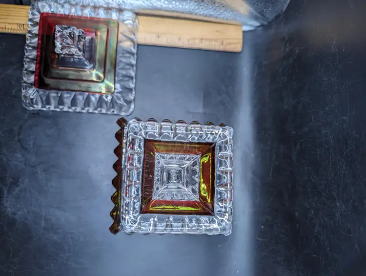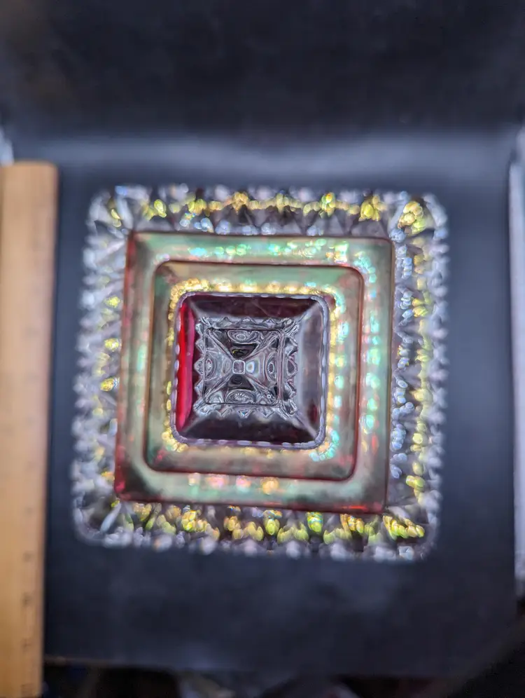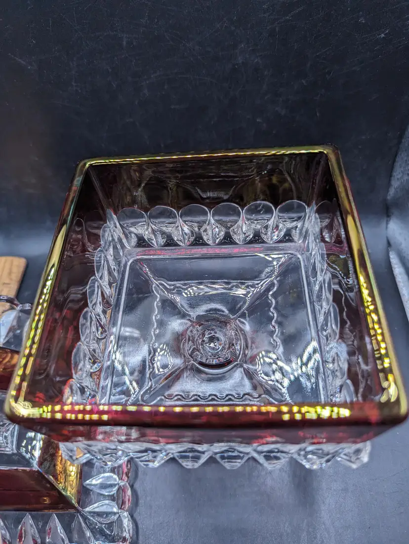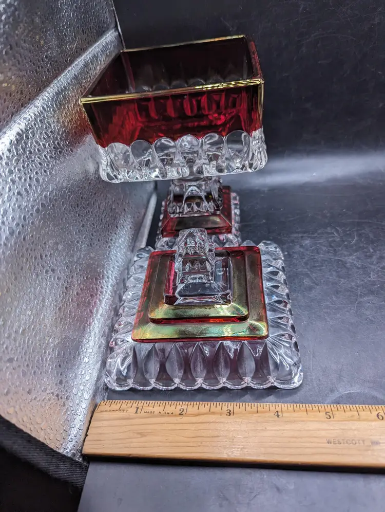 Add a touch of elegance to your home with this vintage ruby red glass candy dish. Perfect for storing sweets or as a decorative piece, it features intricate detailing and a charming lid. Please see all pictures for condition and measurements.