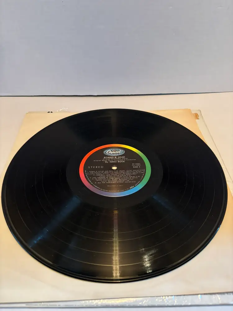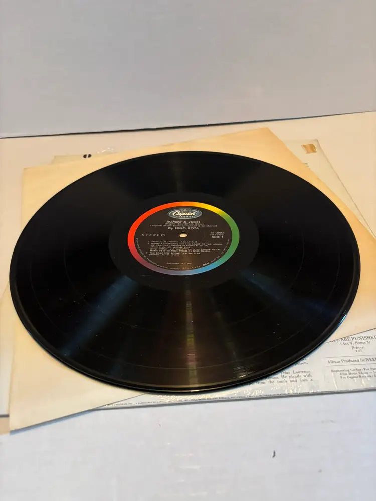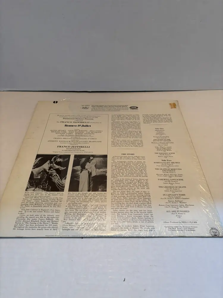 Immerse yourself in the classic ambiance of the Franco Zeffirelli production of "Romeo & Juliet" with this original soundtrack vinyl album. A true vintage piece, the LP captures the essence of Shakespeare's timeless tale through the ears of the audience, providing a rich auditory experience. Crafted with care, the record is presented by Neely Plumb and features a compilation of artists who bring the story to life. The 12-inch record size ensures a full-bodied sound that is only possible with the vinyl format, making it a must-have for enthusiasts of the genre and collectors alike.