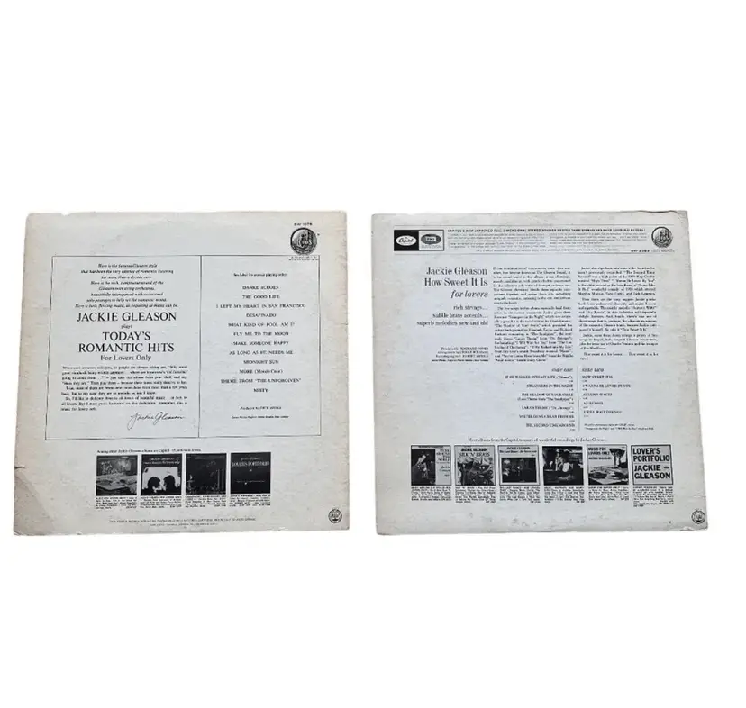 This vintage vinyl lot includes two LPs by Jackie Gleason, featuring a collection of romantic hits perfect for any music lover. The 12" records are in the classic format, with a speed of 33 RPM and made from durable vinyl material. Both LPs were released by Capitol Records and are sure to be a great addition to any music collection.