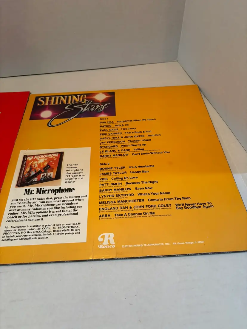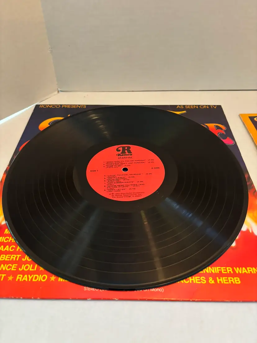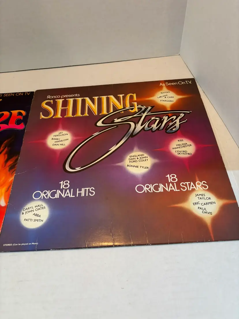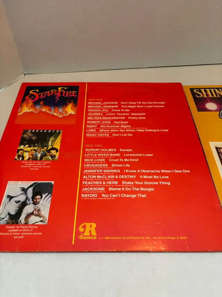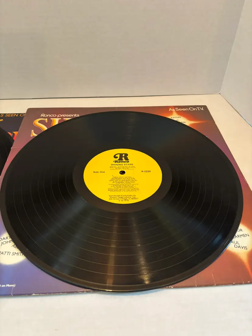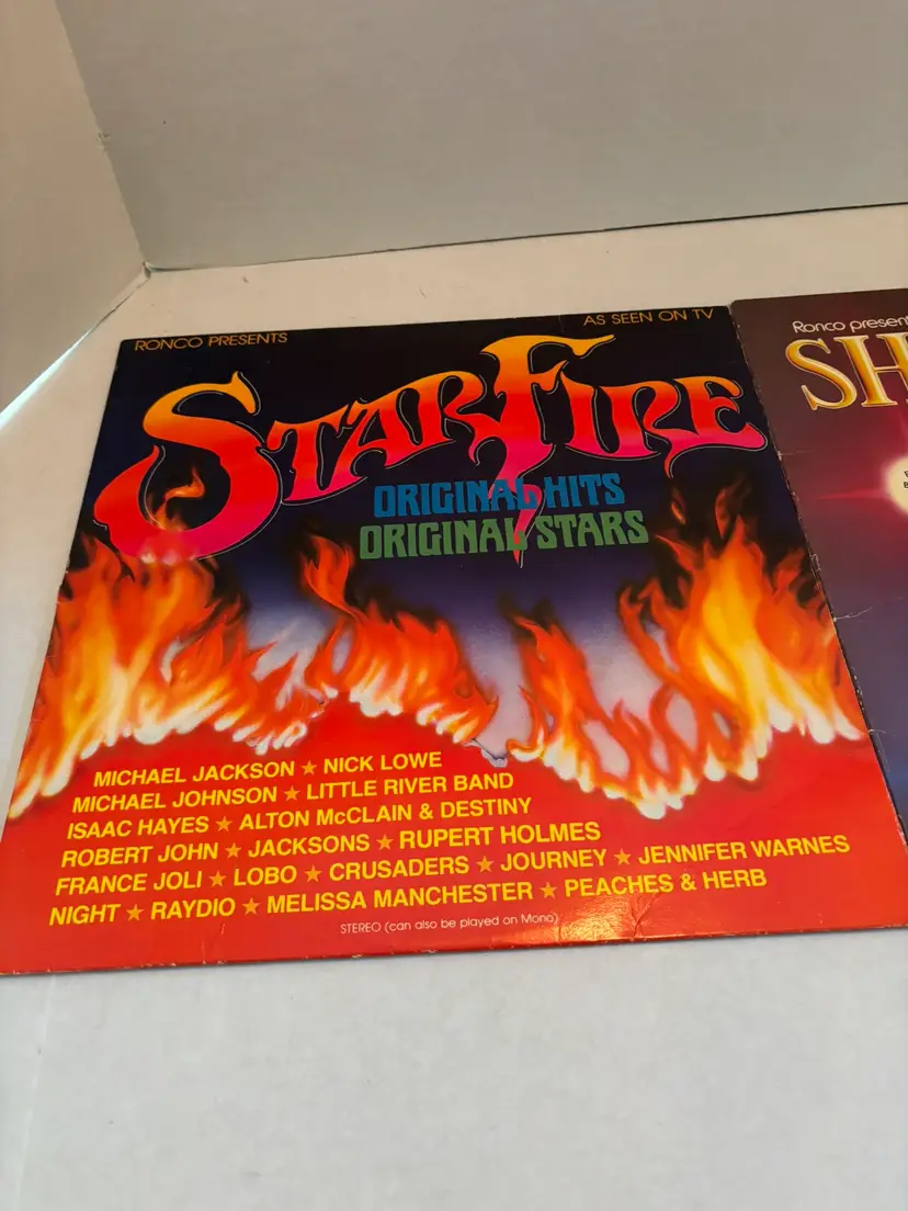 This vintage vinyl lot includes two LP records by RONCO Presents, "Star Fire" from 1980 and "Shining Stars" from 1978. The records feature various artists in the pop genre, with English-language lyrics. The vinyl is in black color, with a 12" record size and a speed of 33 RPM. The original cover is also included, showcasing the iconic nostalgia of the 1970s era. Perfect for music enthusiasts looking to add some retro charm to their collection. NO SLEEVES FOR EITHER