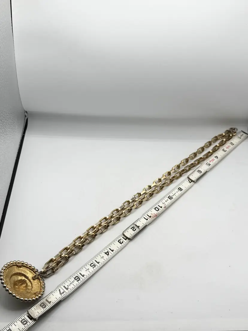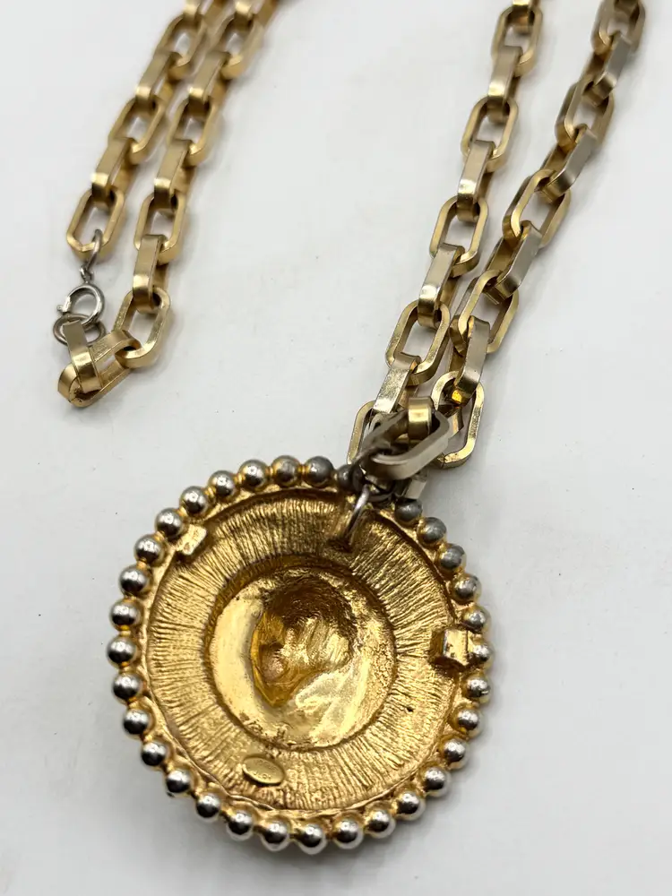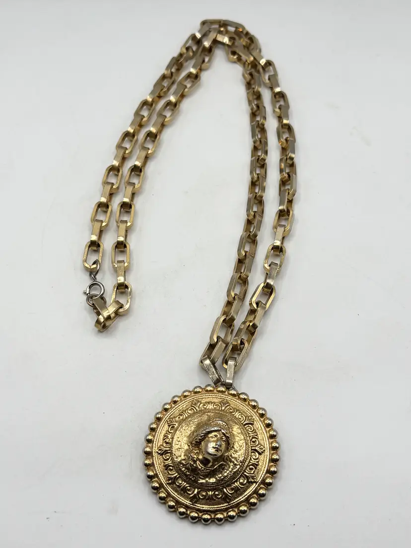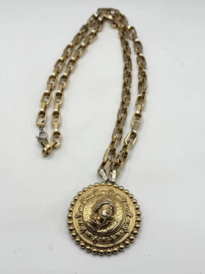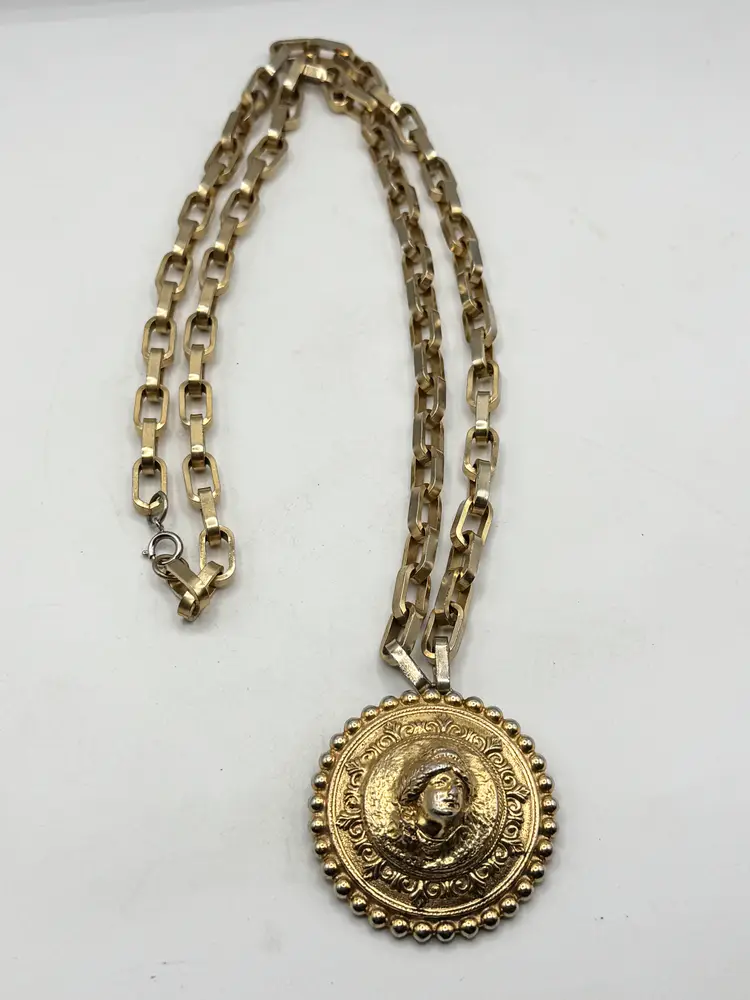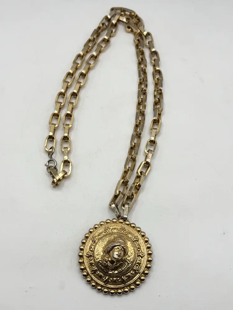 Vintage Vogue Jewelry lady medallion pendant necklace. Heavy gold chain necklace with lady pendant. Signed Vogue Jlry. Well made vintage necklace. MN56J.