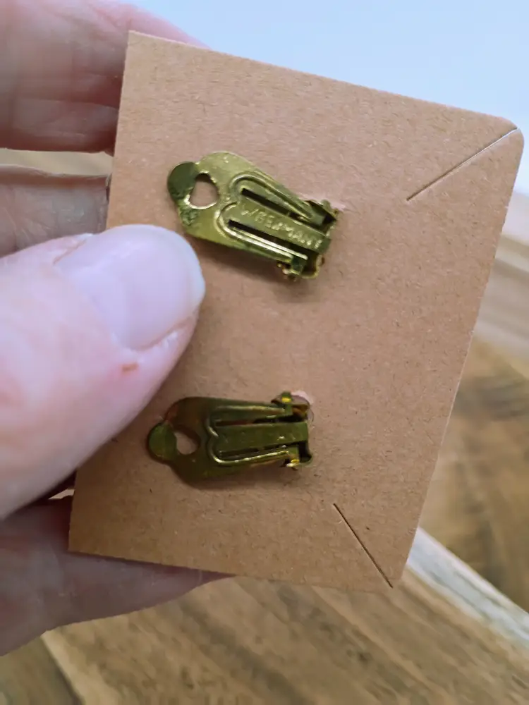 Vintage W Germany Yellow- Orange Acrylic Lucite Trumpet Bead Cluster Clip On Earrings. Colors run a spectrum from a bright yellow to amber peachy orange and are both clear and opaque. Really unique. Marked on back West Germany. Circa 1950's. These are preowned, no loose or missing beads, no damage to beads clips work smoothly. There is some oxidation on backs this can be polished if desired by buyer. Overall VG condition. Ships USPS