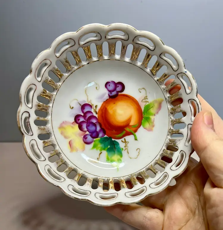 5” porcelain hand painted reticulated bowl with apples and grapes. No chips or cracks