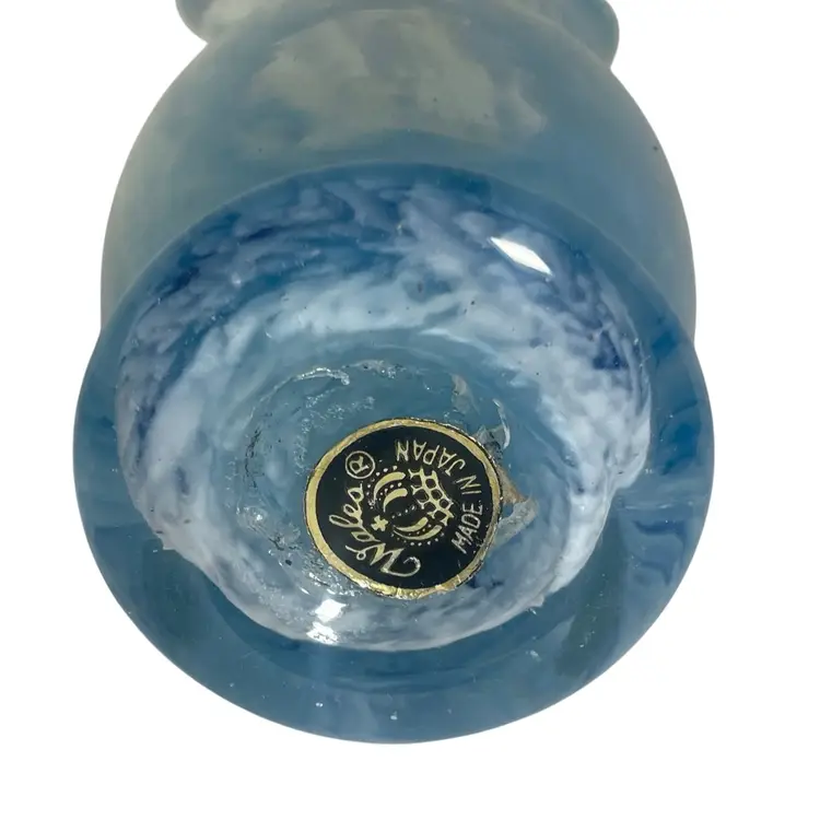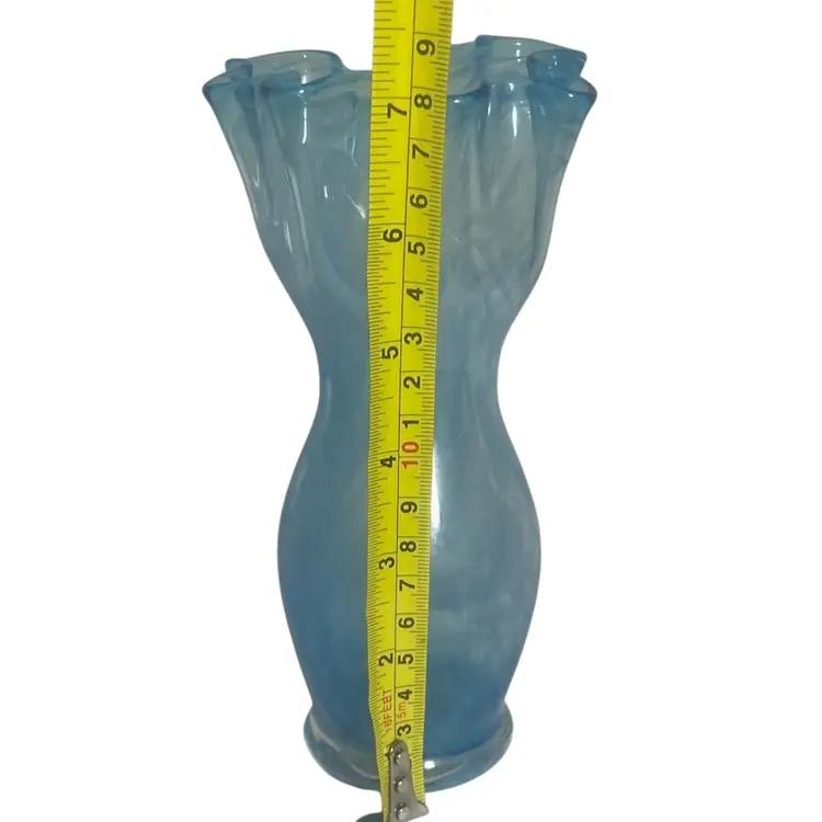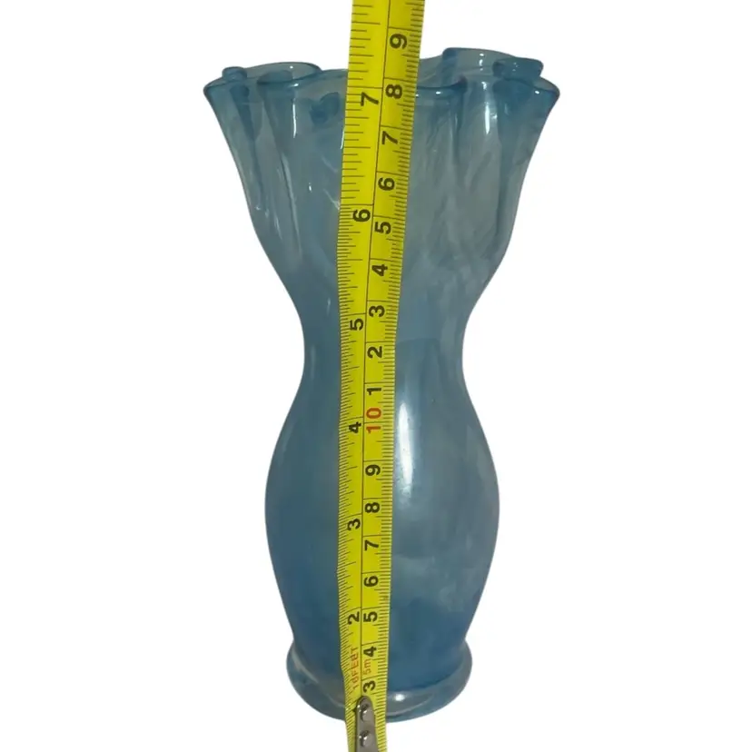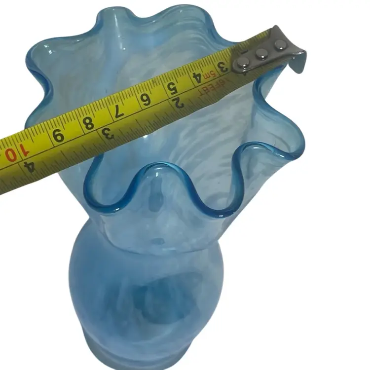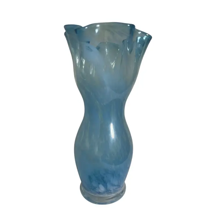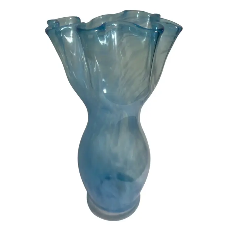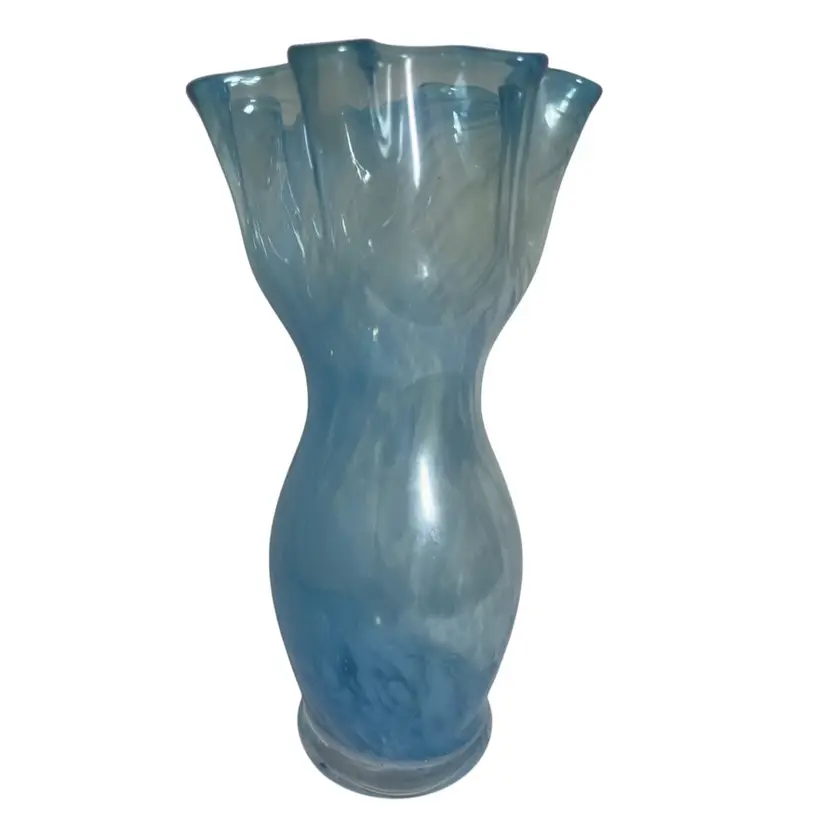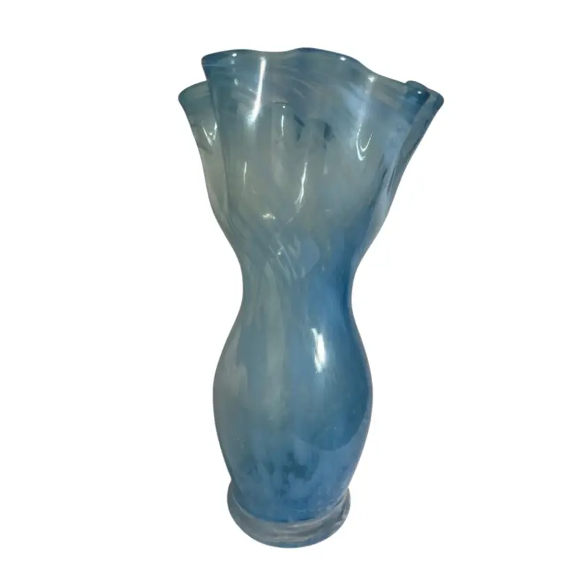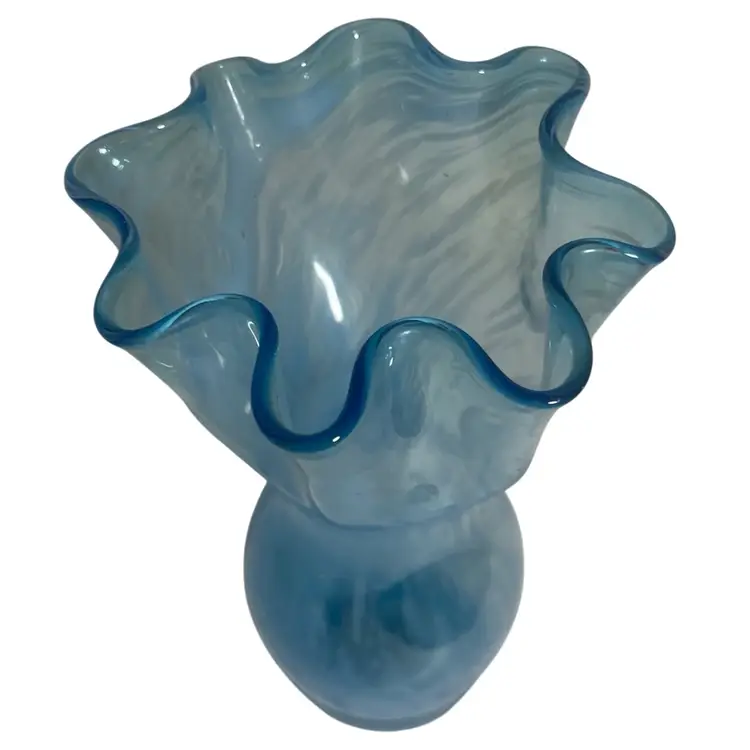 Vintage Hand Blown Blue & White Swirl Vase Handkerchief Ruffle Rim 8” Tall Art