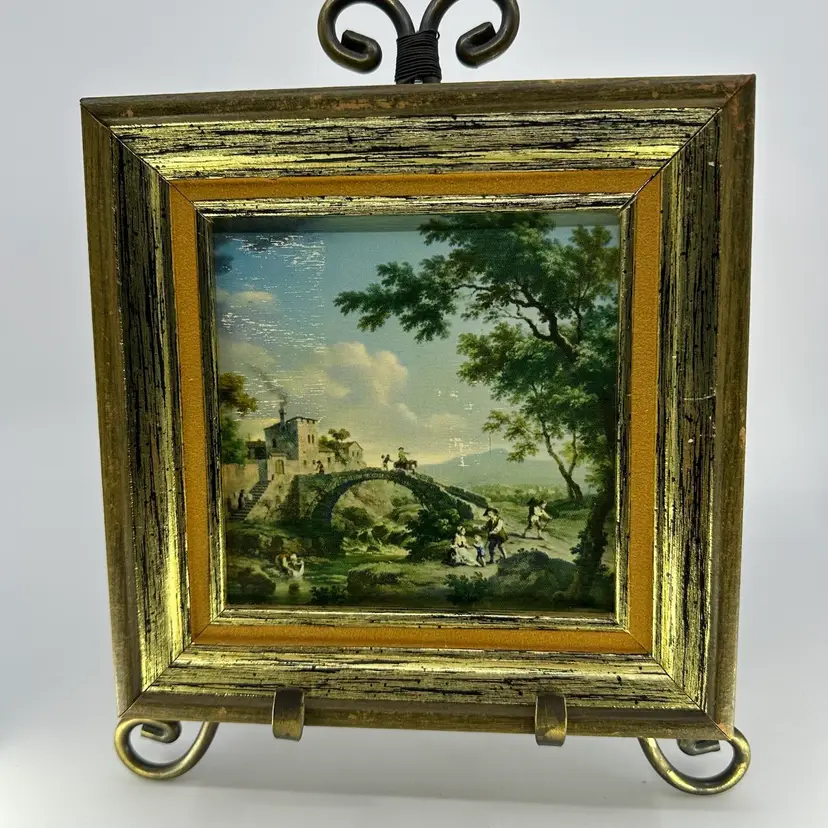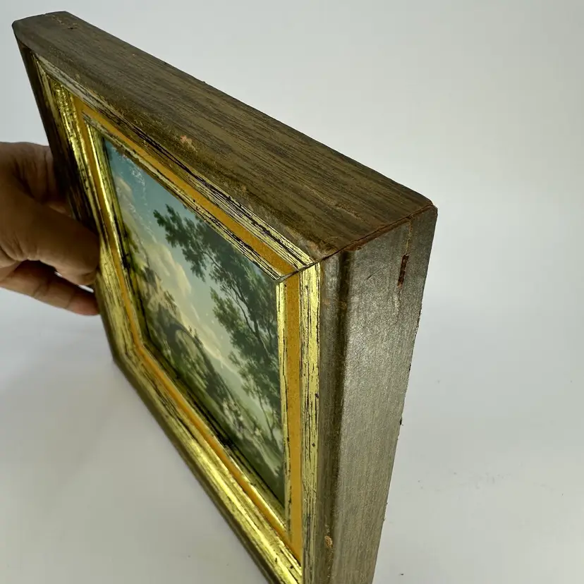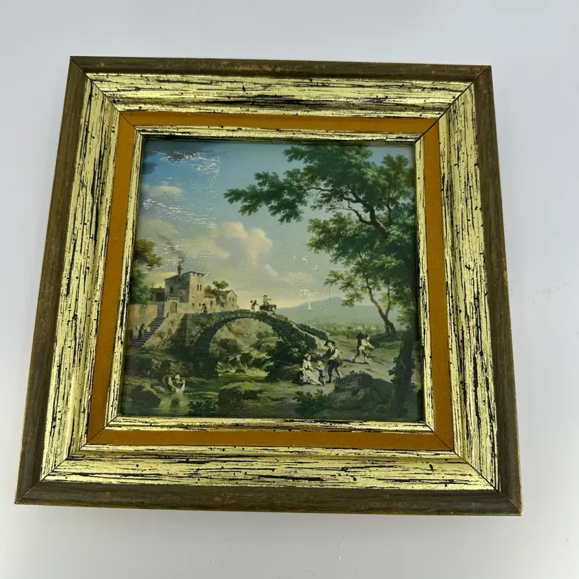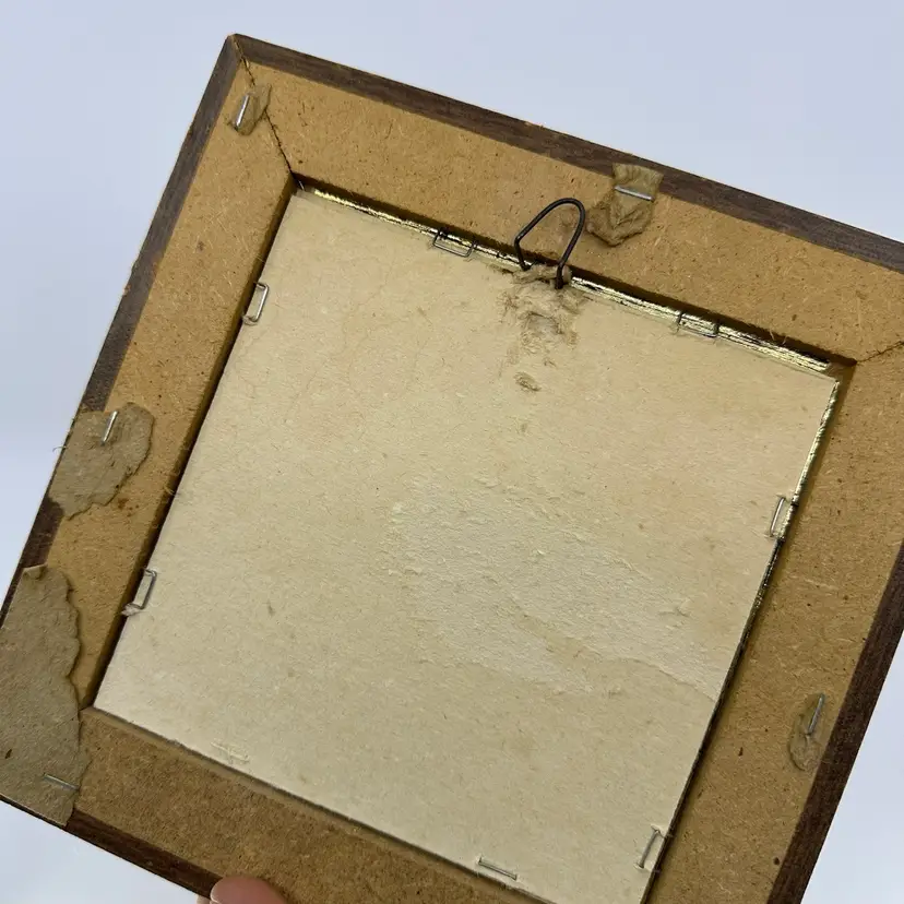 Approx 7.5”x7.5”- some wear, good condition, ready to hang