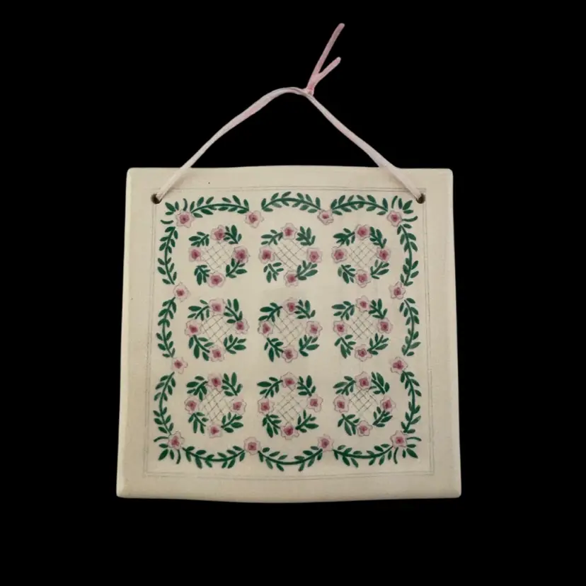 Celebration of quilts company hanging ceramic glazed tile measuring 4 inches squared. One small flea bite on bottom otherwise good condition.