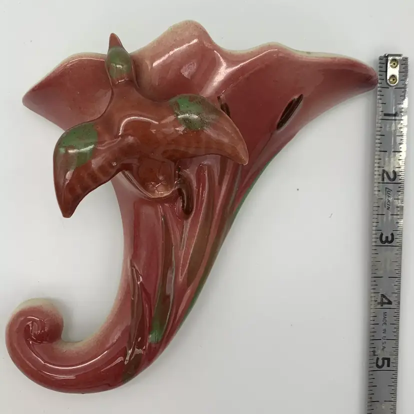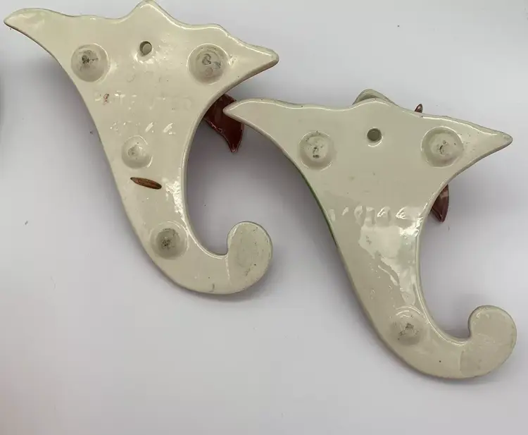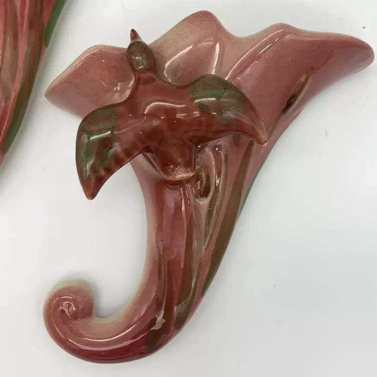 Two matching vintage wall pockets Color: Mauve pink with green and brown Shape: Cornucopia Decoration: Ducks (or geese) flying over cattails Back reads: Patented 149144 Condition: No chips or cracks Size: Approximately 5.5" tall and 5" wide