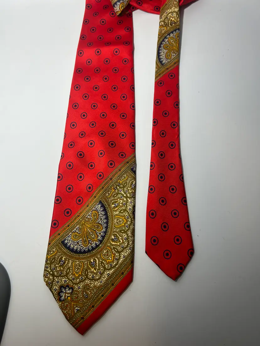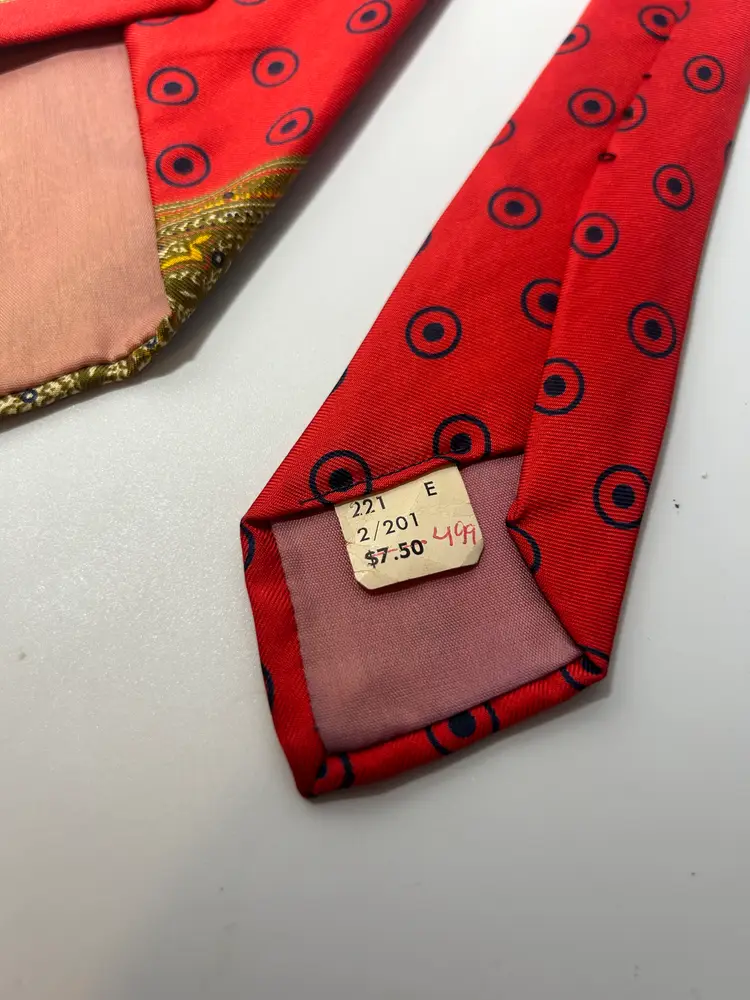 Ties will be looked over for major defects such as - large stains, loose threads, holes etc. and will be noted. Vintage ties could have wear due to use and age. Please enlarge all photos for overall condition and wear. So please expect pilling, stray threads etc that are not noted. They may have to be spot cleaned, pressed, labels may need to be sewn back on etc. Due to the differences in the lighting, fabric textures, and your computer settings, colors can differ slightly when received.