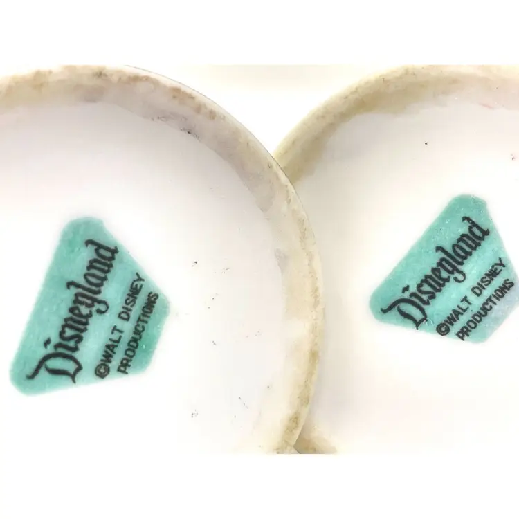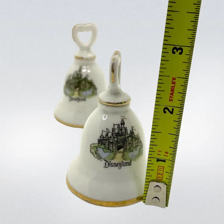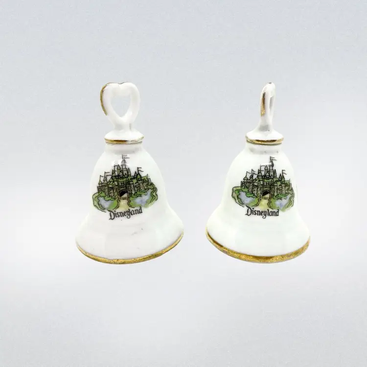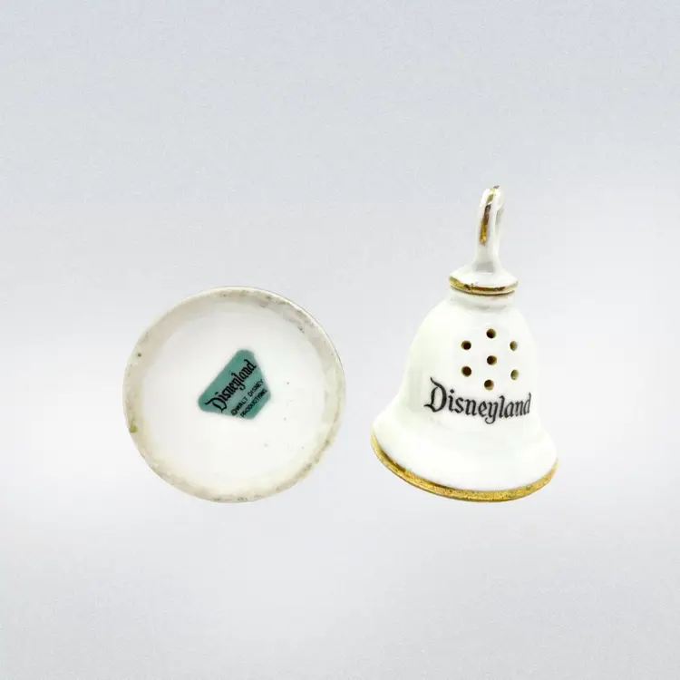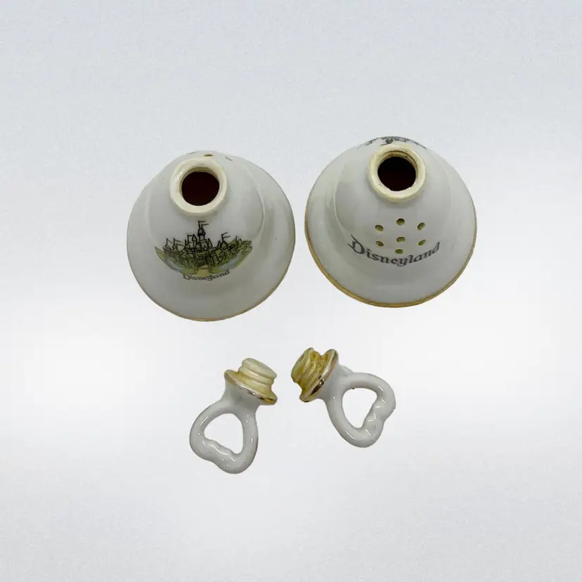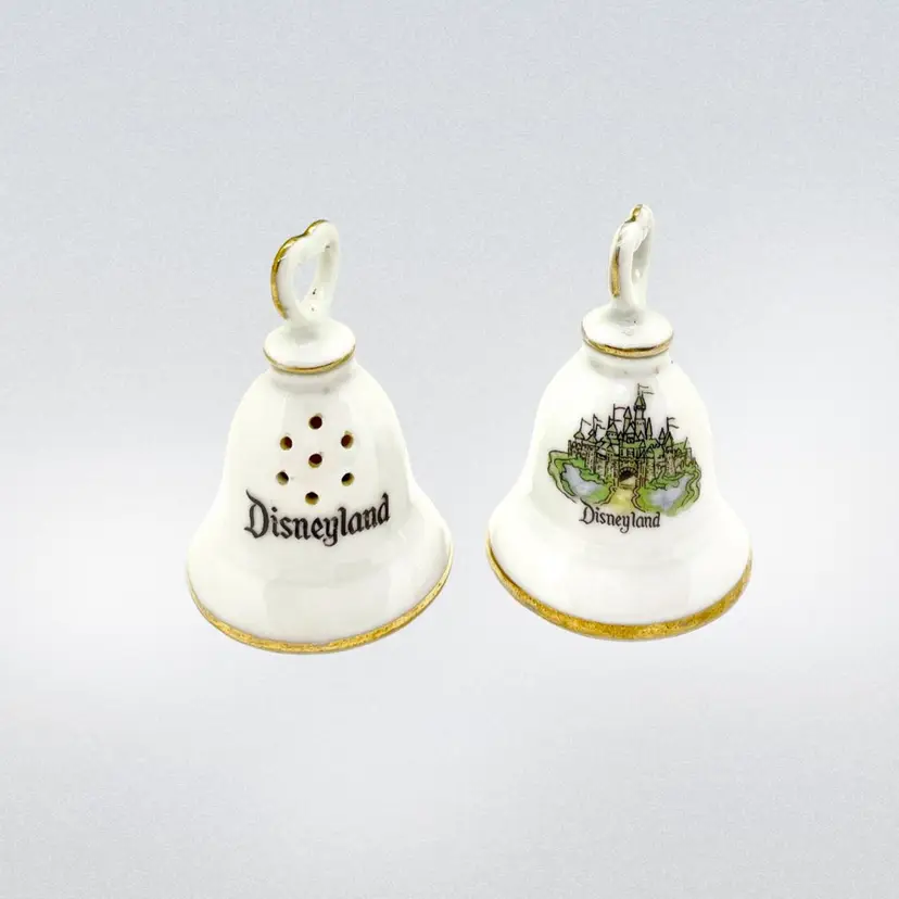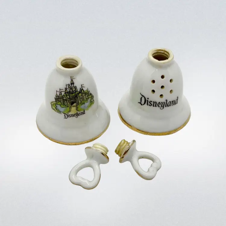 This is a hard to find VERY early bell shaped Salt & Pepper set sold at Disneyland as a souvenir, likely in the late 1950s to early 1960s. The Screw on lids were a very early design. Disney later made these bell shaped shakers as one solid piece which filled from the bottoms. The graphics on this set feature Disneyland's Castle. The back sides read, "Disneyland" in gold lettering. They measure about 2 7/8" high by 2” wide. This set is in very good, gently used condition with NO cracks or breaks. There is only a little wear to the gold trim. There is some very minor chips on the inside where the top screws into the base.