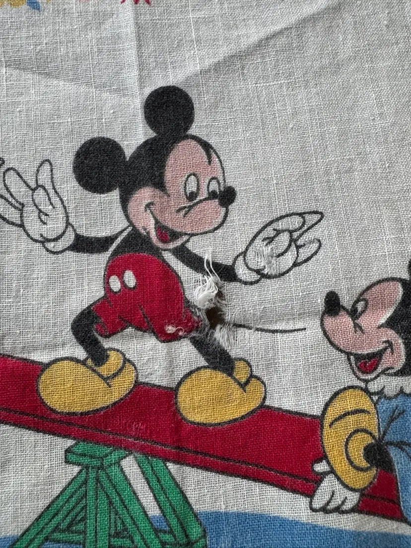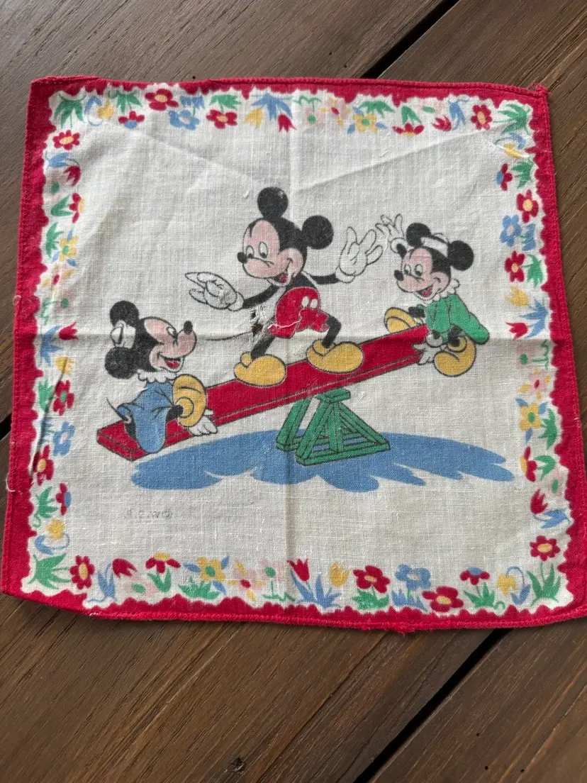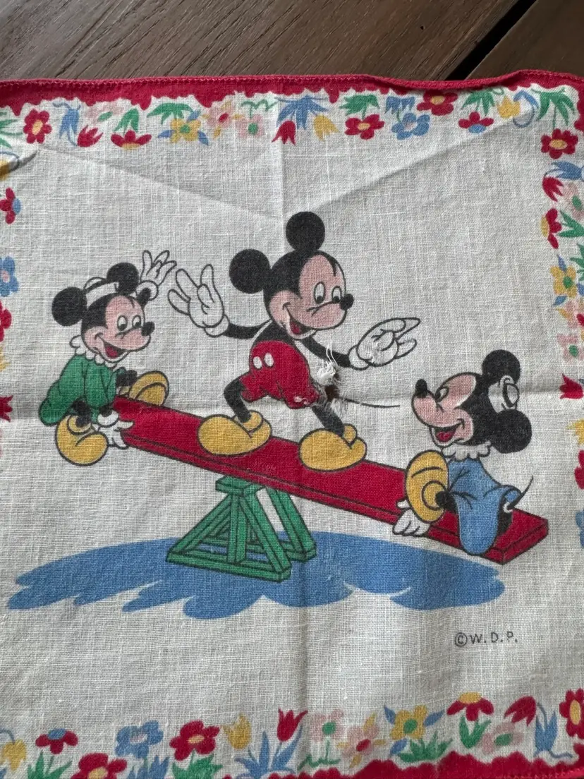Handkerchief has Mickey and other mice on a see saw with a floral border. Piece does have a hole. See video.