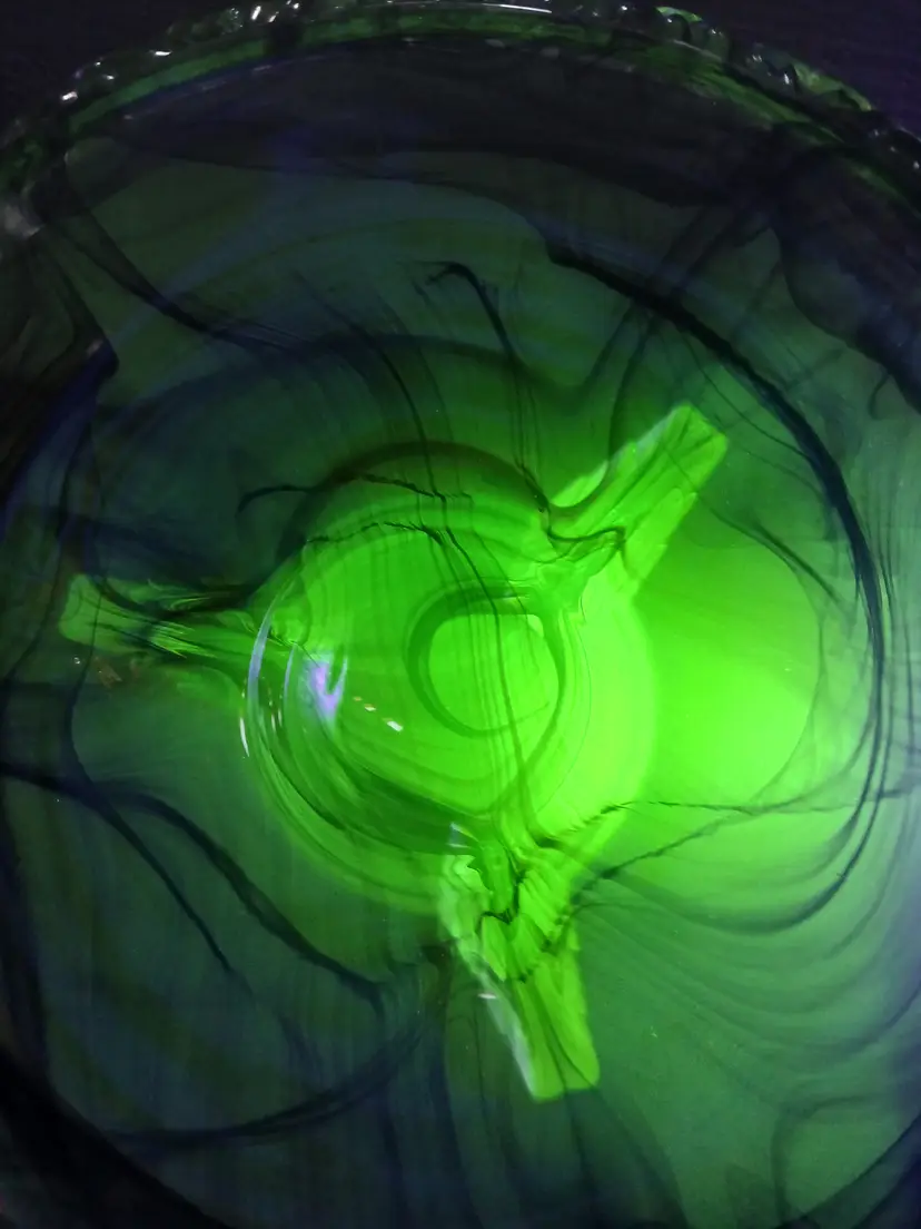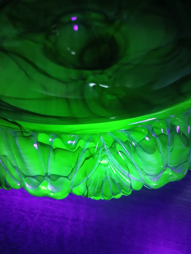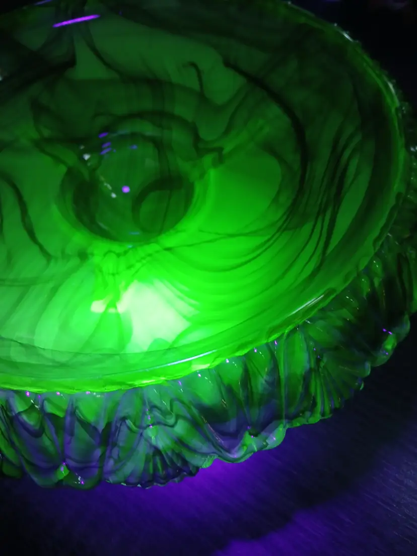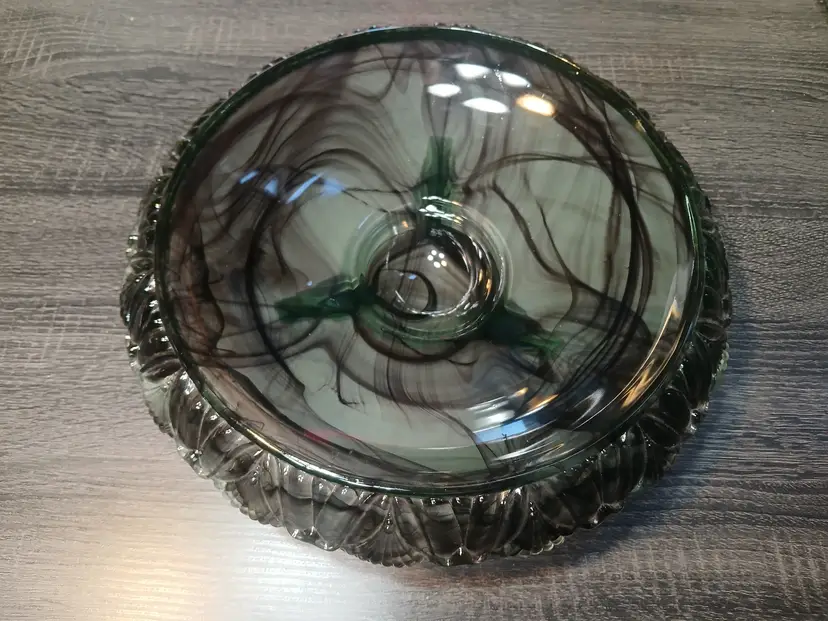 This gorgeous August Walther & Sohne centerpiece bowl is part of their Oralit range of cloud glass called Malachit. Features violet trails on a green glass base. The entire bowl will fluoresce intensely under a UV lamp.