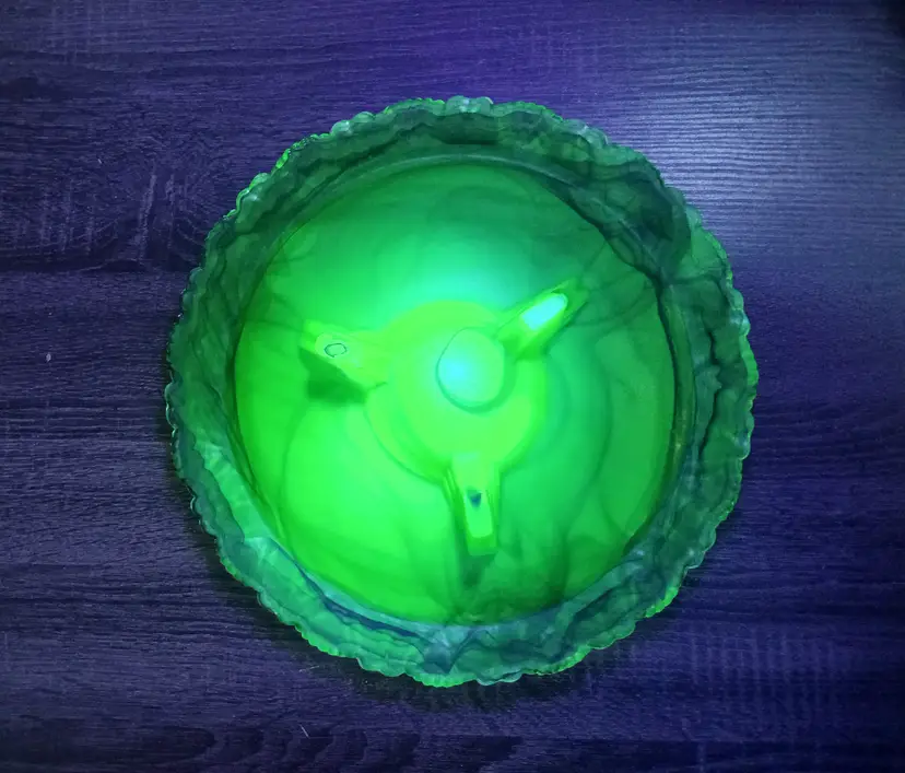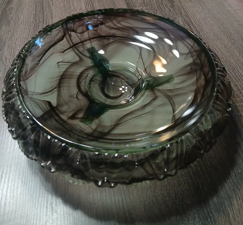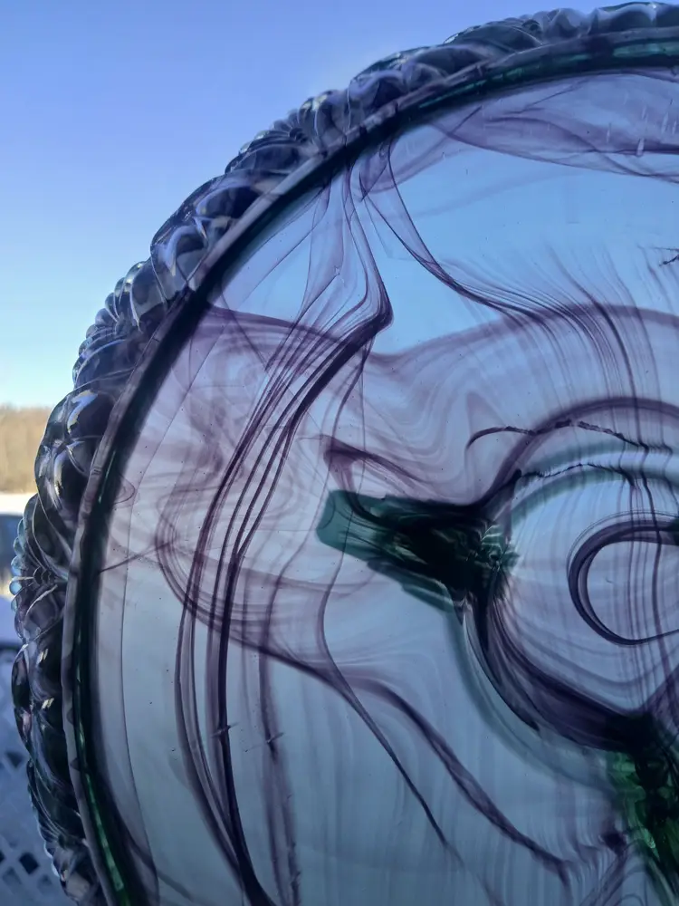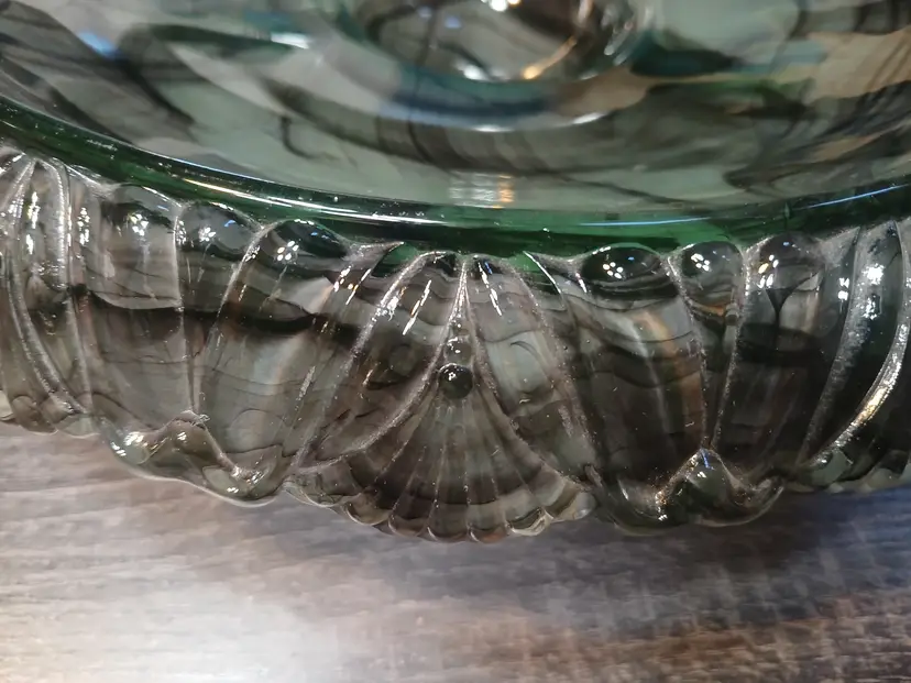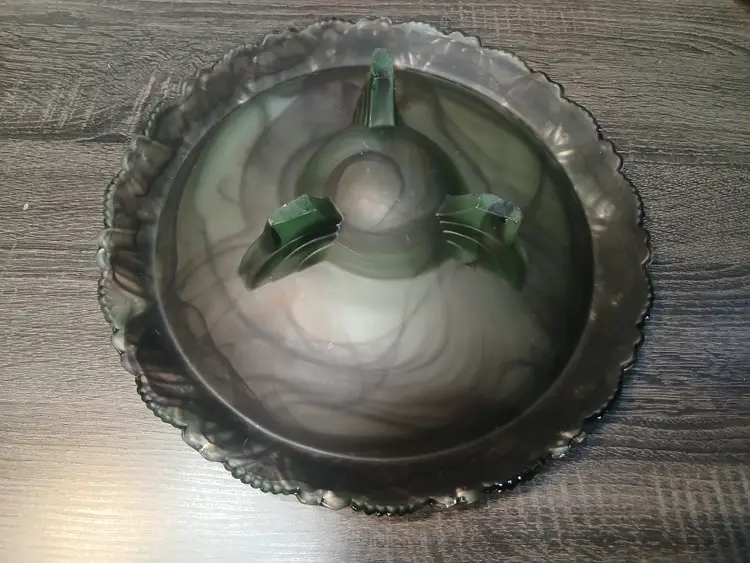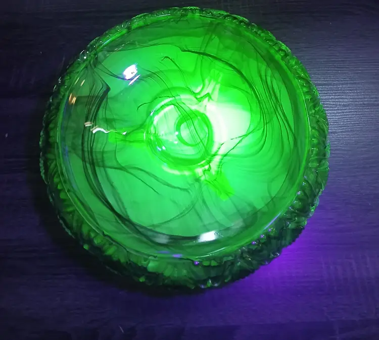 This gorgeous August Walther & Sohne centerpiece bowl is part of their Oralit range of cloud glass called Malachit. Features violet trails on a green glass base. The entire bowl will fluoresce intensely under a UV lamp.