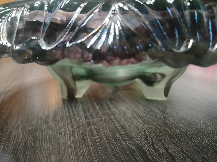 This large three-footed bowl has a smooth interior with an intricate molded rimmed edge. The underside, including the feet are a frosted glass finish.