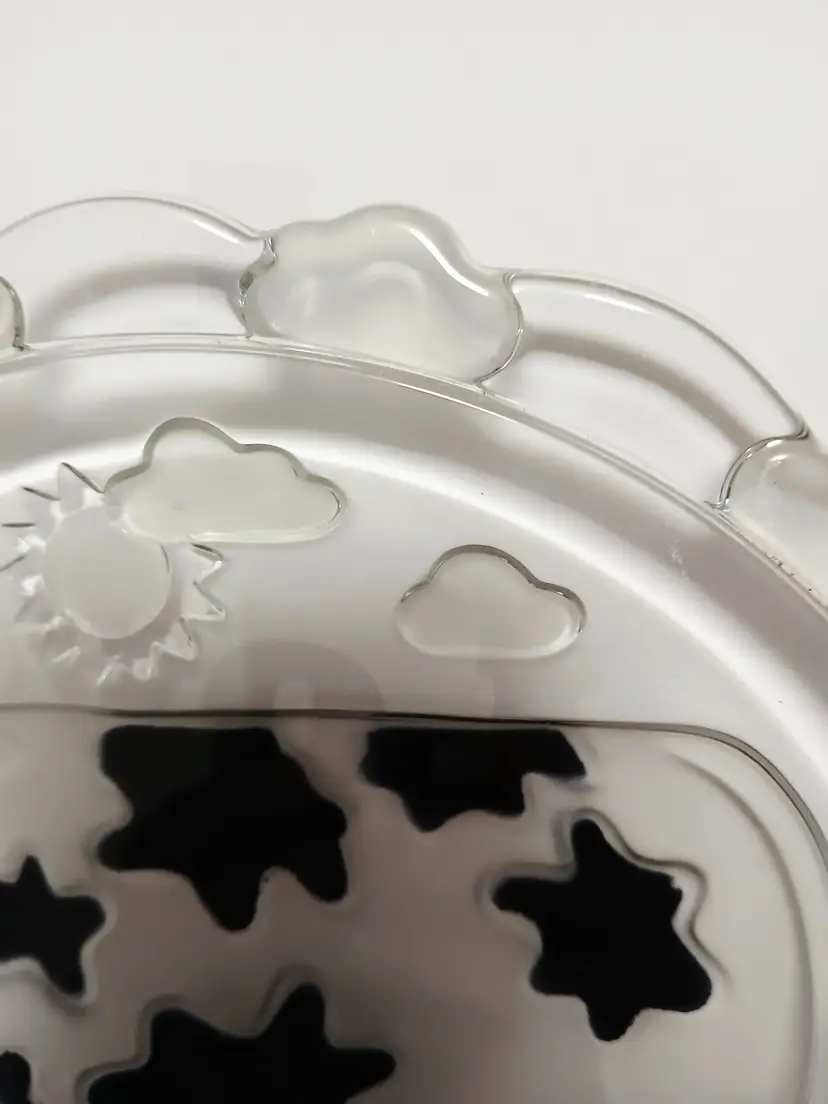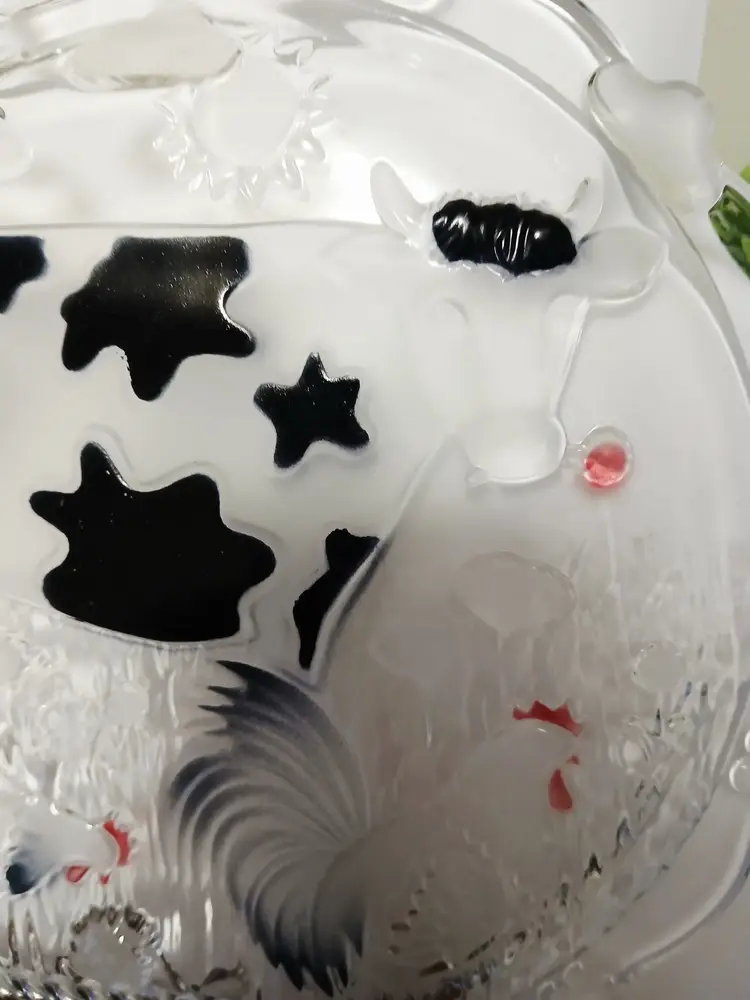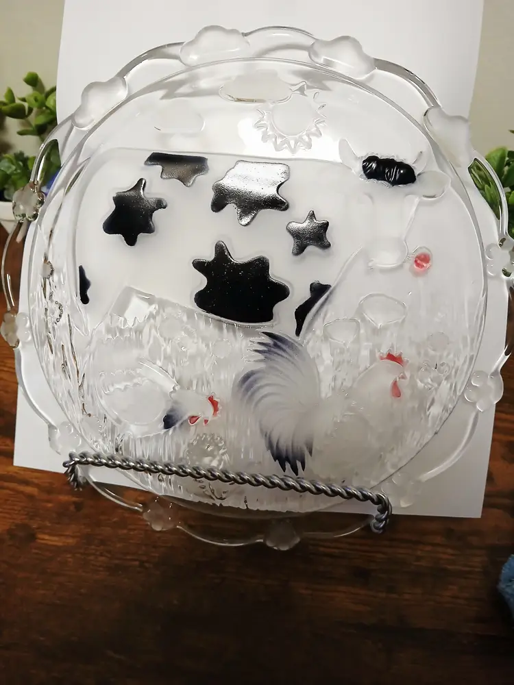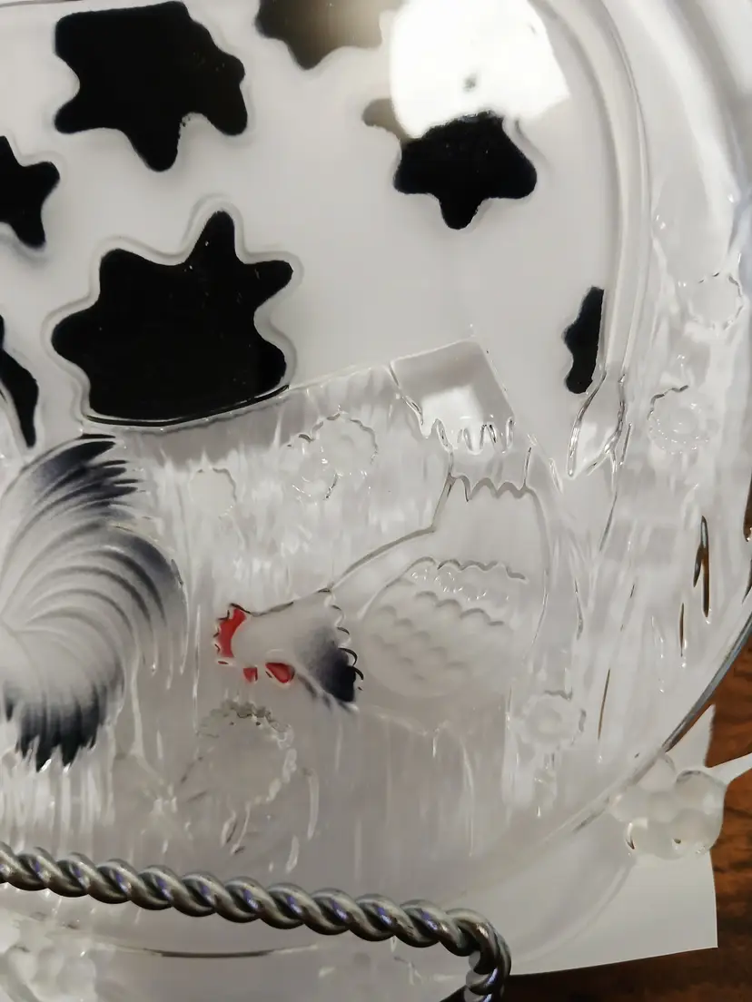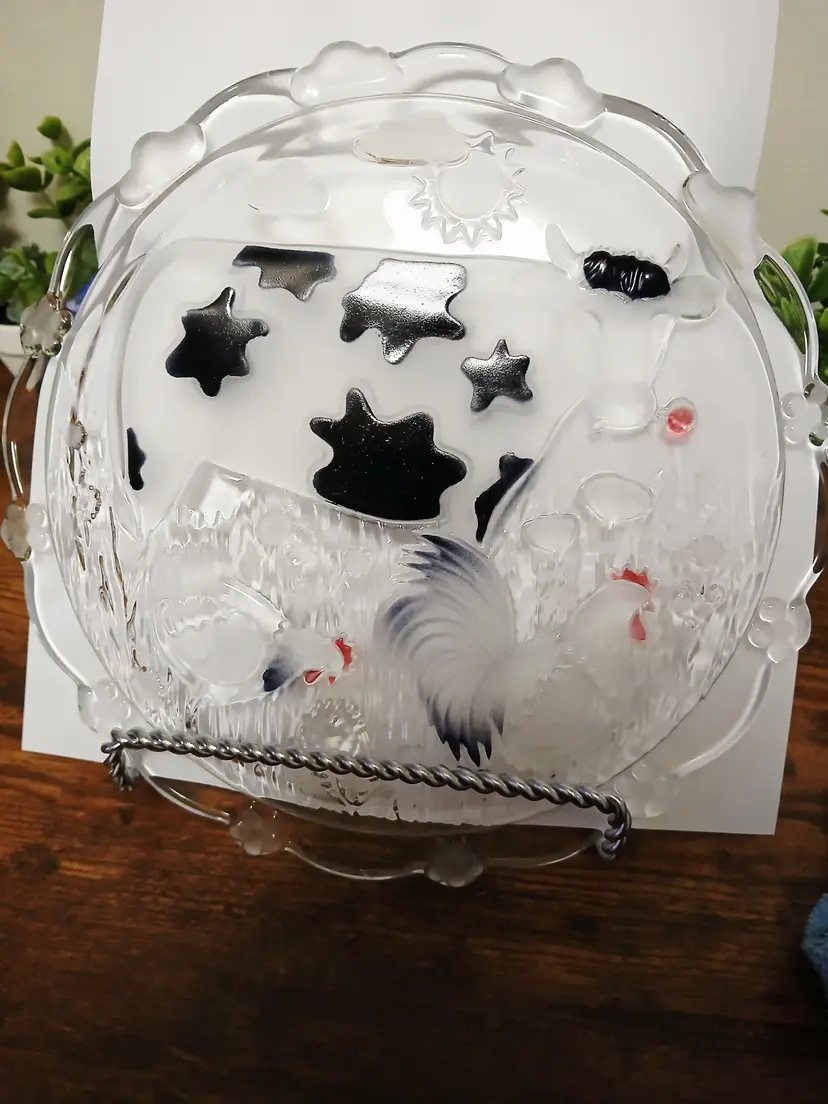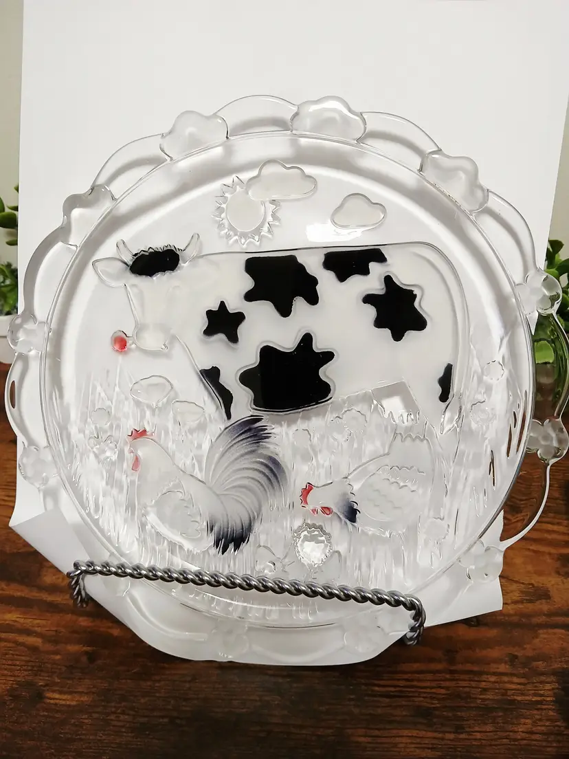 Bring a touch of countryside charm to your table with this vintage glass platter featuring a delightful farmyard scene. With a cow, rooster, and hen etched into the design, it's perfect for serving or as a decorative piece. Measures approximately 9 inches in diameter. Plate rack Not included