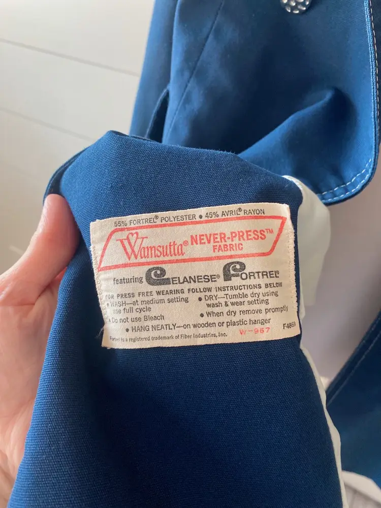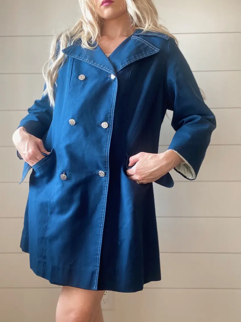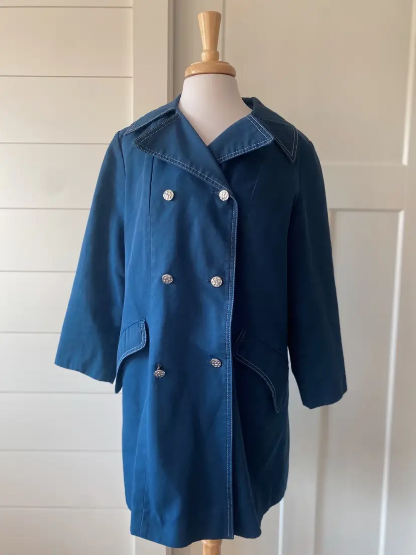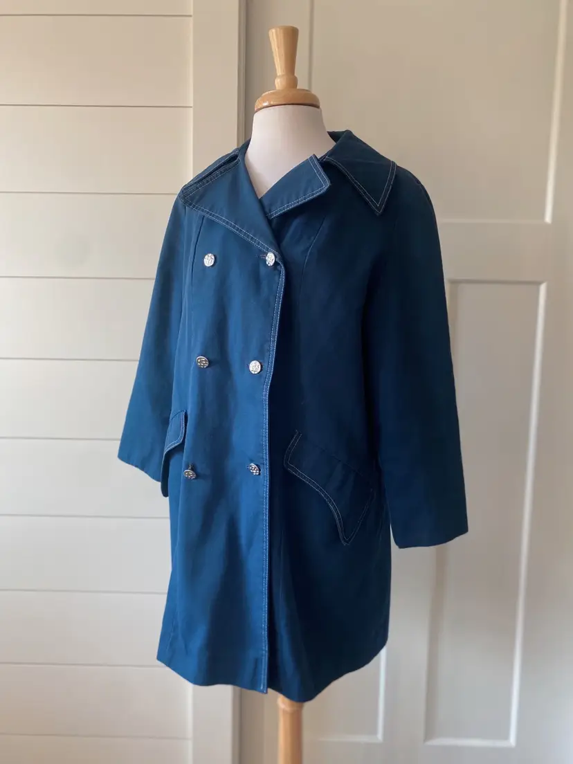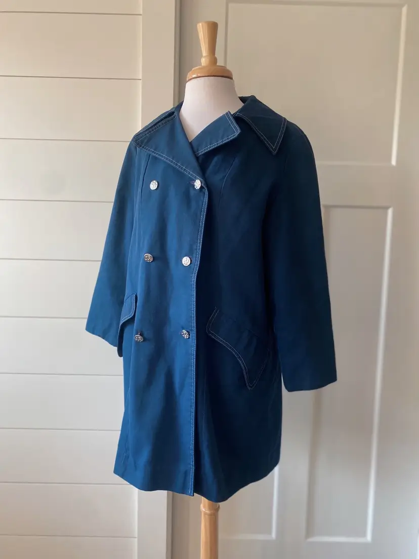 Don’t let a rainy day get you down! This sweet peacoat style jacket is a rain coat made with Wamsutta fabric. There is no other inside branding but based on some research I believe the maker to be “London Fog”.