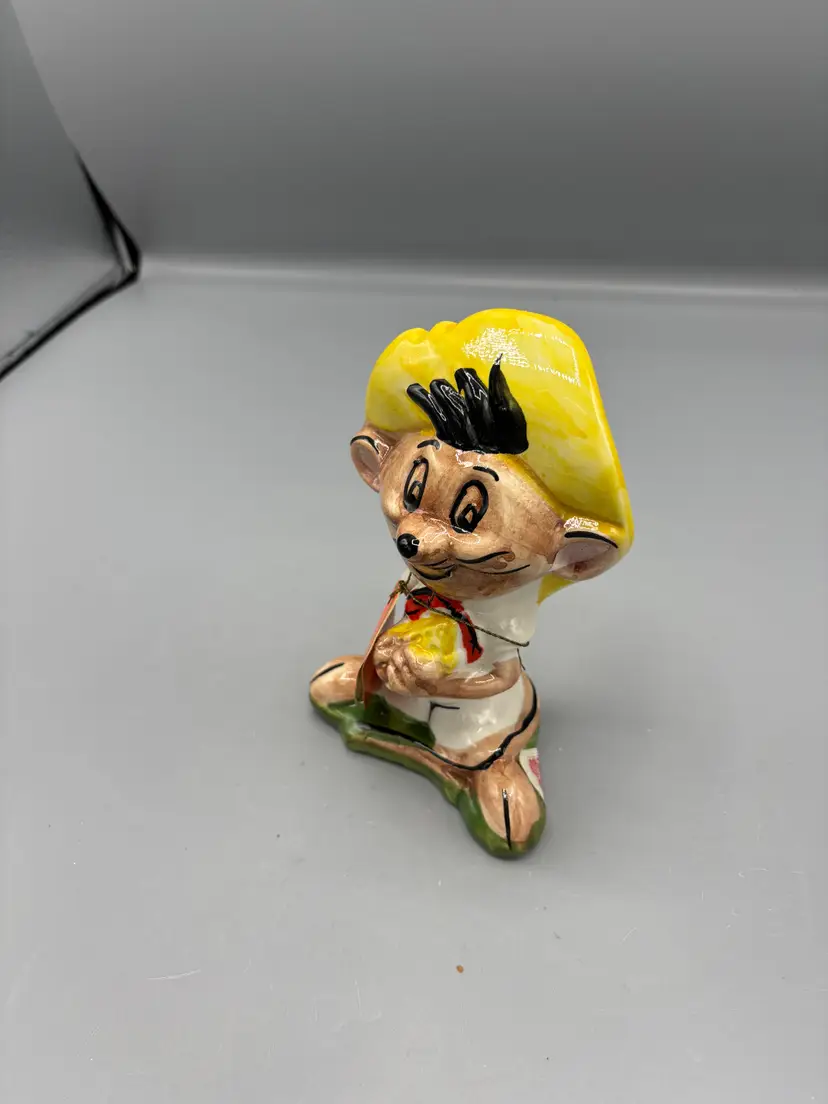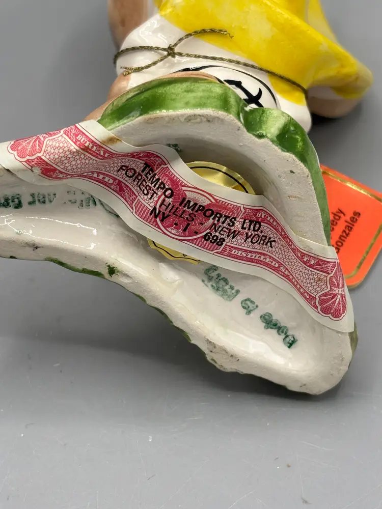 A collectible liqueur decanter featuring the iconic Speedy Gonzales character from Warner Brothers' classic Looney Tunes animation. This vintage piece combines nostalgic cartoon charm with functional barware design, measuring 6 inches tall by 4 inches wide. Perfect for displaying beloved animation memorabilia or serving spirits at themed gatherings. An excellent addition for collectors of vintage cartoon merchandise and mid-century pop culture artifacts. Decanter still factory sealed.