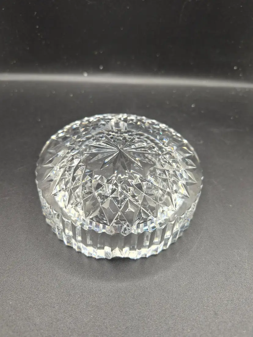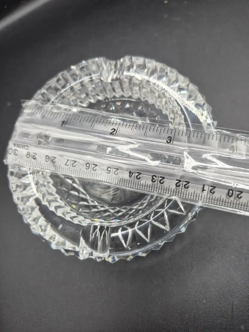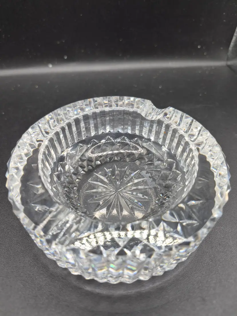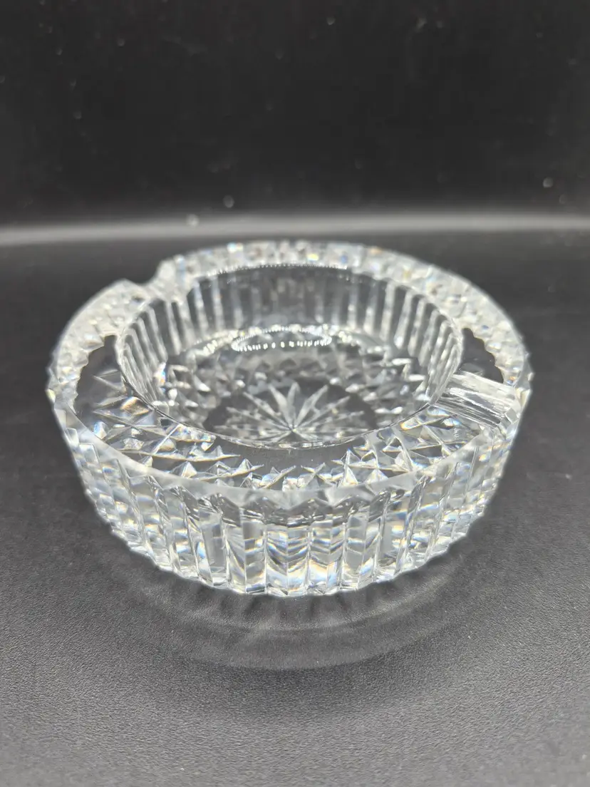 This vintage crystal ashtray exudes timeless elegance with its intricate starburst cut design. Its clear glass construction catches light beautifully, making it a statement decor piece. Compact yet eye-catching, its classic shape reflects a bygone era of sophistication and charm. A perfect vintage collectible or a thoughtful gift for admirers of fine craftsmanship.