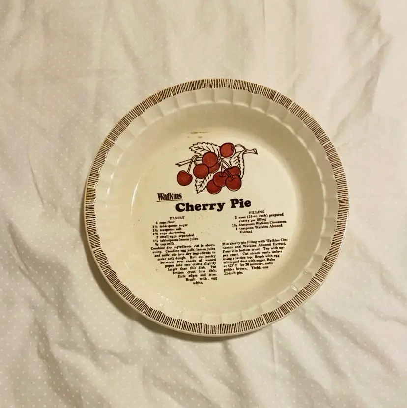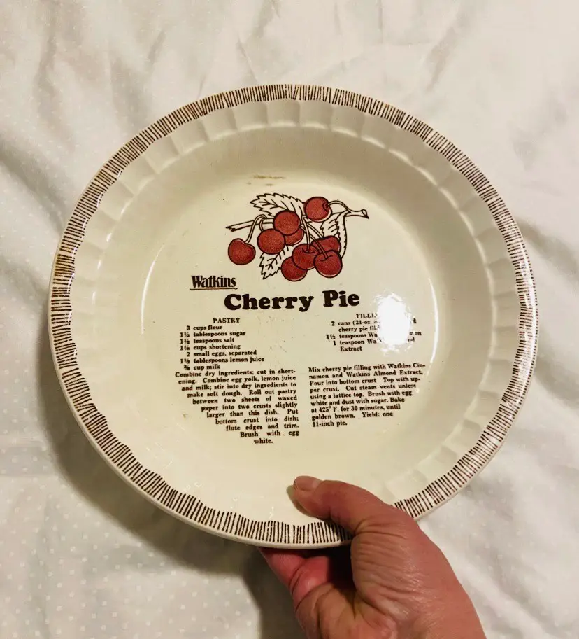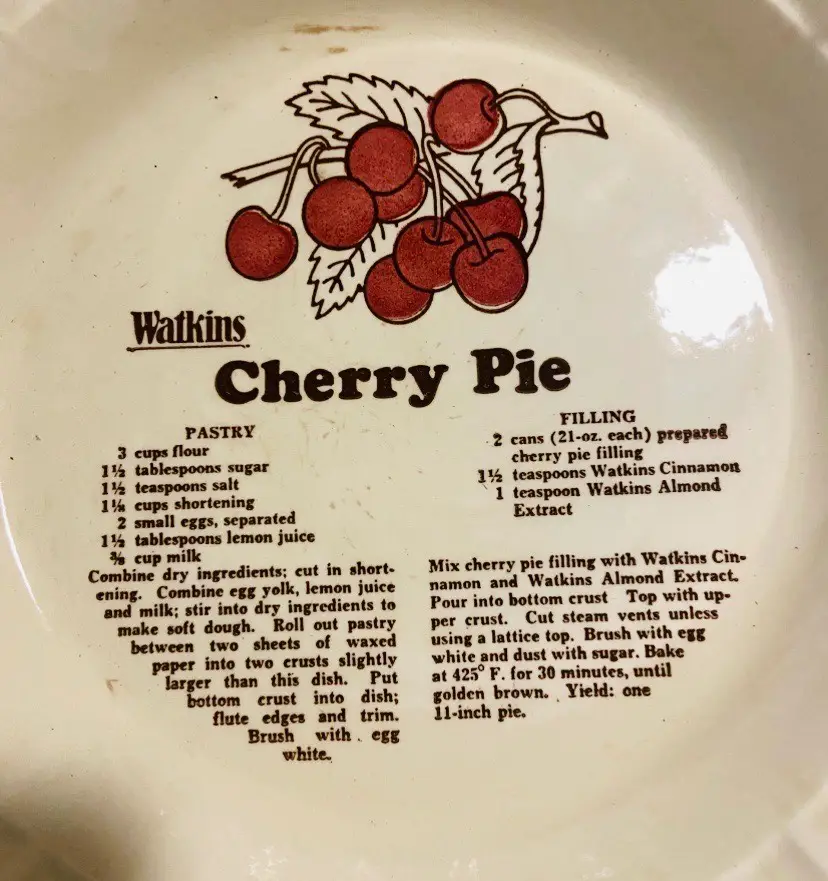 Vintage stoneware ceramic Watkins Pie dish with cherry pie recipe glazed in the deep dish inner bottom. These are collectible and a great addition to a home decor, durable solid pie dish ready to ship, safely and snugly. This version made in the USA at Winona MN. IN good used condition. No chips or cracks.