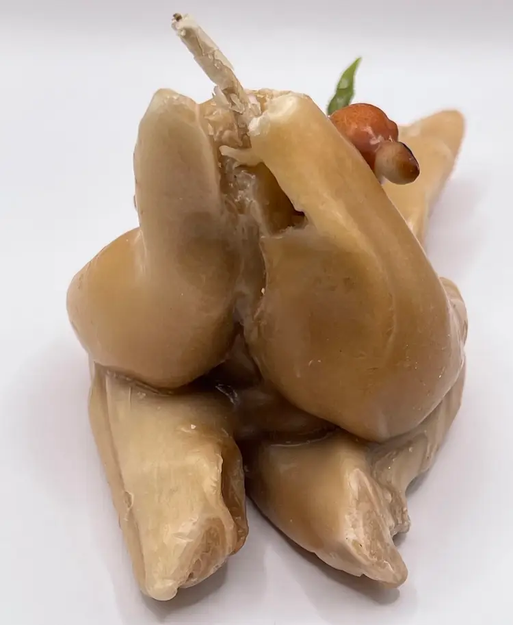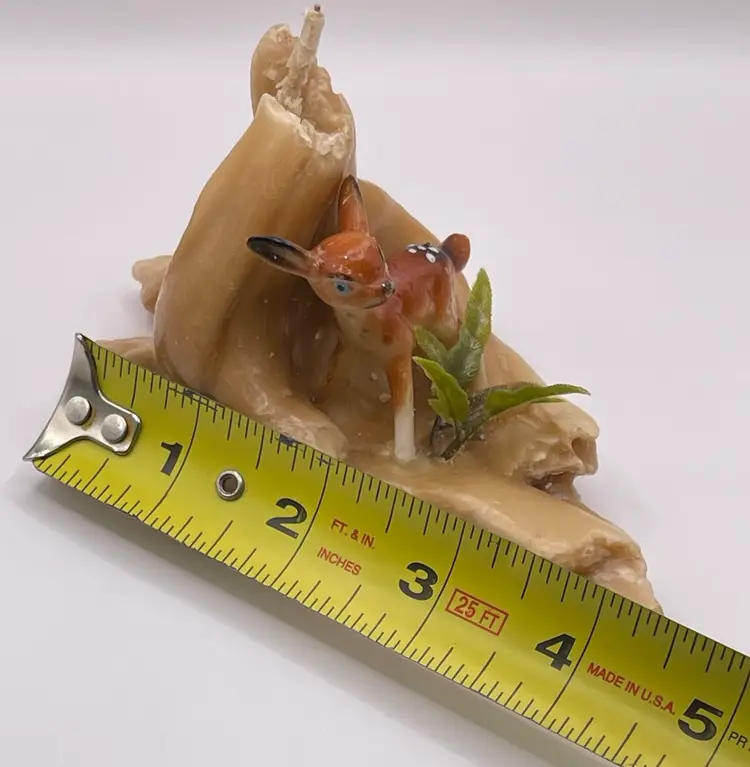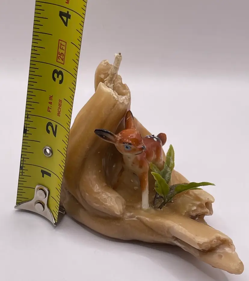 This candle is so retro! It’s made to look like driftwood and there is a little deer and what look like fern leaves attached. Those pieces are made of plastic. Do not burn! In good condition, 4 inches wide and about 3.5 inches tall.