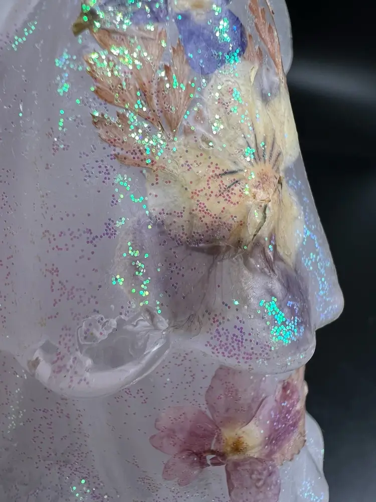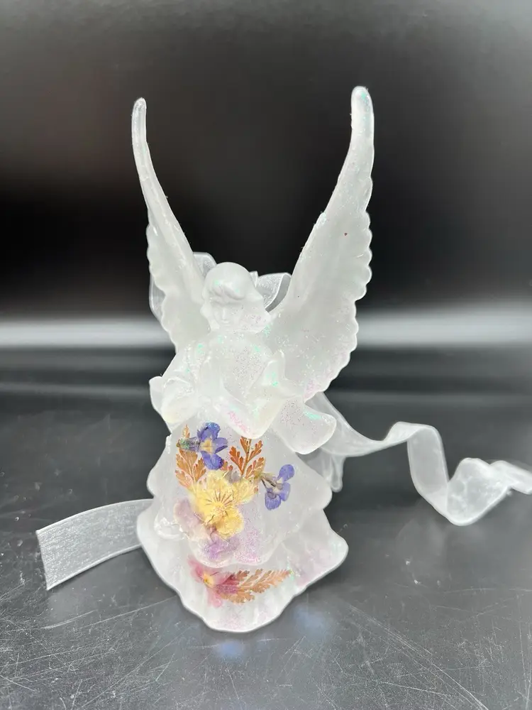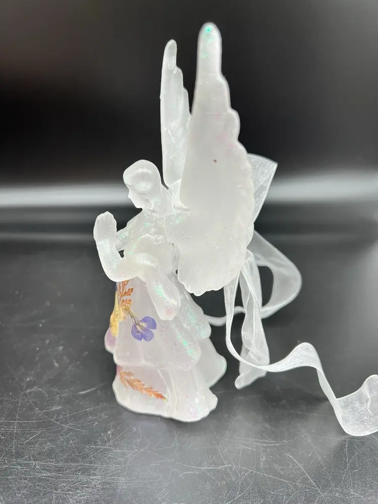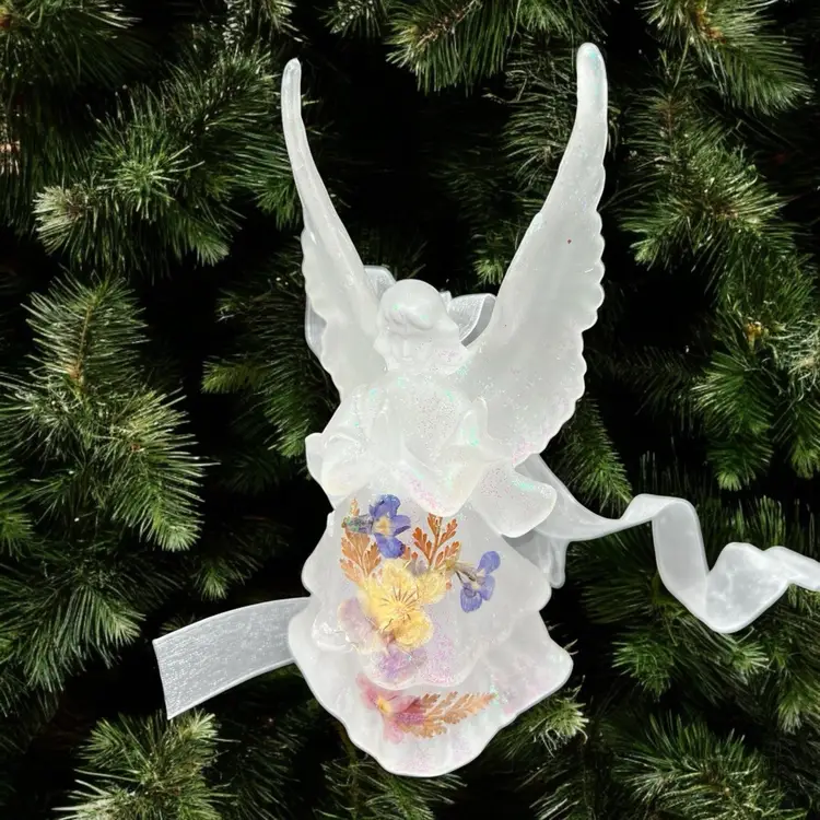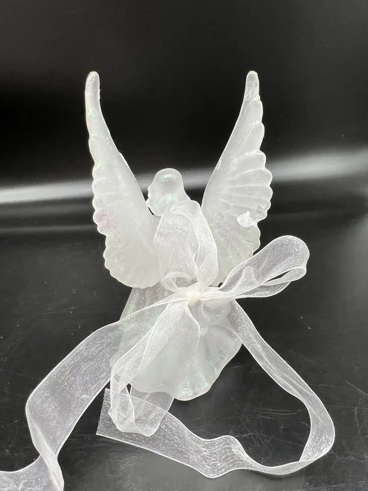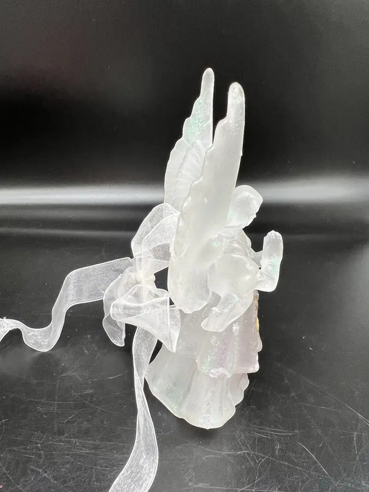 Add a touch of vintage charm to your Christmas decor with this beautiful angel ornament. The iridescent white wax material gives it a unique and elegant look that will complement any holiday theme. This angel is not just a hanging ornament, but can also stand on its own, making it a versatile addition to your festive decorations.