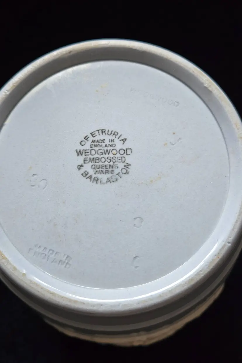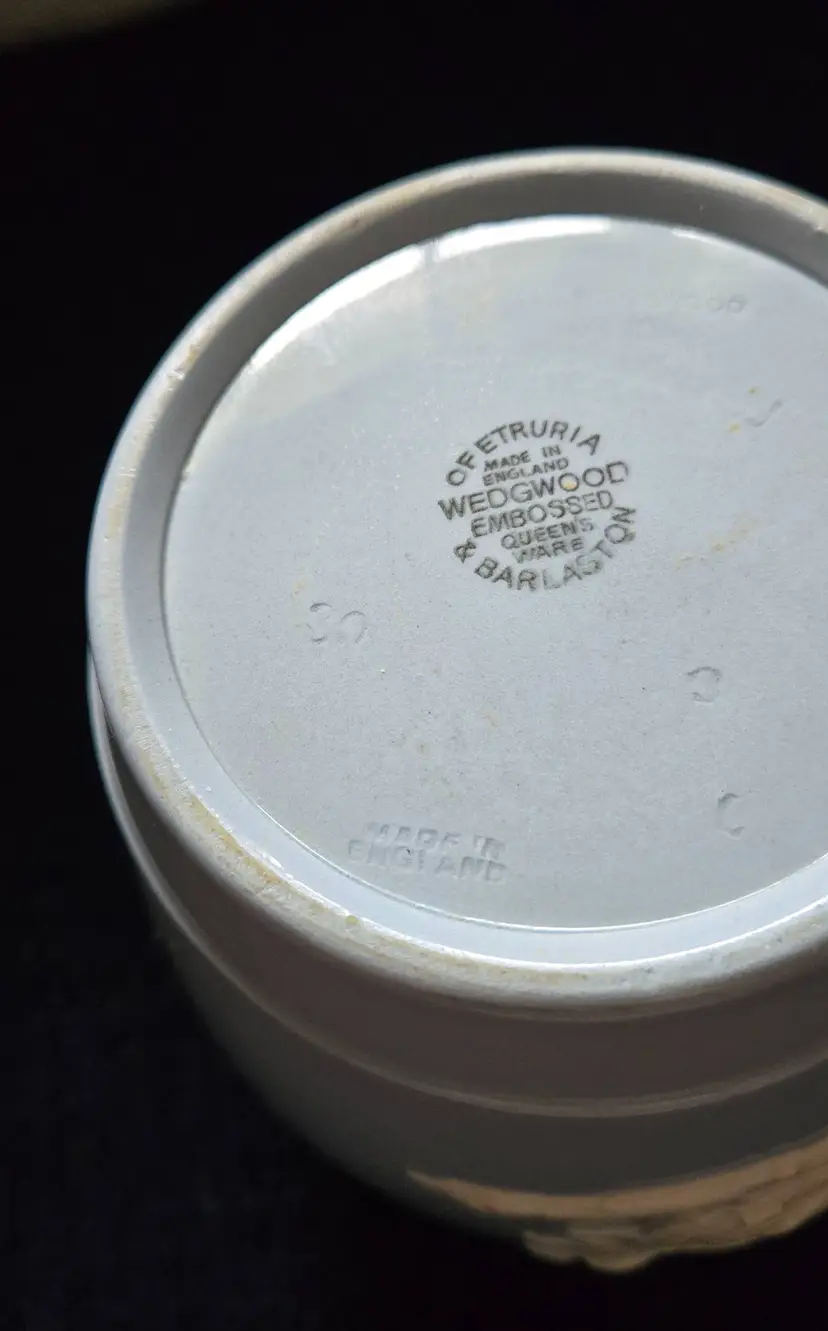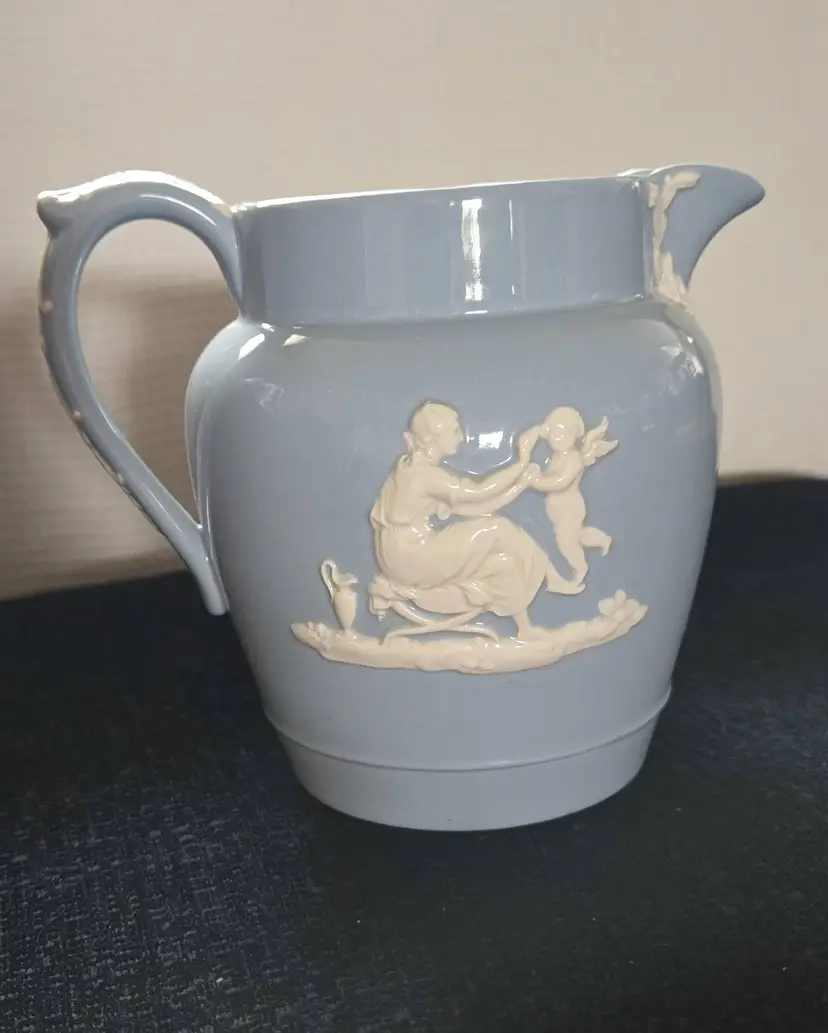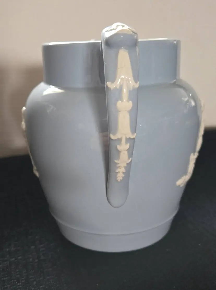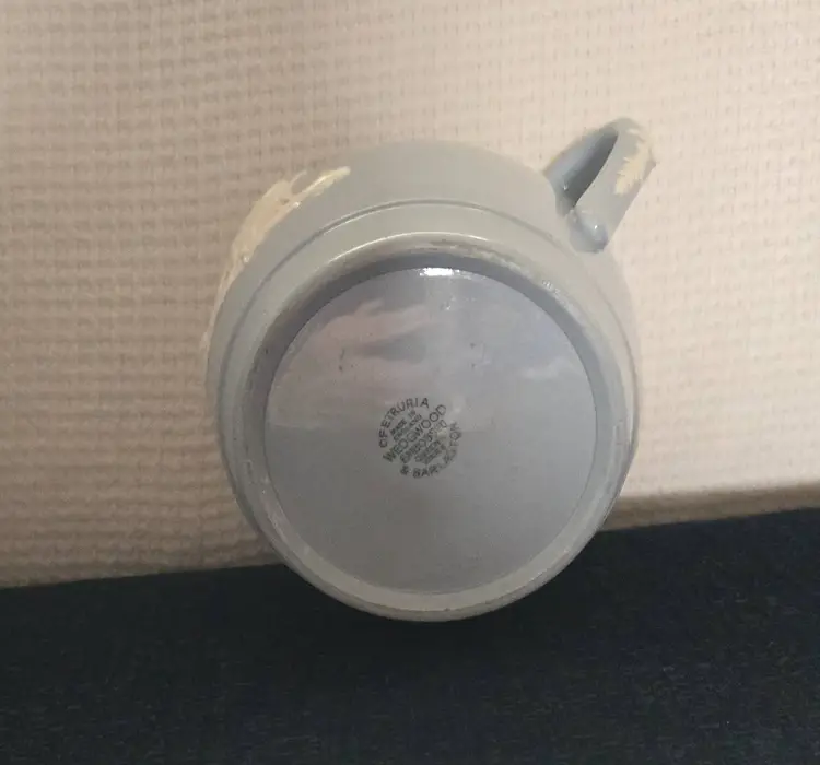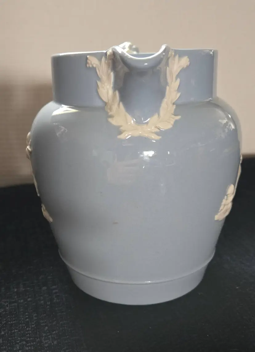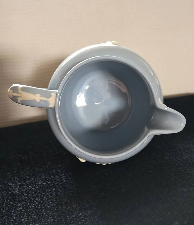 Features a woman reading. Beautiful blue with white relief. Made from a ceramic/stoneware with a clear glaze containing cobalt oxide to produce the light blue tint. Made in England from the Eturia and Barlaston factories. Measures 5 1/2" tall, 6 1/4" from spout to handle. 5" deep. Recommended hand was only. In great condition. No chips, cracks, or repairs.