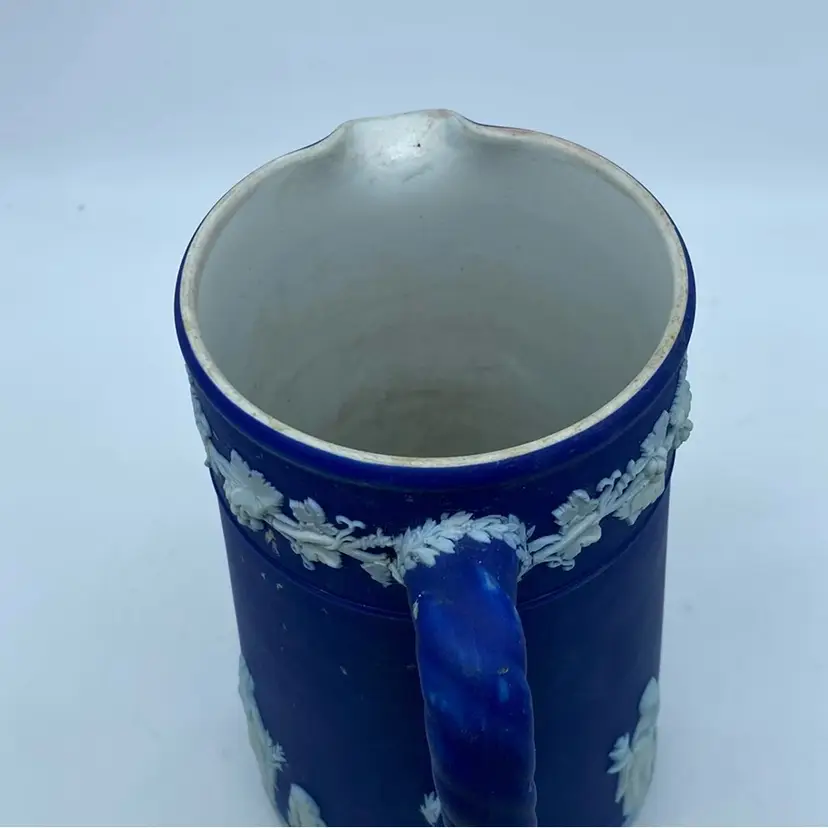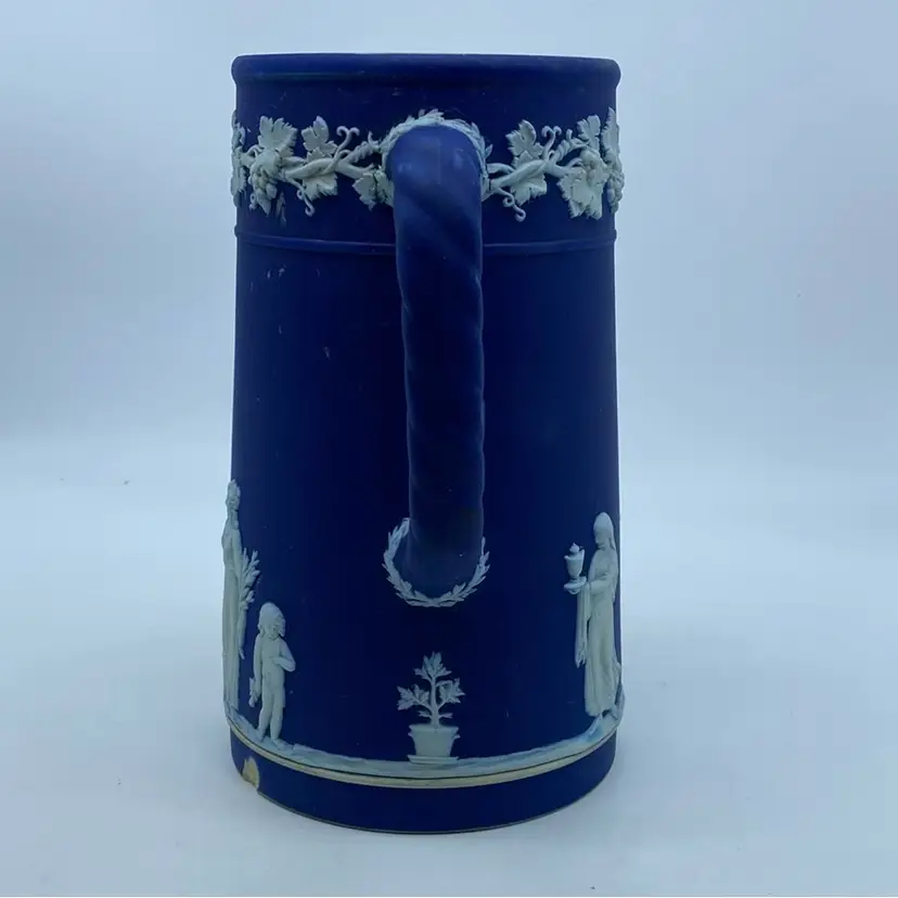 This particular pitcher likely depicts scenes inspired by classical mythology or allegorical figures, a common theme in Wedgwood's designs during the Neoclassical period. The grape vine and floral motifs further enhance its decorative appeal, making it a quintessential example of 19th-century British ceramic artistry.