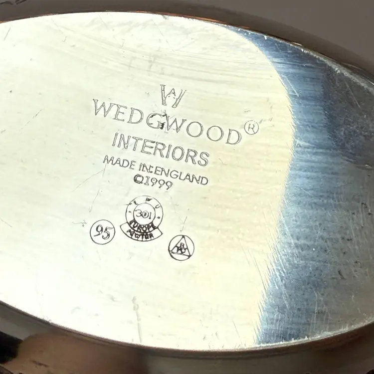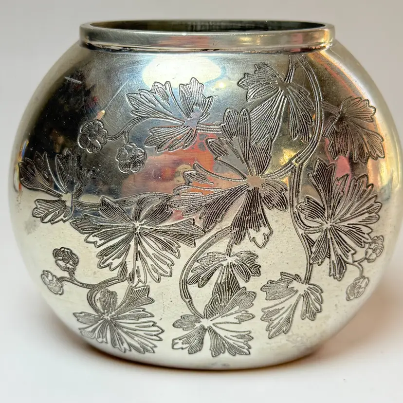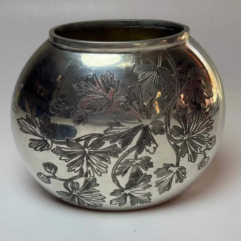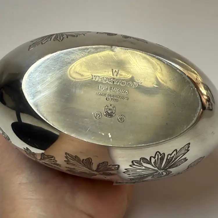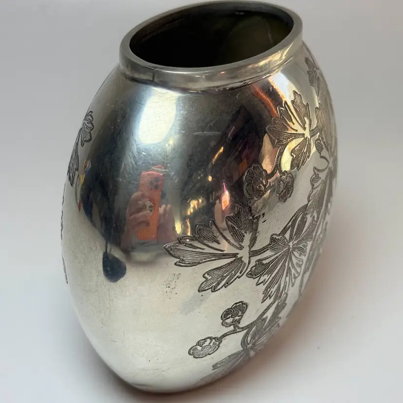 Vintage Wedgwood Interiors Pewter Oval Vase Etched Floral Vines Leaves Made in England. 4.5" tall x 5" across x 2" wide. Hallmarked on the bottom. Good condition with some light surface wear. 1999. Design on both sides.