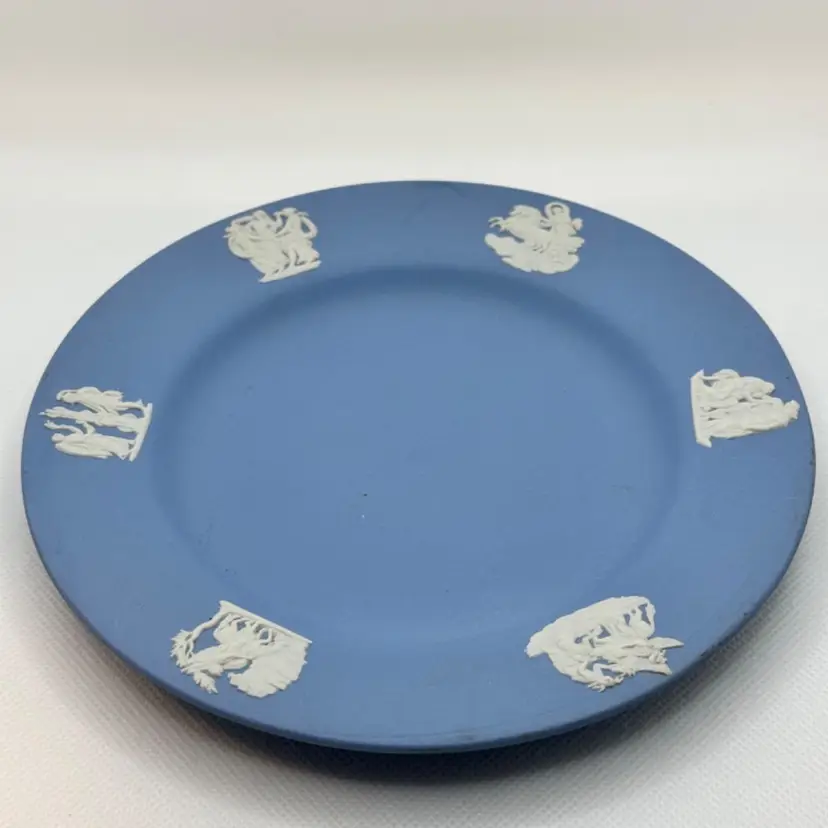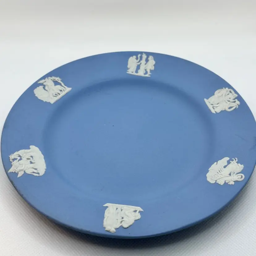 Vintage Wedgwood Jasperware matte blue neoclassical plate, vanity trinket dish, handcrafted by Wedgwood, made in England. Has trademarks stamped on it (see pics). Very pretty and ornate. No chips or cracks. Measures 6.5x1.6.5. Weighs 10oz.