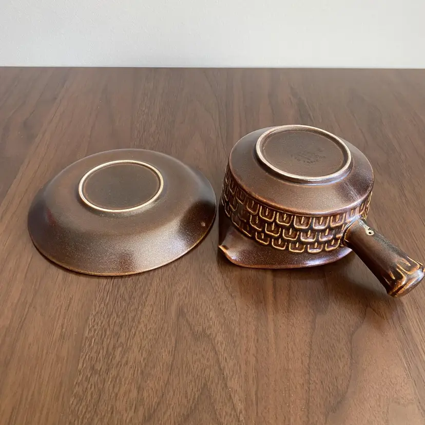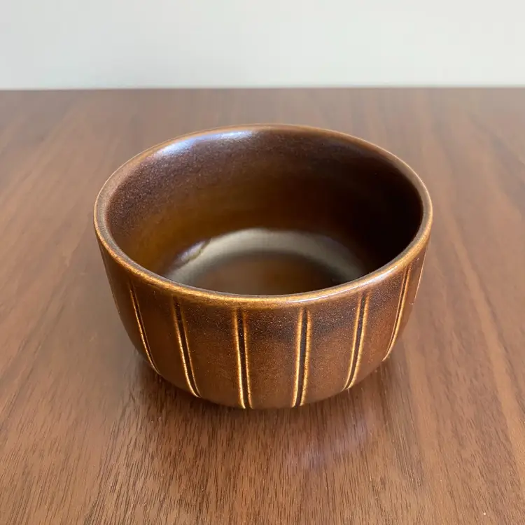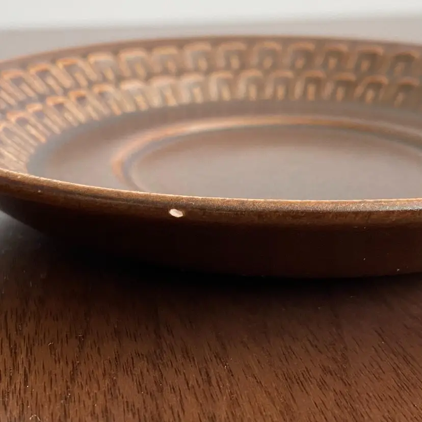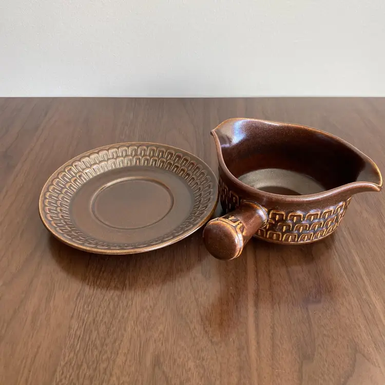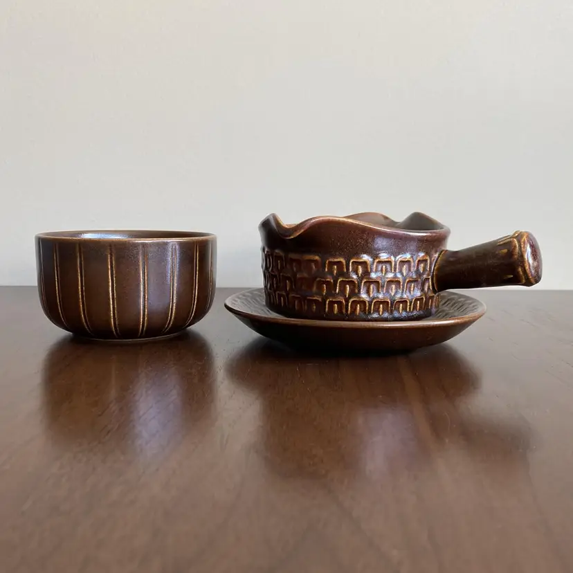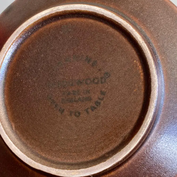 Rich brown color Wedgwood England trio includes gravy boat, saucer plate, and small bowl. Produced between 1965-1971. Gravy Boat– About 2.75 inches tall. 5.75 by 6.5 inches wide. Some clay discoloration on bottom handle. Saucer Plate- 6.25 inches wide. Small chip on edge. Bowl- 2.25 inches tall by 4.25 inches wide.
