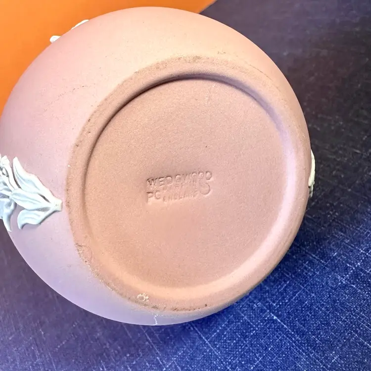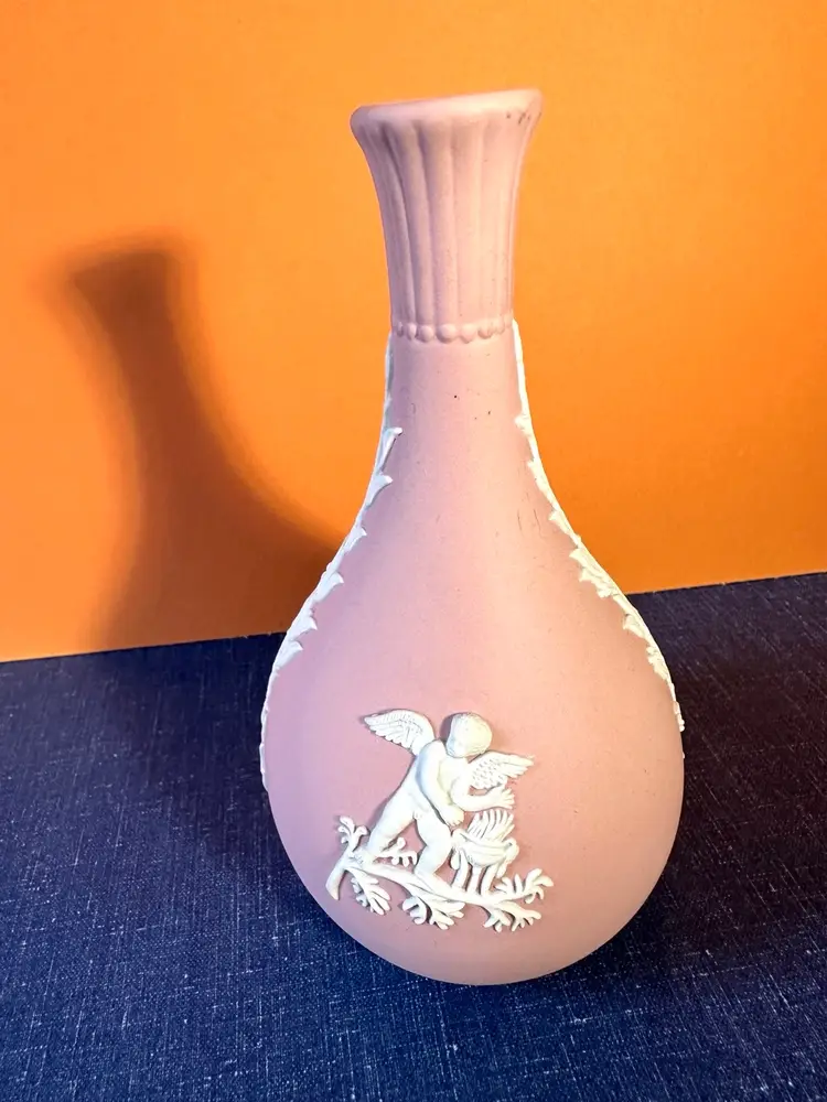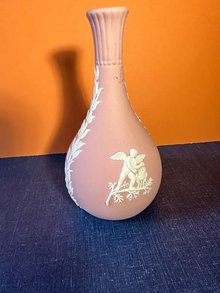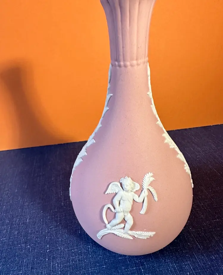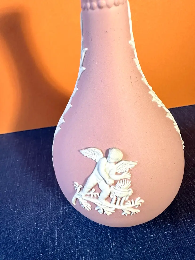 Cherub on back and another on front making offerings for two seasons and white garlands down the sides. No issues noted. Color is flesh pink. Stamped in bottom. 5” tall