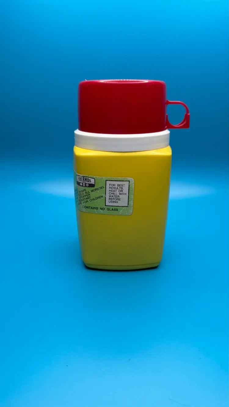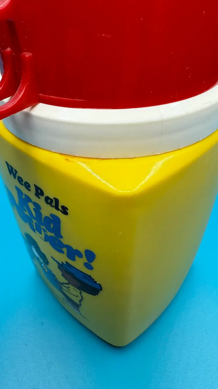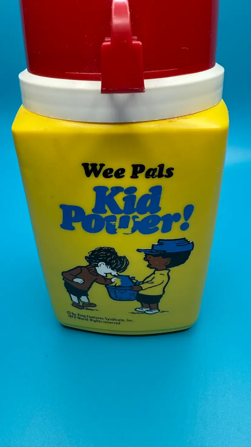 Vintage Wee Pals Kid Power! Plastic Thermos 1973 Complete. Some of the lettering has worn off, there is some minor staining from use. Has original Thermos label on the outside. Still in really good condition for its age. Please see photos for condition.