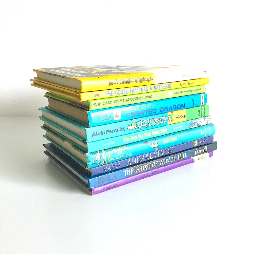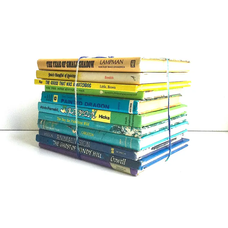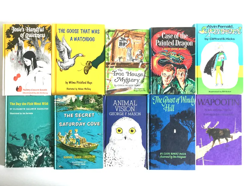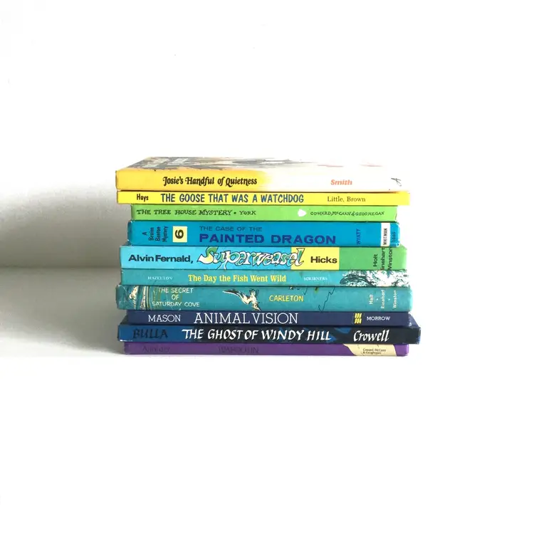 -stack measures approx. 5 1/4" high by 8 3/4" long by 6 1/8" wide -books date from the 1960s-70s -good/very good vintage condition; one book is an ex-library copy with some stamps or markings -titles include: The Year of Small Shadow (Lampman) Josie's Handful of Quietness (Smith/Forberg) The Goose that was a Watchdog (Hays/McClary) The Tree House Mystery (York/Lonette) The Case of the Painted Dragon: A Brains Benton Mystery (Wyatt/Greene) Alvin Fernald, Superweasel (Hicks/Sokol) The Day the Fish Went Wild (Hazelton/Servello) The Secret of Saturday Cove (Carleton/Geer) Animal Vision (George F. Mason) The Ghost of Windy Hill (Bulla/Bolognese) Wapootin (Annixter/Schoenherr)