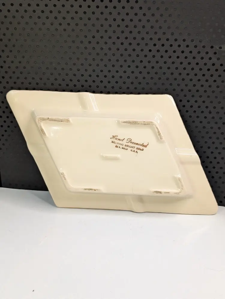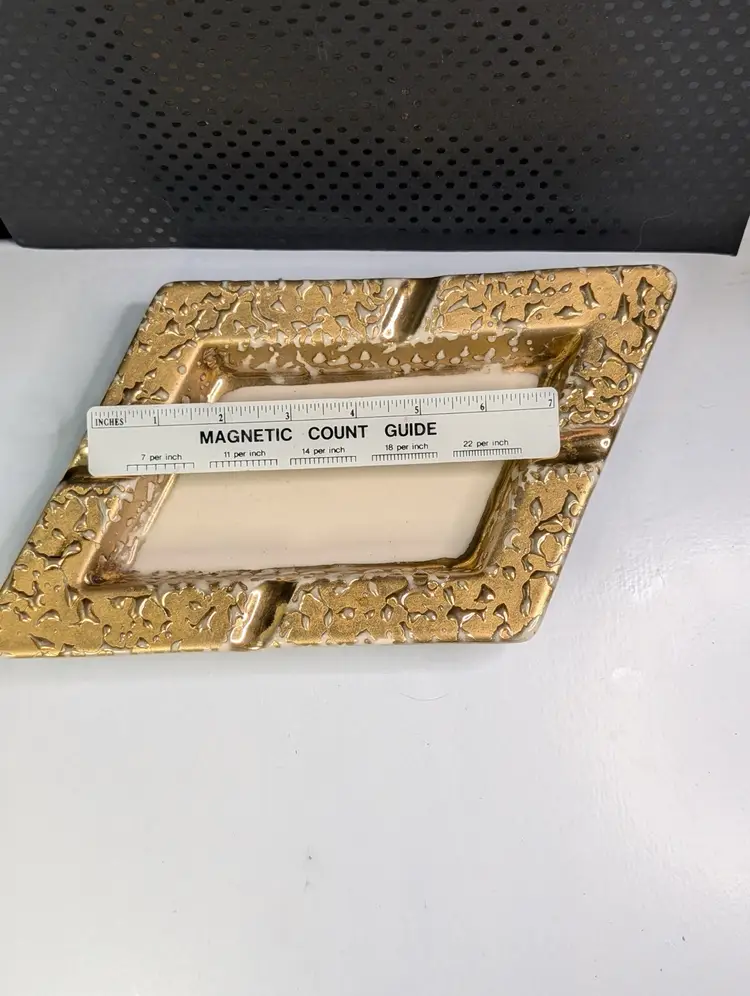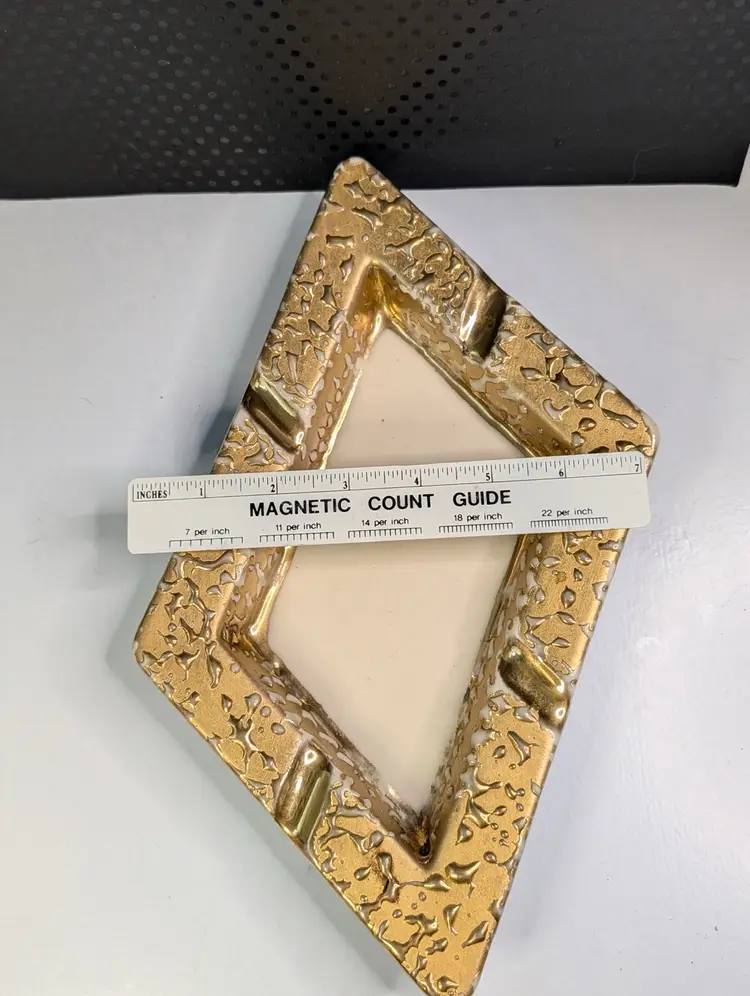 This vintage ashtray is a unique addition to any collection. Its gold and white design features a weeping diamond/parallelogram shape that adds a touch of elegance to any room. Perfect for smoking enthusiasts or collectors, this ashtray is made for those who appreciate the finer things in life. Crafted with high-quality materials, it is durable and long-lasting.