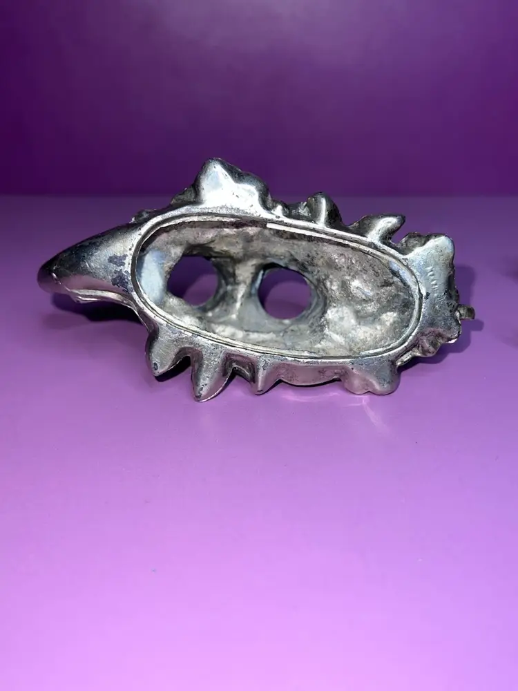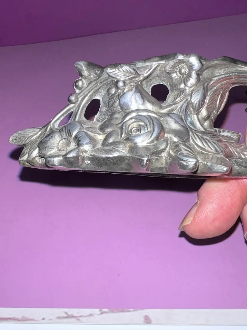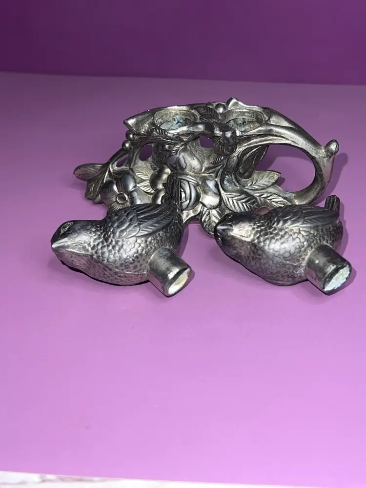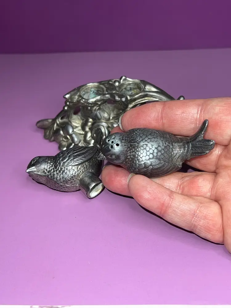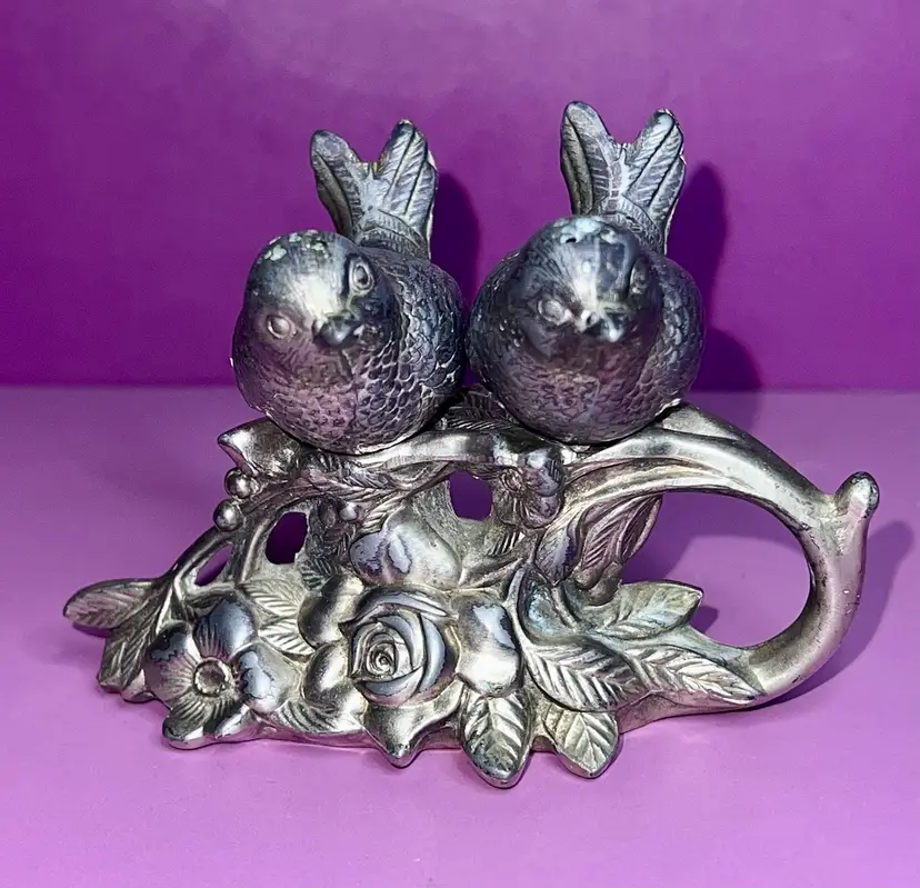 Art nouveau style salt and pepper shakers. Handle for ease passing around the table. Wear on high spots