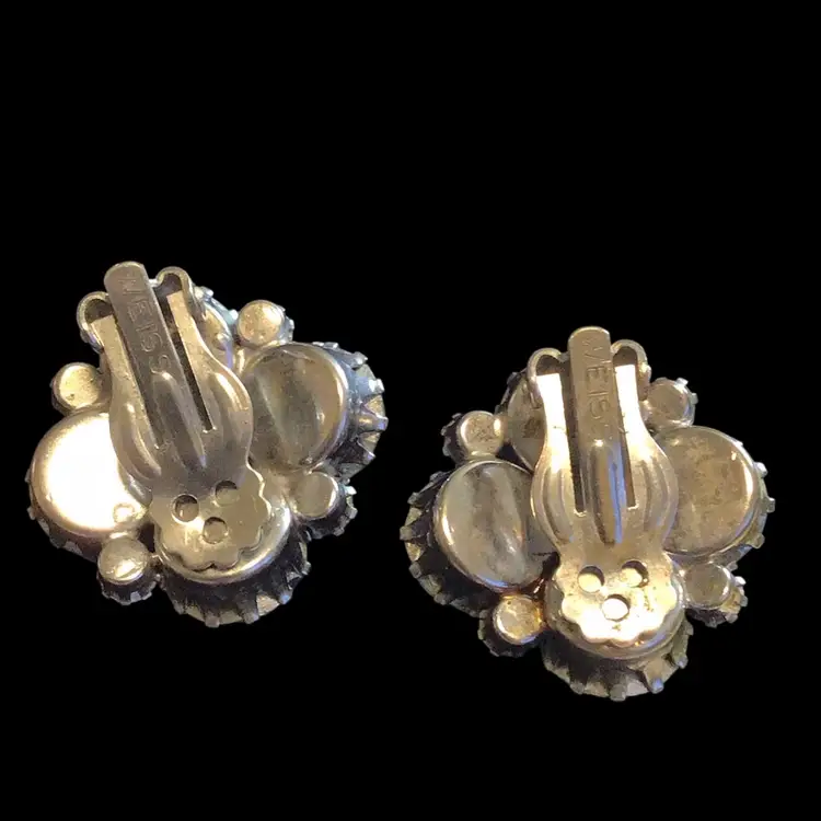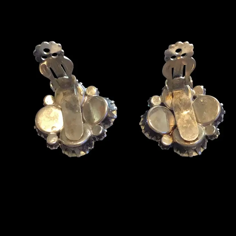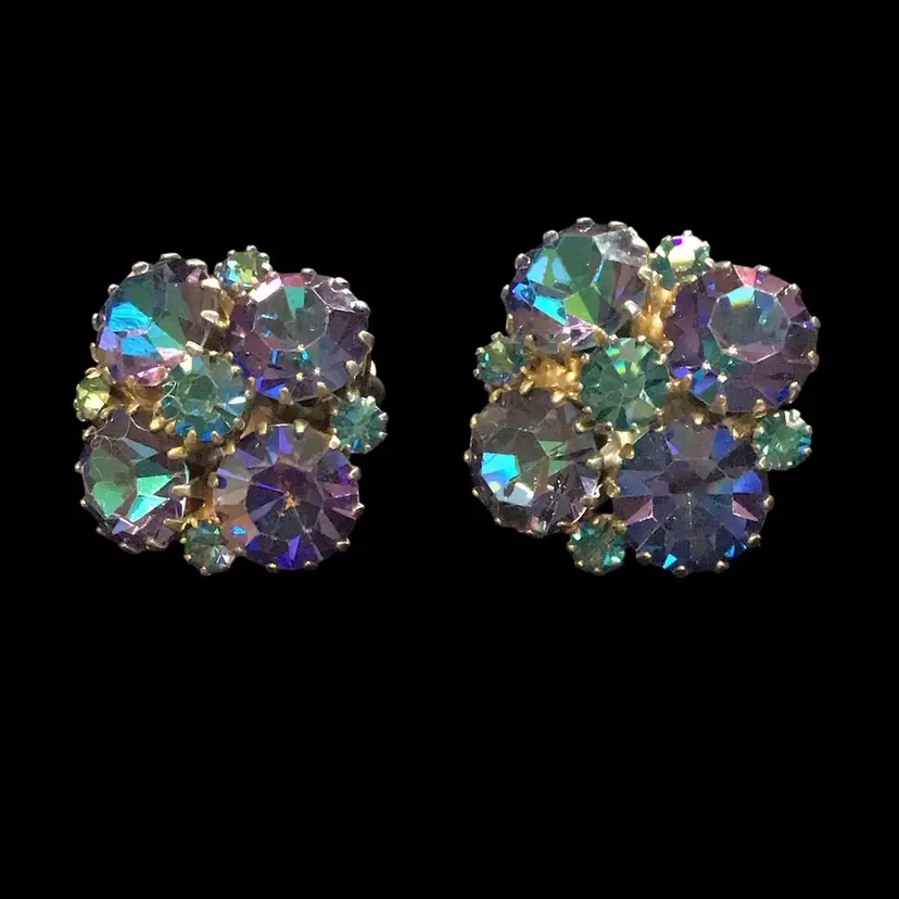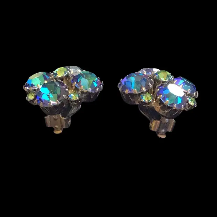 Blue, purple, green Aurora Borealis stones in cupcake prong settings. Stunning earrings in great condition. 1950s. #030