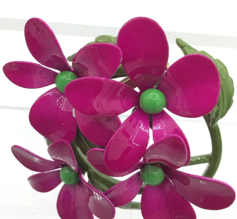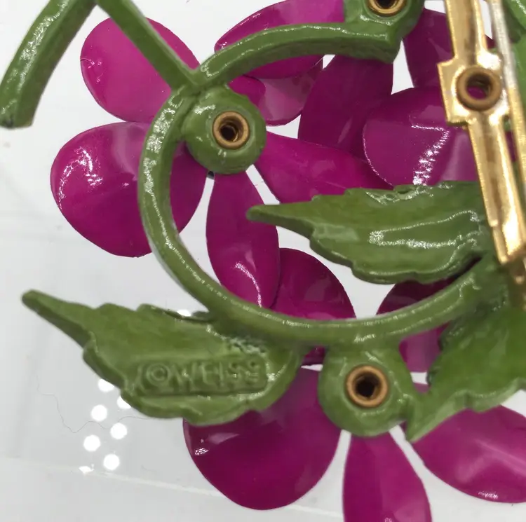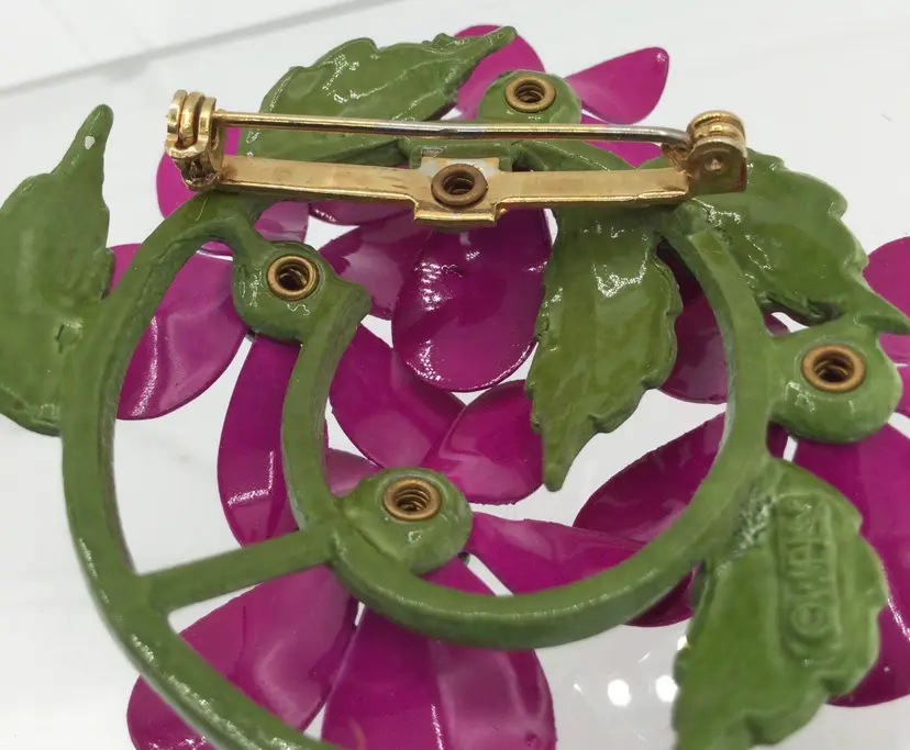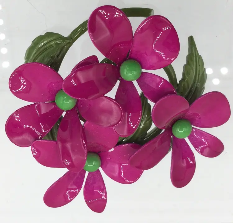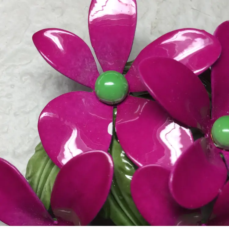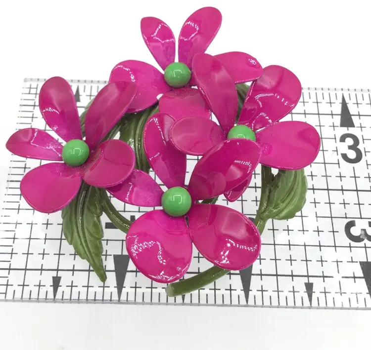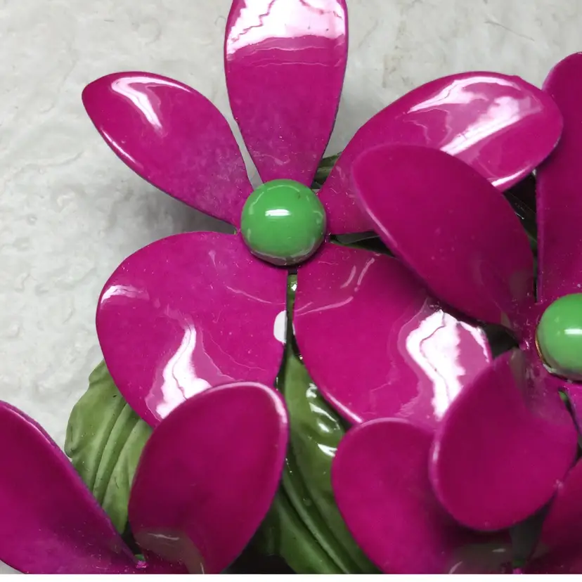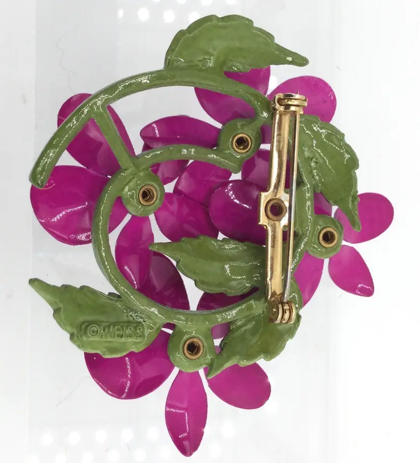2 1/2”W x 2 1/2”H Rich magenta and green enamel on metal brooch. Four flowers with five petals each. One petal on the top flower has an edge paint chip as well as the underside edge of the adjacent petal. The petals may have been attached when made. Please see last image. The pin on the back has a slight bend but closes securely. Overall beautiful glossy finish, a nice piece in a fun color. Signed Weiss on the back.