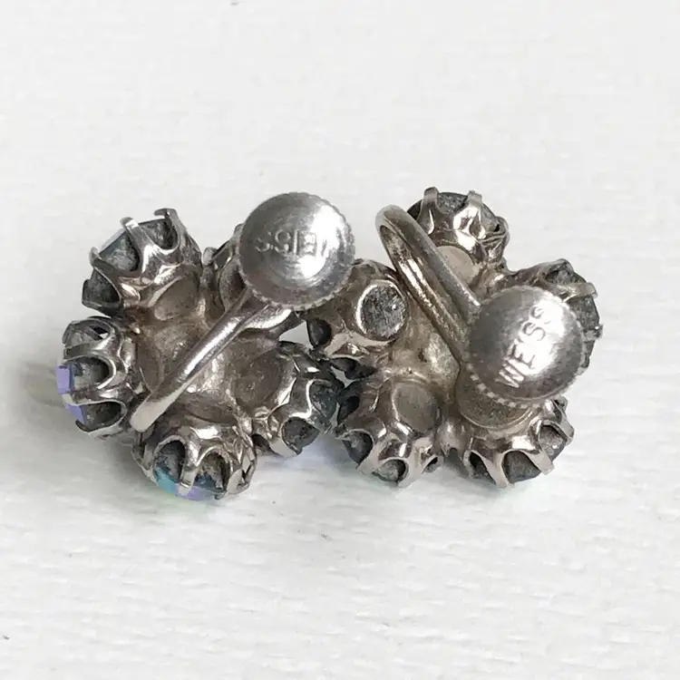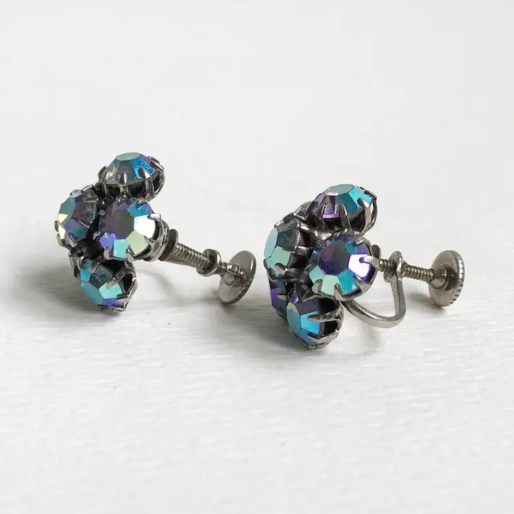 Weiss silver tone screw back earrings with prong set aurora borealis blue glass stone.