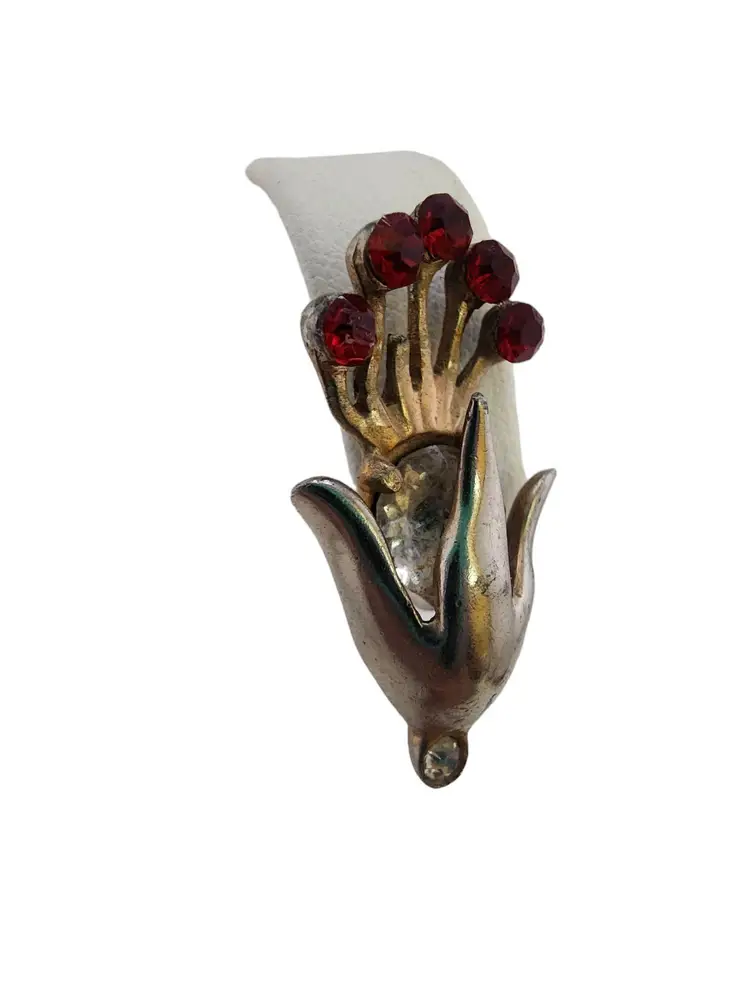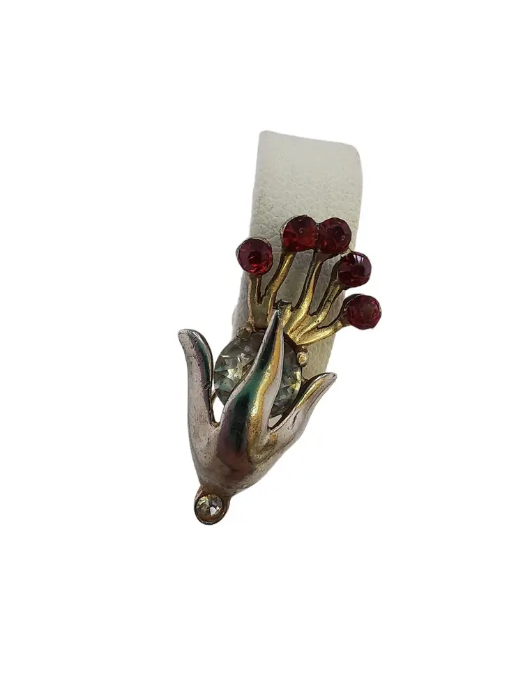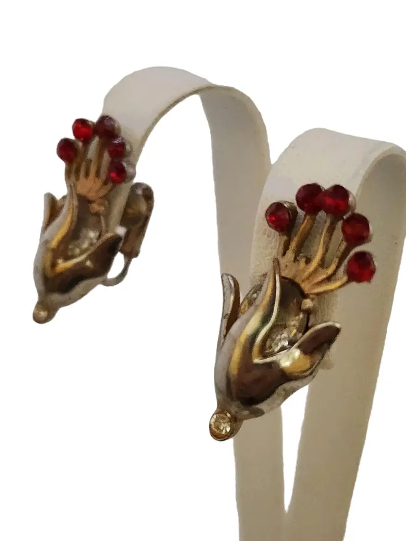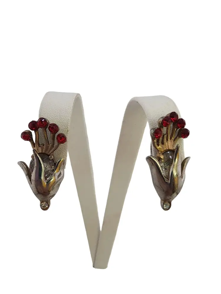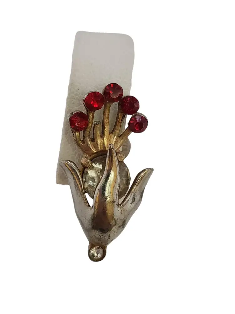 Size: 1.25" Color: Gold, Red, Silver Condition: Good vintage; some wear to plating. Signed: None Details: Nice early ones