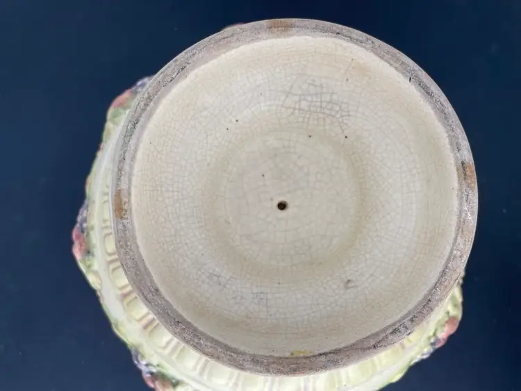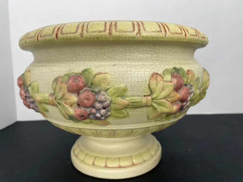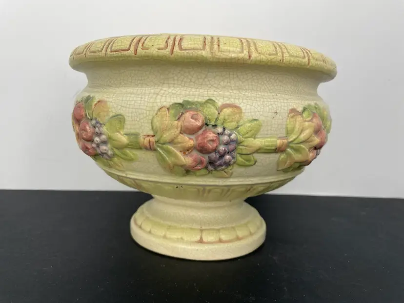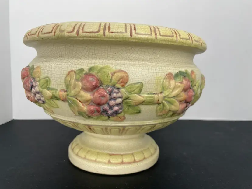 This vintage Weller pottery piece is a beautiful addition to any collection. The Roma fruit jardiniere pedestal planter is made of ceramic with a matte finish and features a round shape. The off white color and fruit subject make it a charming piece for any home decor. Measuring at 5.5 inches in height and 7 1/2 inches in width, this jardiniere is perfect for displaying your favorite plants in style. Made in the United States in the early 20th century, this art pottery piece has a unique production technique and is in excellent condition.