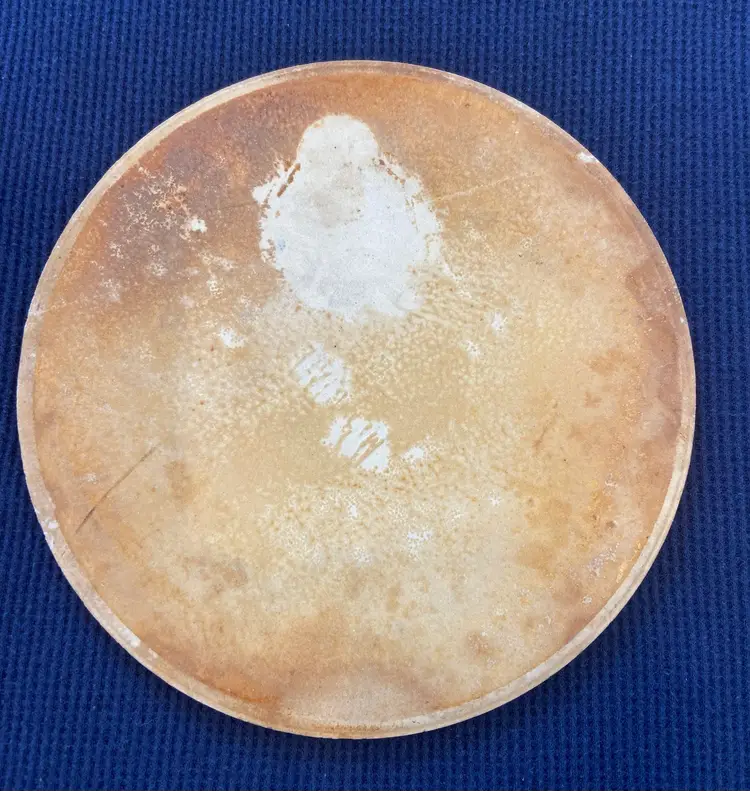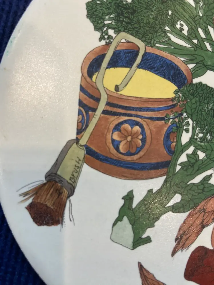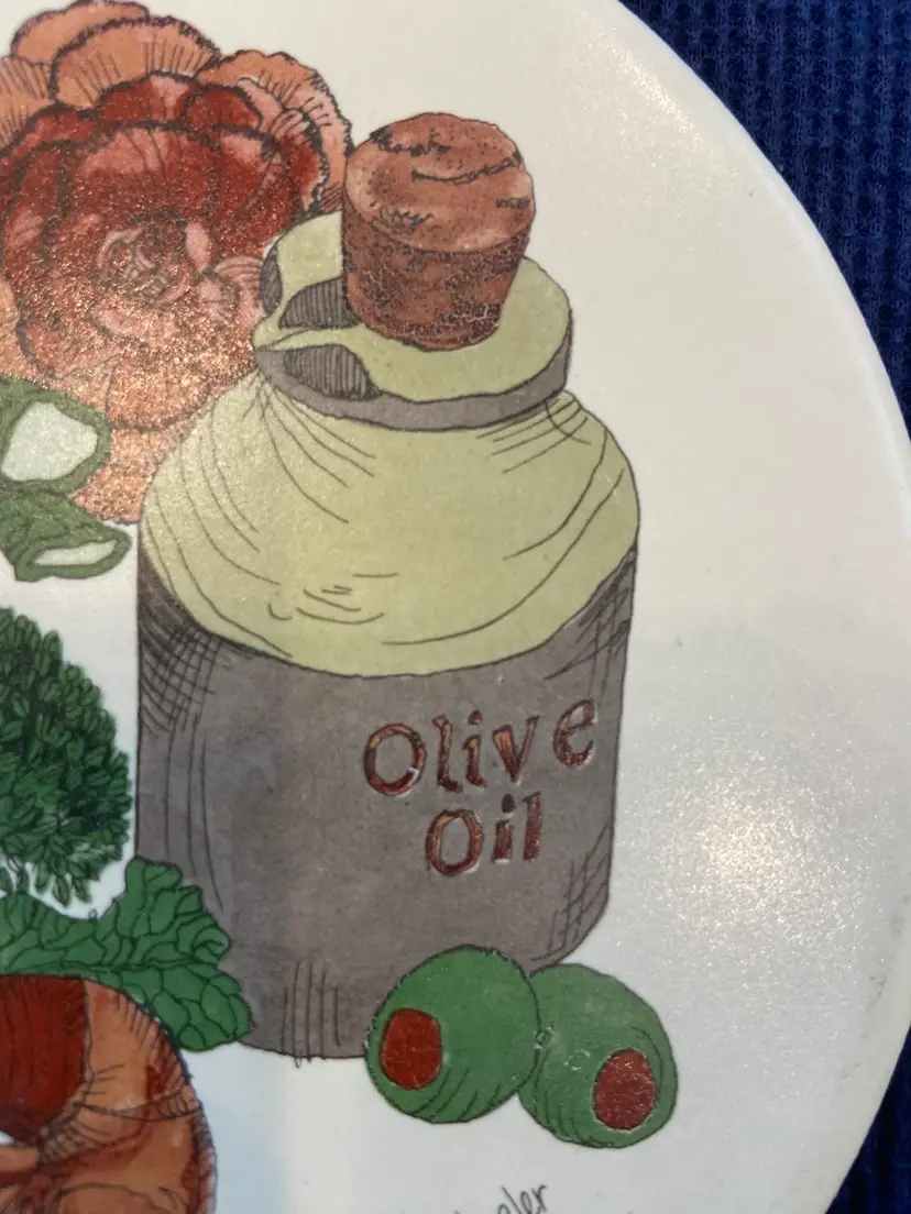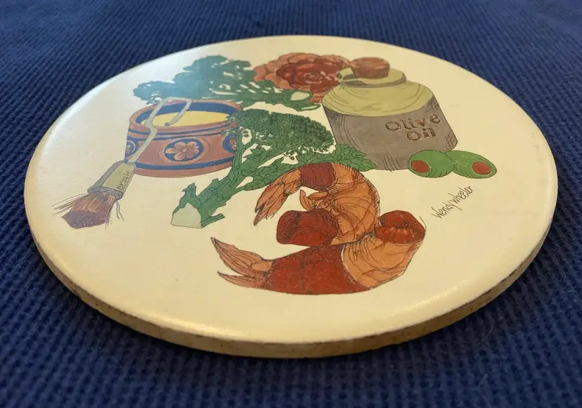 Vintage Wendy Wheeler design trivet, from Hyalyn Pottery. Front shows vegetables, olive oil, butter and shrimp. Back shows age and discoloration from heat, no chips or cracks. Pretty little trivet for your kitchen decor!