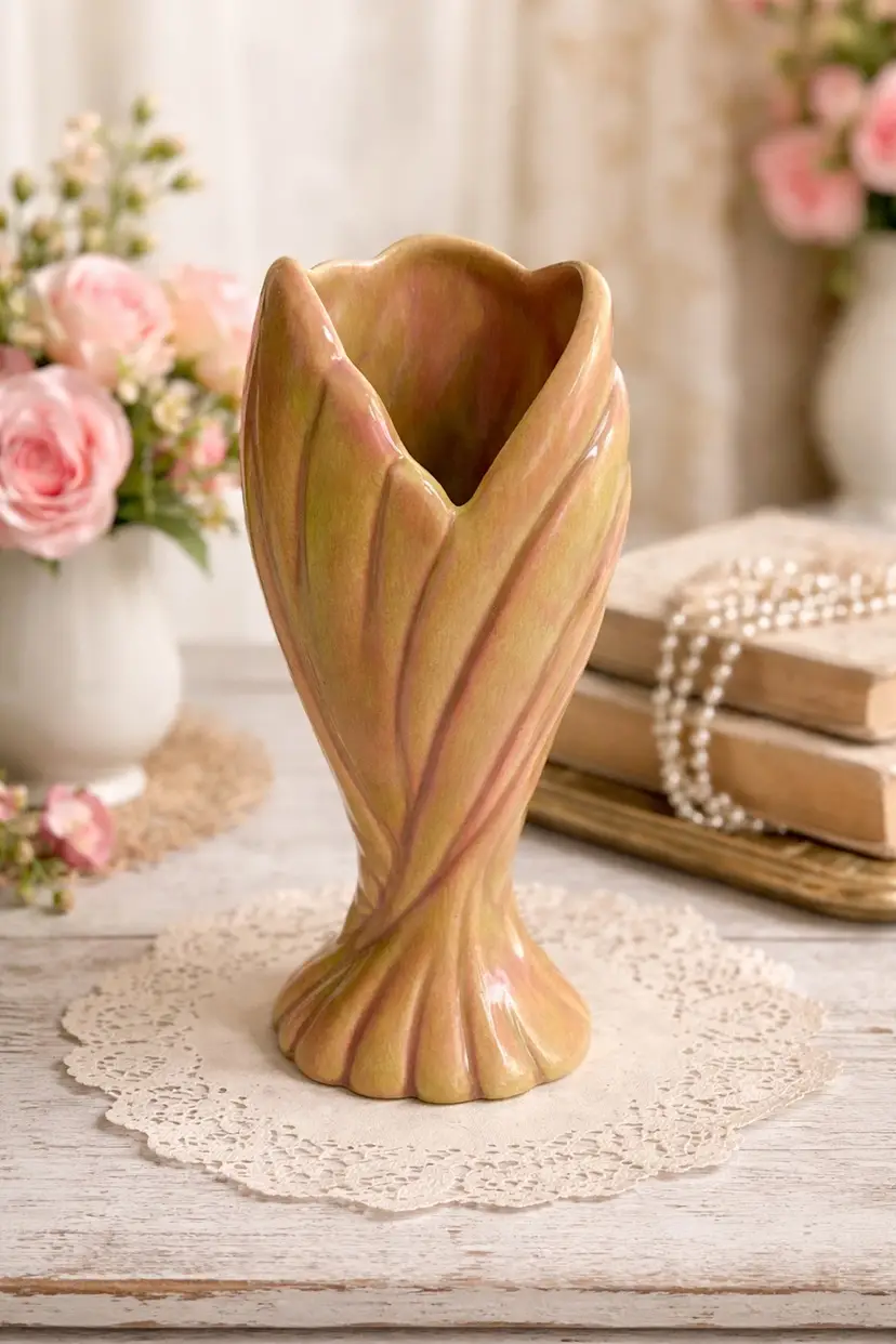 his vintage West Coast Pottery vase stands at 9 inches tall and features a beautiful green and pink glaze, typical of Art Nouveau and Art Deco styles. The all-over pattern and abstract art subject make it a unique and artistic piece for any home decor. Made of ceramic with a glossy finish, this vase bears the brand of West Coast Pottery USA, showcasing the craftsmanship and style of pottery production in California during the mid-20th century. It is a true representation of the art pottery movement in the United States.