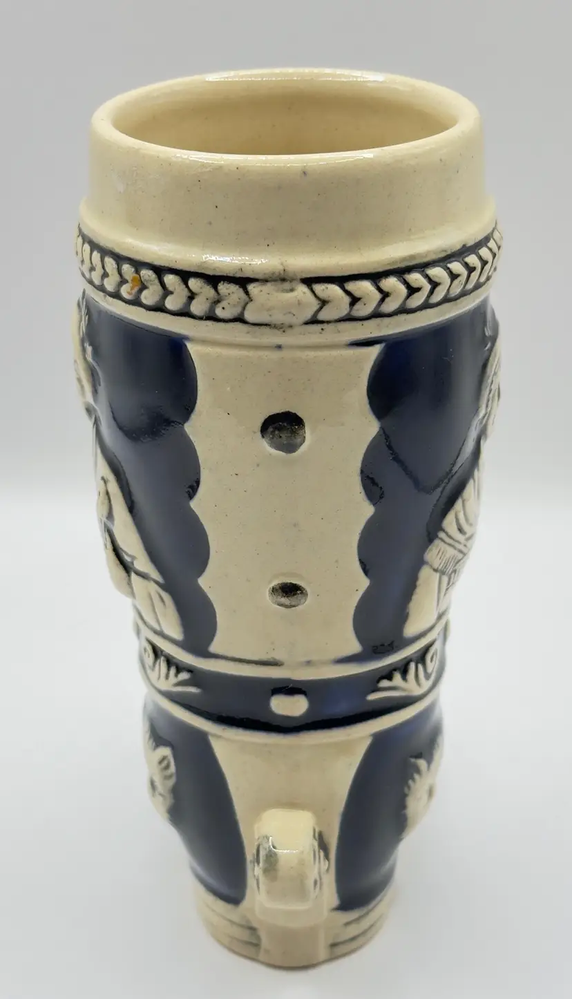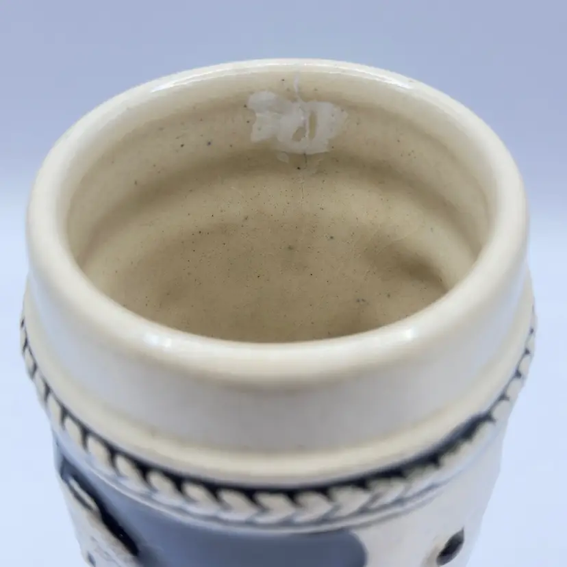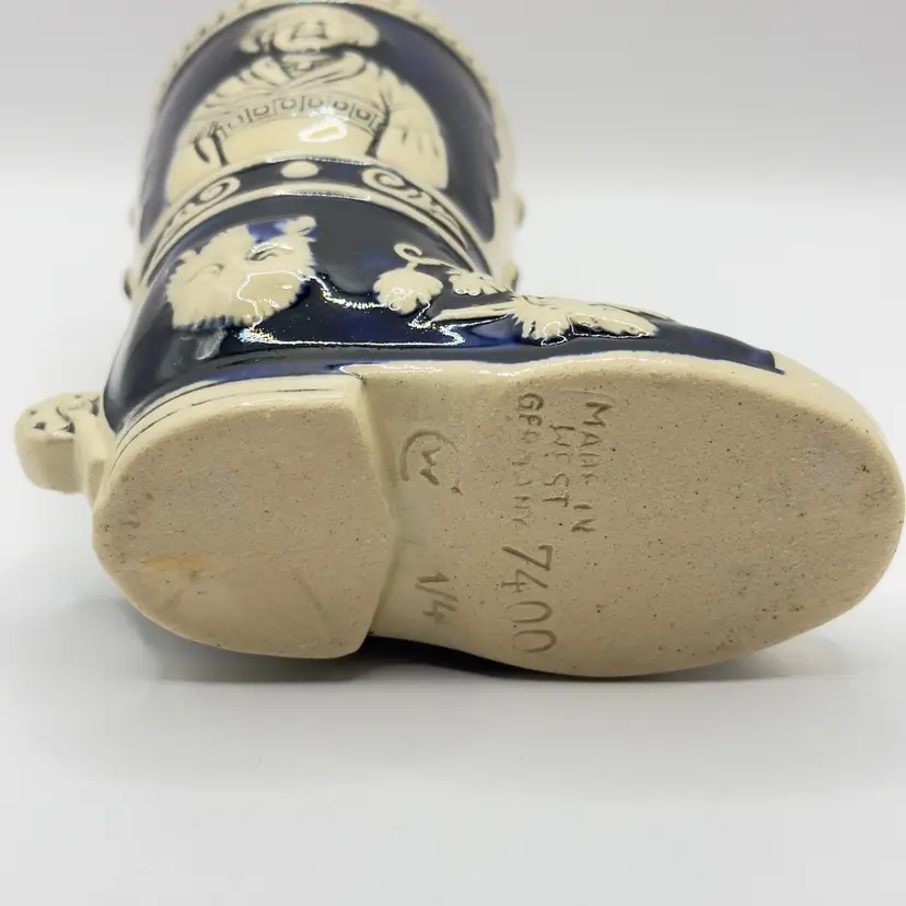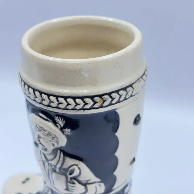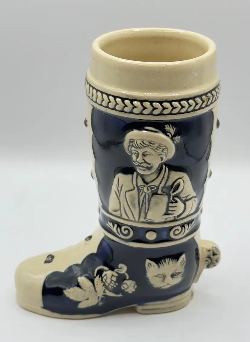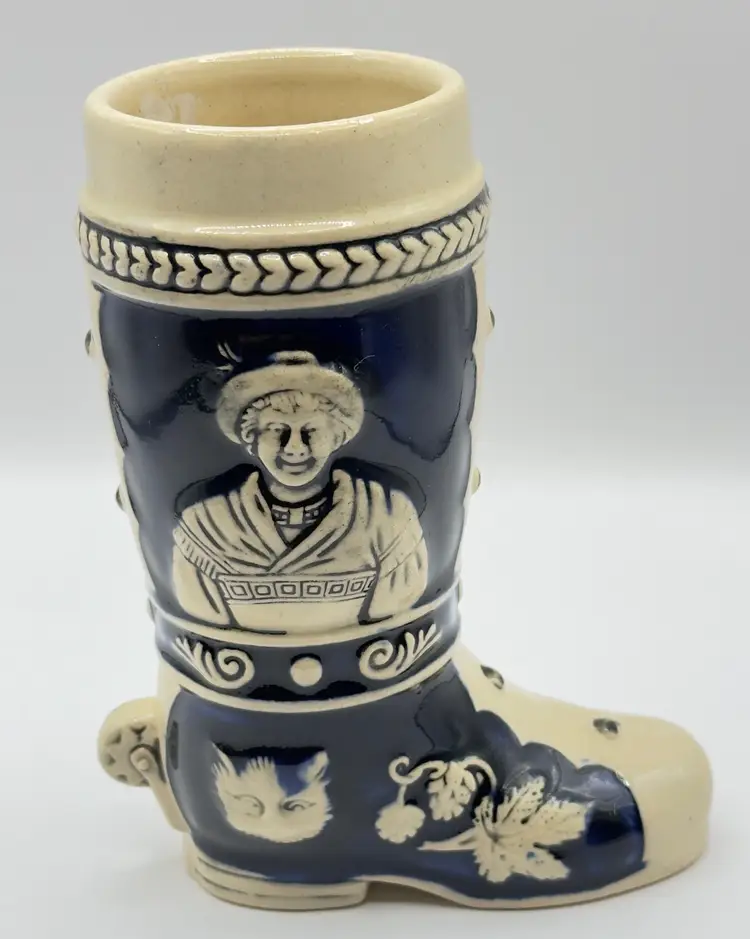 This unique vintage German beer stein is crafted in the shape of a boot, featuring a charming blue and beige folk art design. Perfect for collectors or as a quirky addition to your barware collection. Excellent condition with no chips, one repaired crack (see pics). Measures 4.5x6 inches. Weighs 1lb.