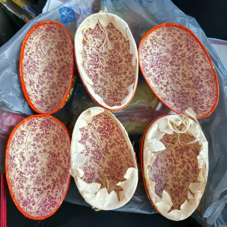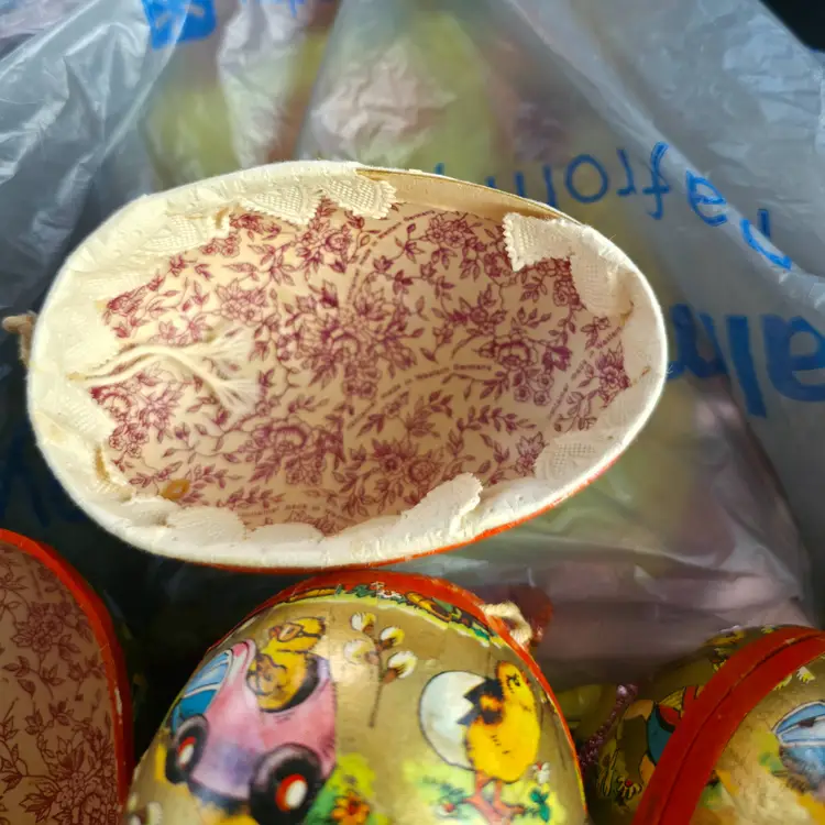 Vintage papier-mâché Easter egg candy containers made in Western Germany, dating to the mid-20th century (1950s–1970s). This listing is for a matching set of three eggs, each featuring colorful vintage Easter graphics and original printed interior paper liners marked “container made in Western Germany.” These are classic German Easter decorations, perfect for: Easter and spring displays Tiered trays or vignette styling Vintage holiday collections Condition: Very good vintage condition with light age-related wear. Some minor interior paper loss consistent with age and use. No major structural damage. Colors remain bright and display well. Approx. 4.5–5 inches tall each.