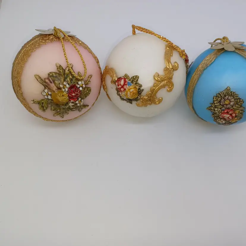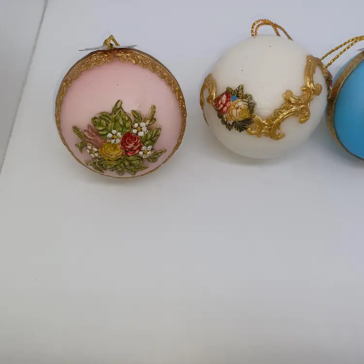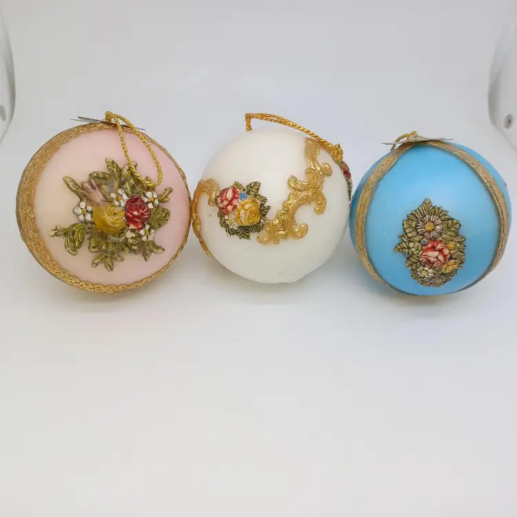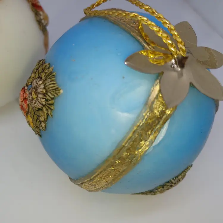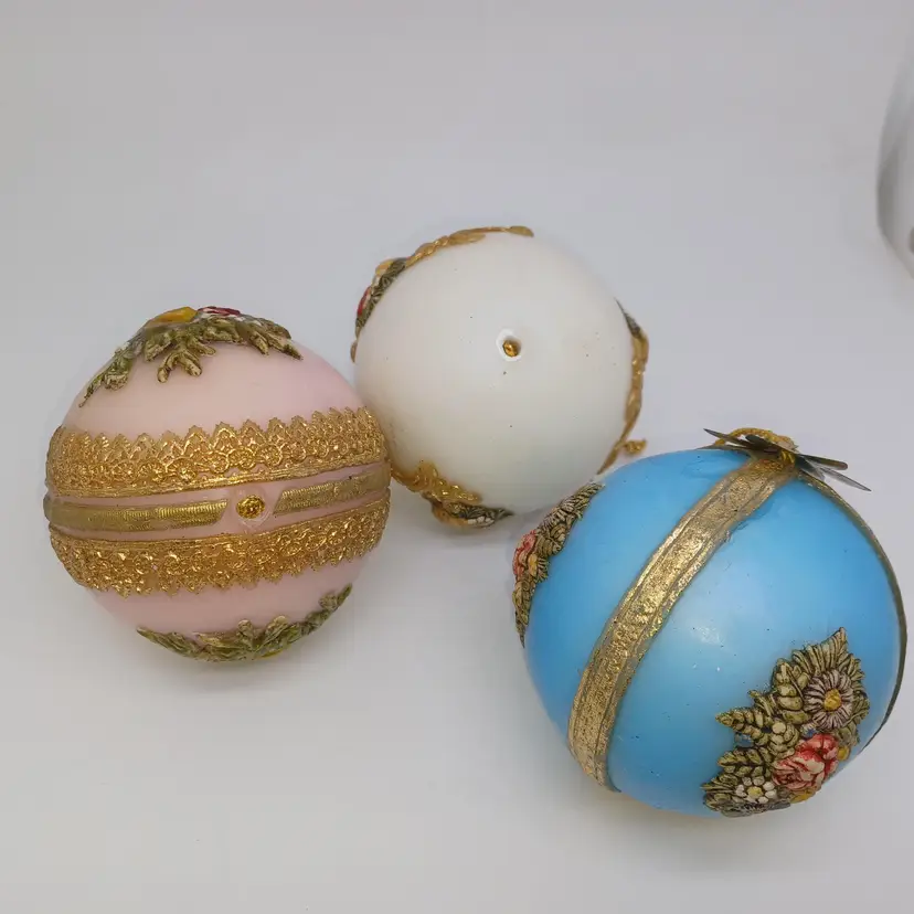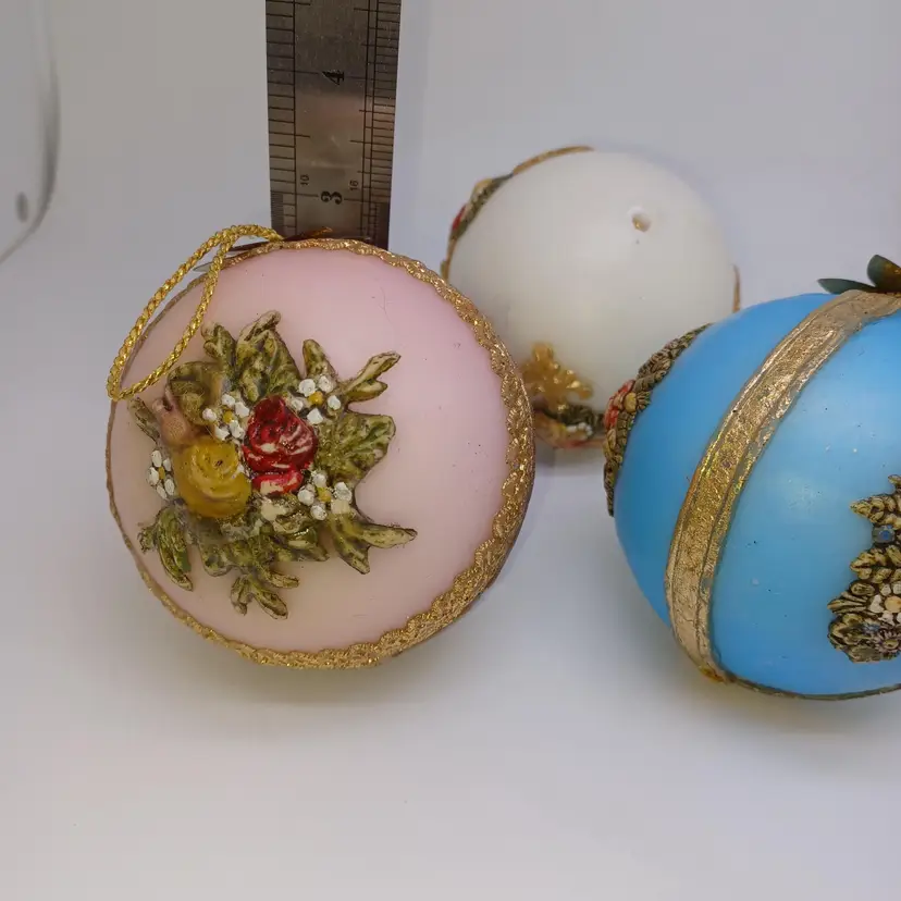 Vintage West German Zierkerze Gilded Hand Decorated Beeswax Christmas Ornaments Set of three pink white and blue hand-painted hand gilded with ribbon detail Victorian era in good antique condition the blue one does have a slight melt Mark at the top which I pictured but does not distract from use or display this is a fragile item that should not be mailed to a hot climate all items from a smoke-free home with pets experienced fragile shipper