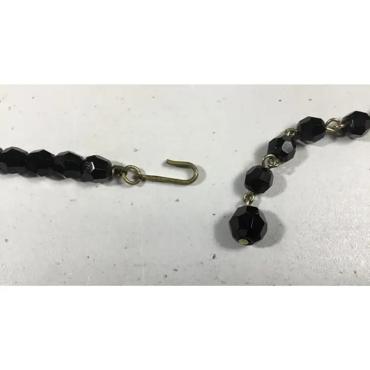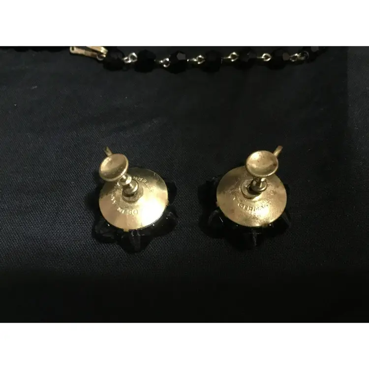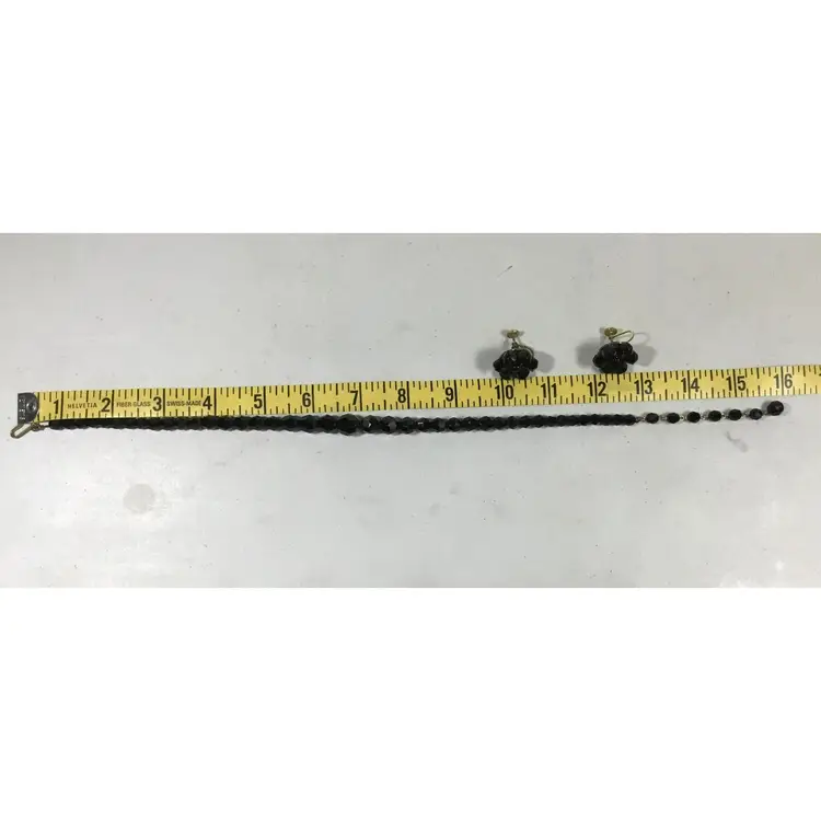 16" faceted, black glass bead necklace on cord, with 3/4 inch wide black earrings, crystals are both glued AND sewn on earrings. Round cabochon in center of earrings. Sparkly. minor tarnish, one earring back wiggles, teeny tiny scratches on beads near clasp, can't be seen without jeweler's loupe.