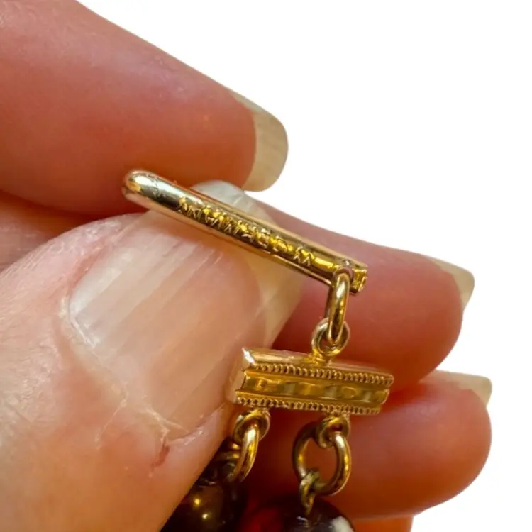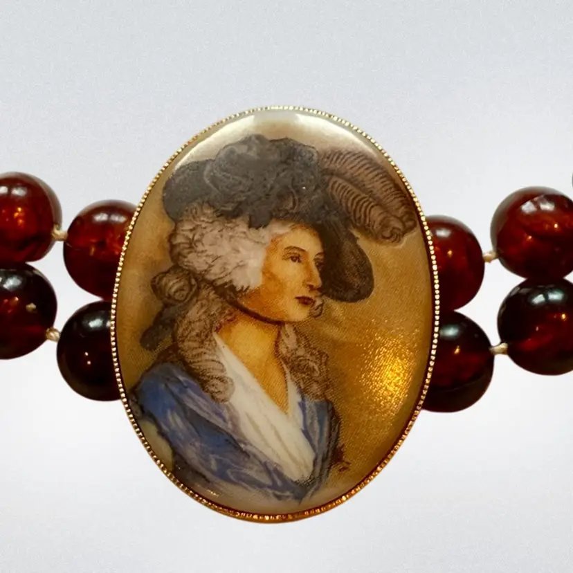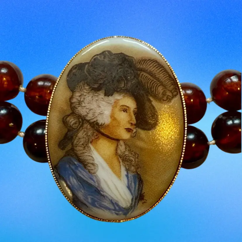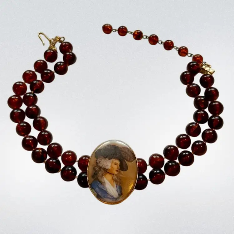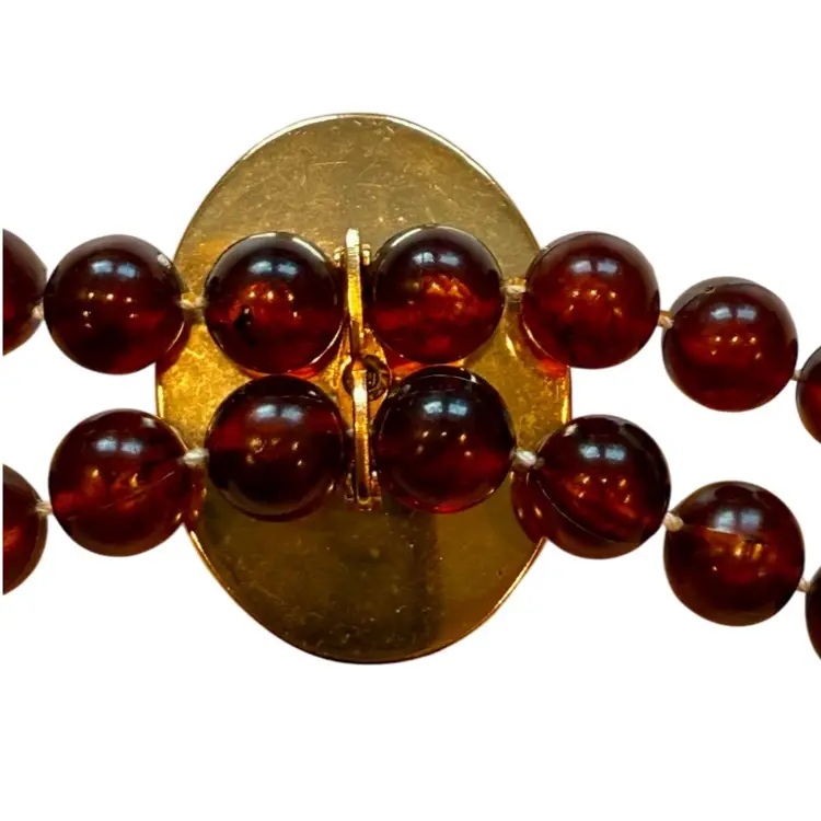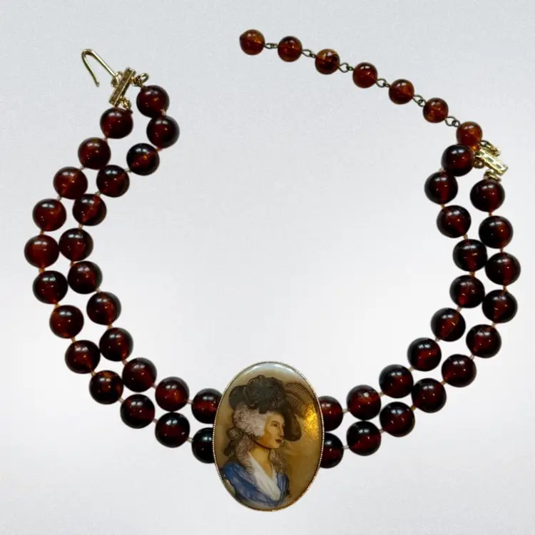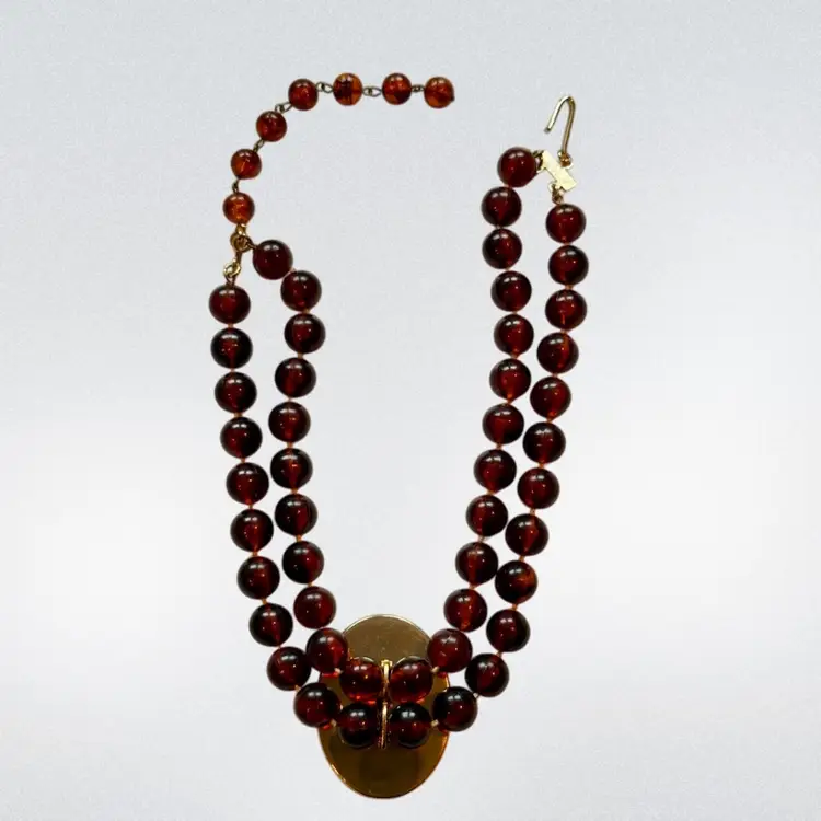 Vintage West Germany Double Strand Amber Plastic Beaded Necklace w/Detachable GoldTone Cameo Clip On Pendant
