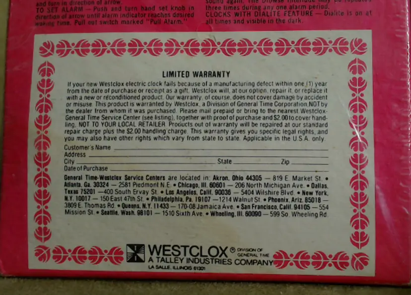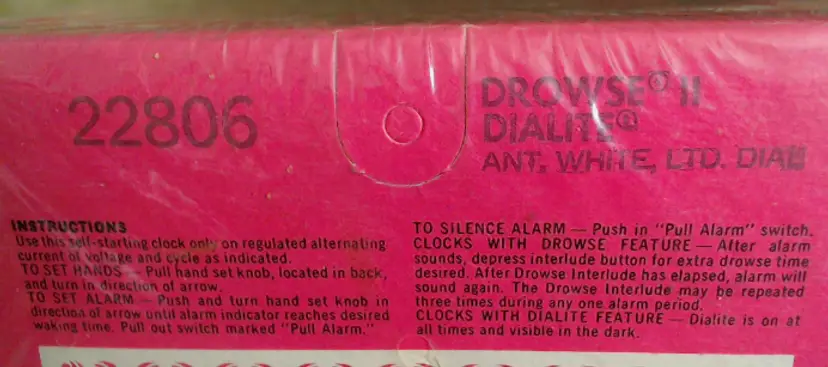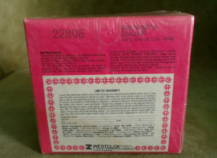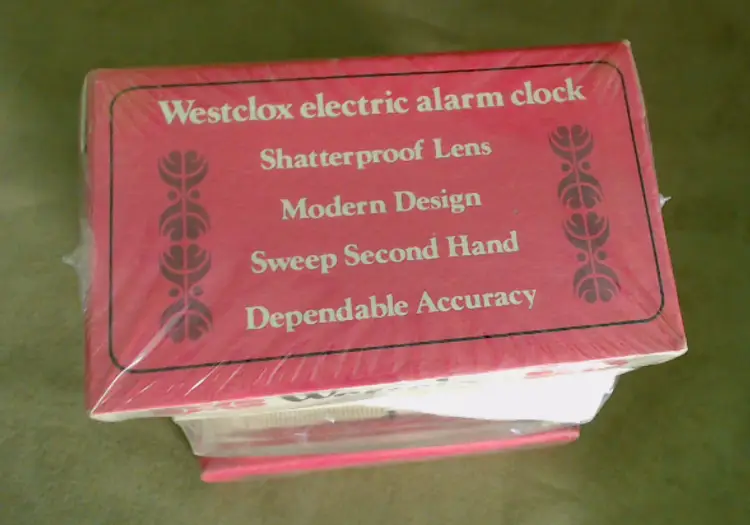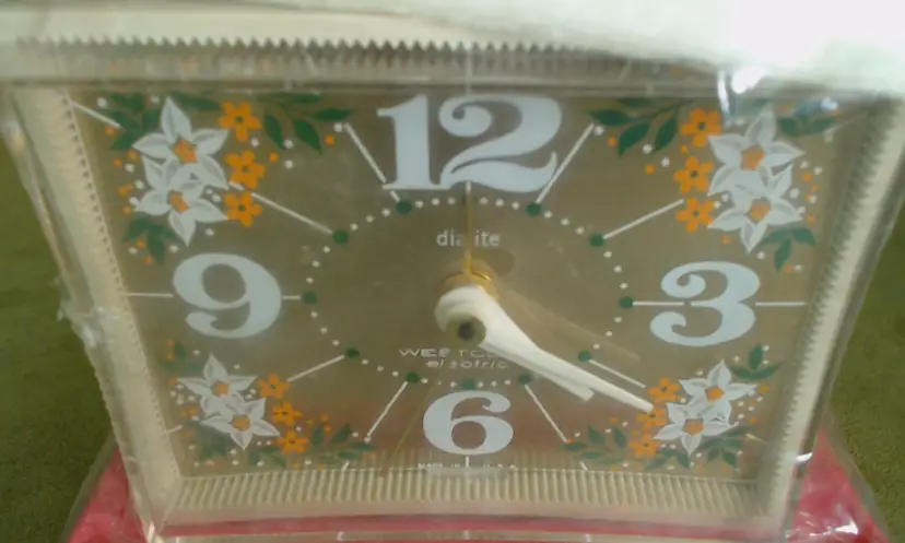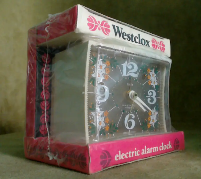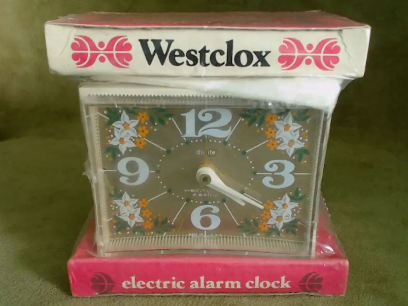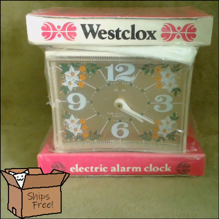 This is a vintage alarm clock, still sealed in the box! This clock is the "Antique White" model, and was produced under the Westclox label. Their catalogs have this model listed from 1975 until 1980, and boy does this design capture the era! Those pretty flowers on that gold face are perfectly late 70s. I almost kept this one to myself... I still might change my mind! Condition: This clock is in Excellent shape! As it's factory sealed I cannot test it, but it's extremely well kept so I would assume it still works. There is a slight bit of wear to the box, as humidity has crept through the plastic over the years, but absolutely nothing serious to report! Size As it's in the package, I can't give you an exact measurement, but the box measures 5" across, 3" wide, and is 5" tall. The clock's face measures 3¾" by 3", and that's about all I can reach properly!