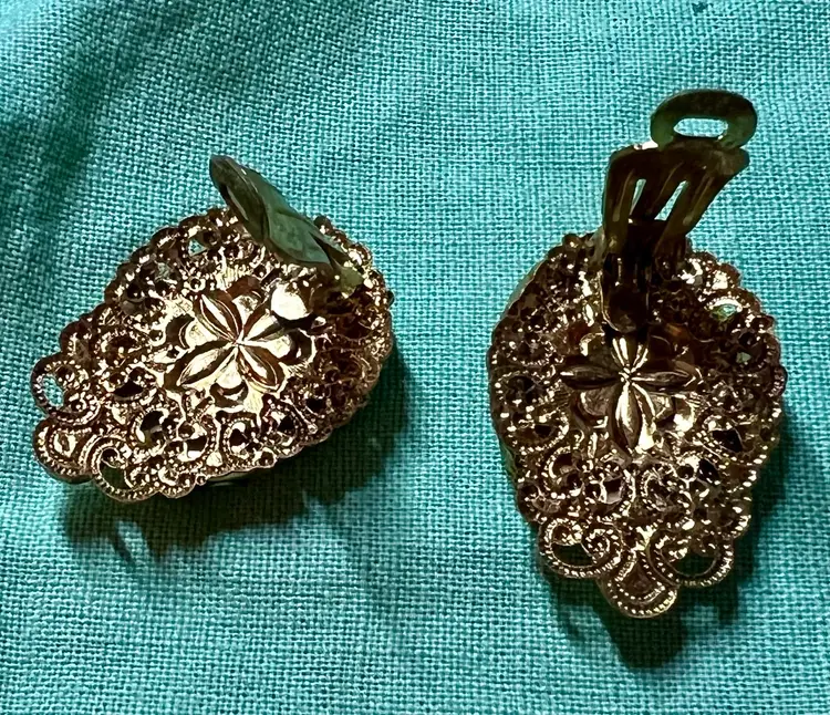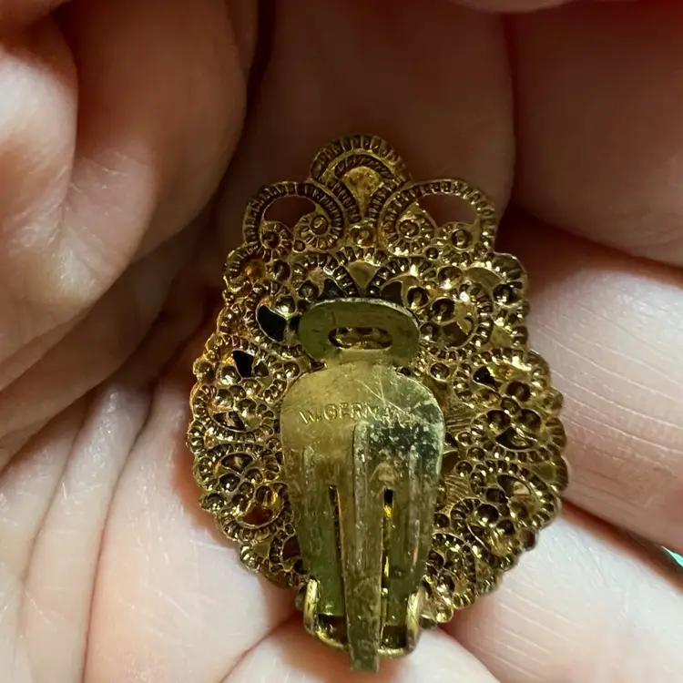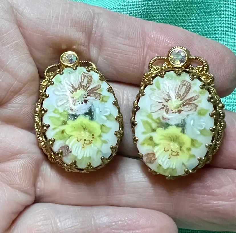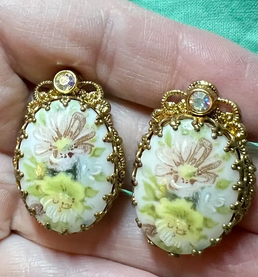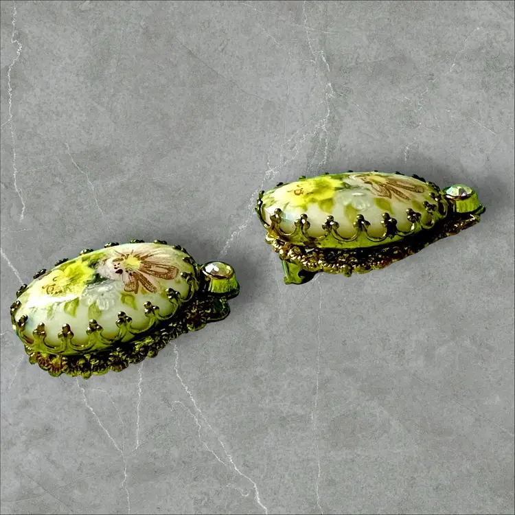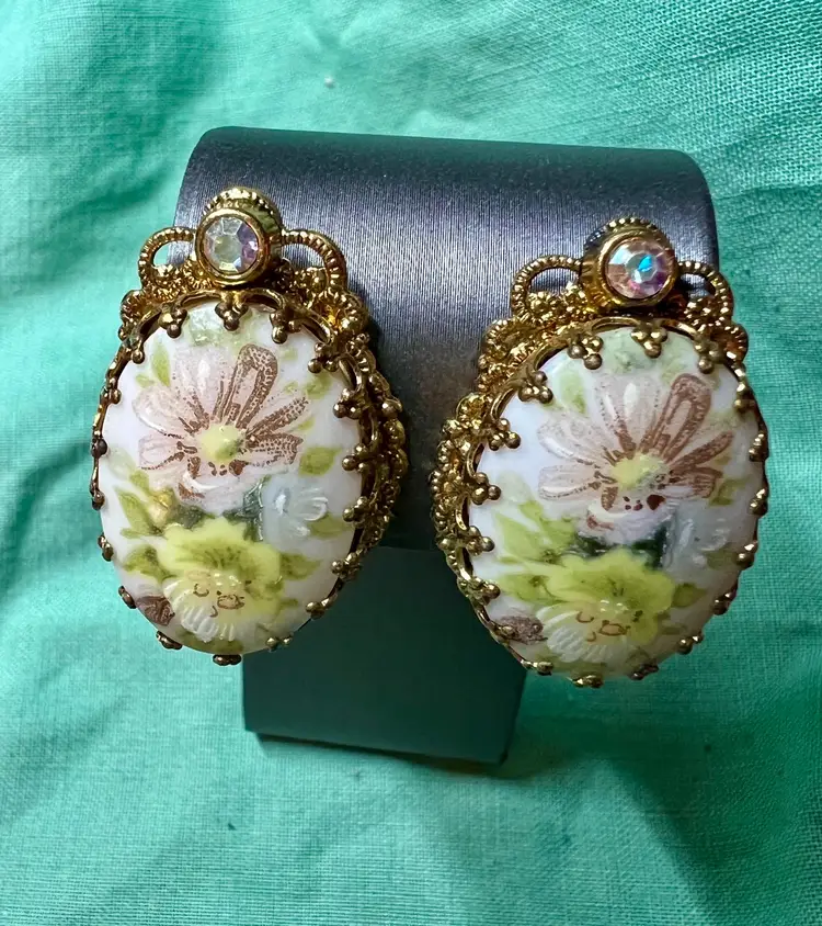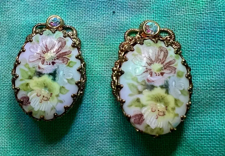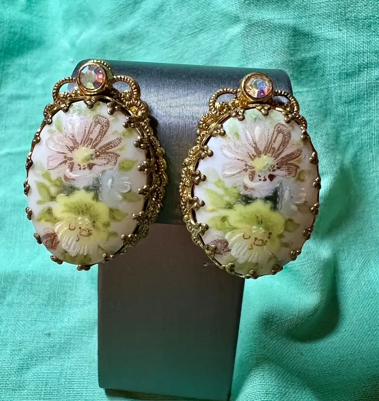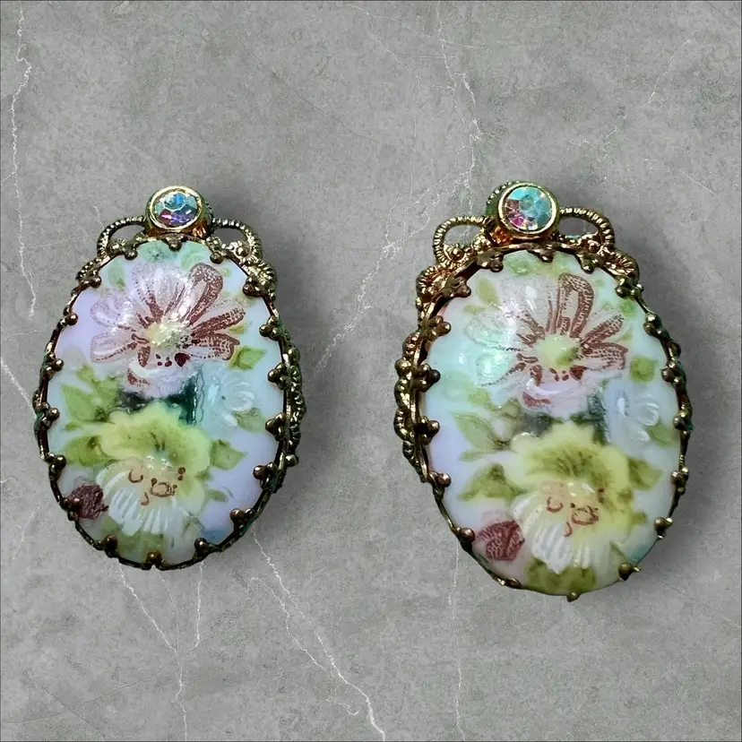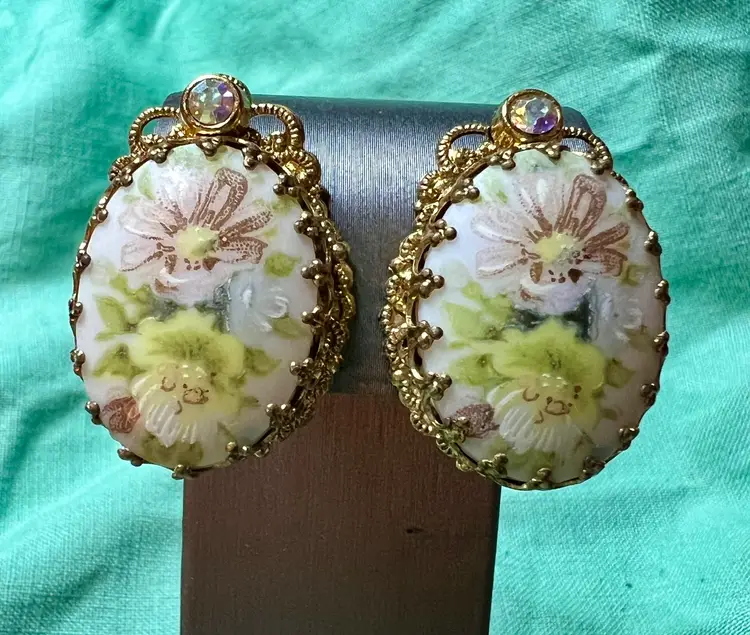 These vintage clip-on earrings from Western Germany are a stunning addition to any retro jewelry collection. The oval shape and gold tone provide a classic look, while the hand painted porcelain and AB stones add a unique touch of elegance. The earrings are clip-on style and measure 1 inch in length, making them comfortable to wear for any occasion. They are signed and in excellent condition, perfect for any fashion enthusiast. The setting style is prong and the base metal is unknown. These earrings are a true representation of the era, dating back to 1935-1950 in the country of origin, West Germany.