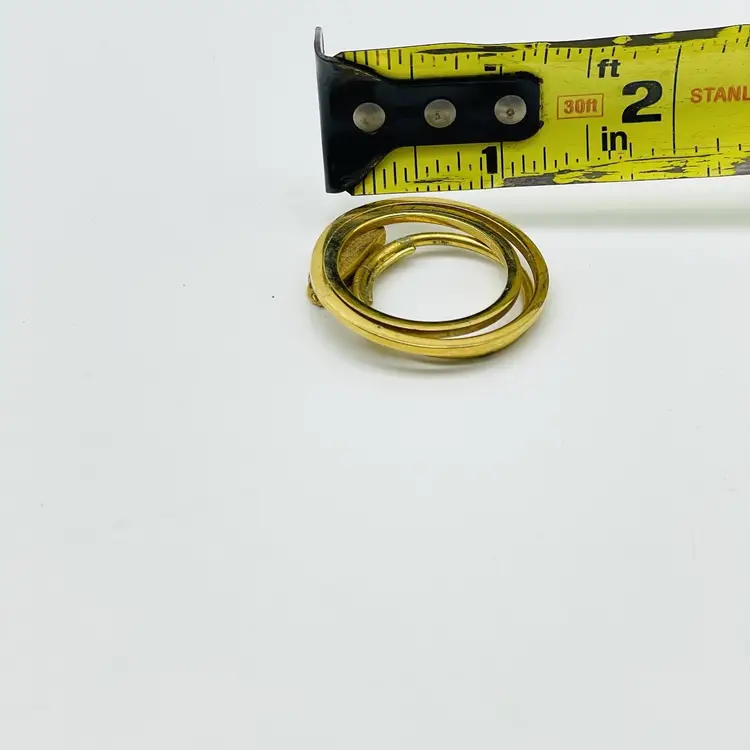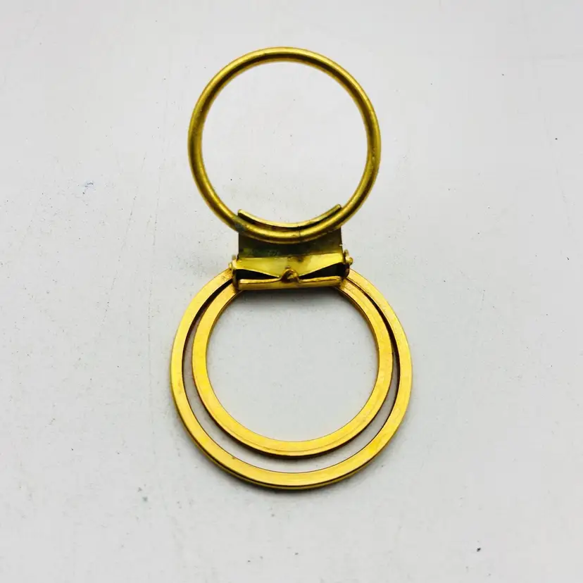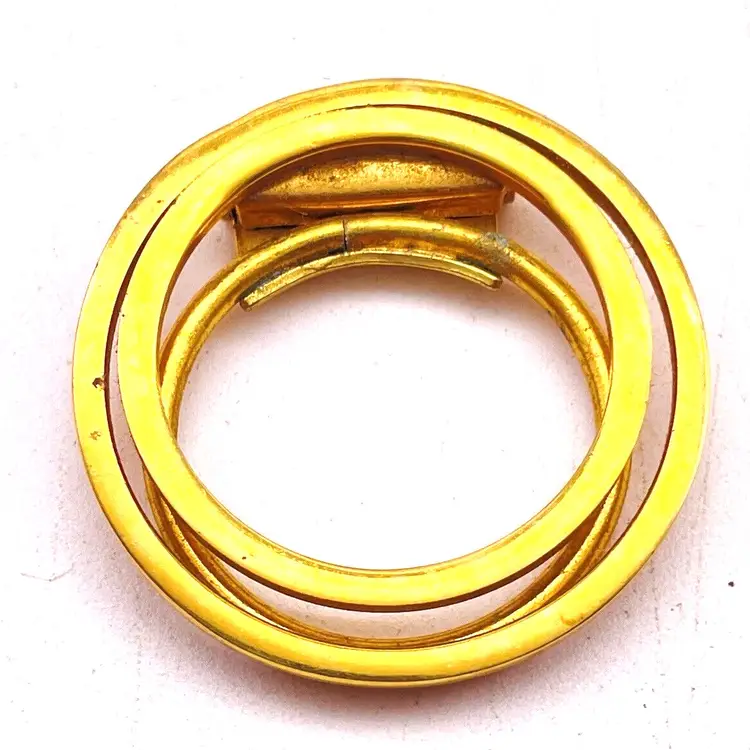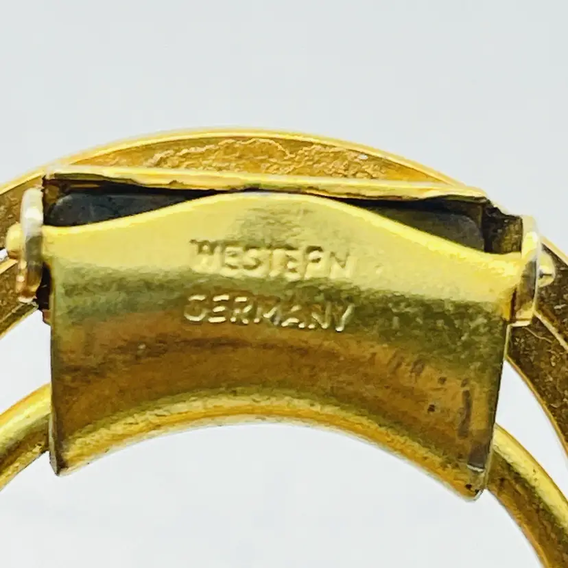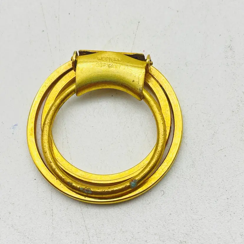 Elegant vintage scarf clip signed Western Germany featuring a modernist concentric circle design in gold tone. Features Signed West Germany Gold tone modernist circular design Secure clip back for scarves or accessories Mid-century retro style Condition: Pre-owned, light wear consistent with age
