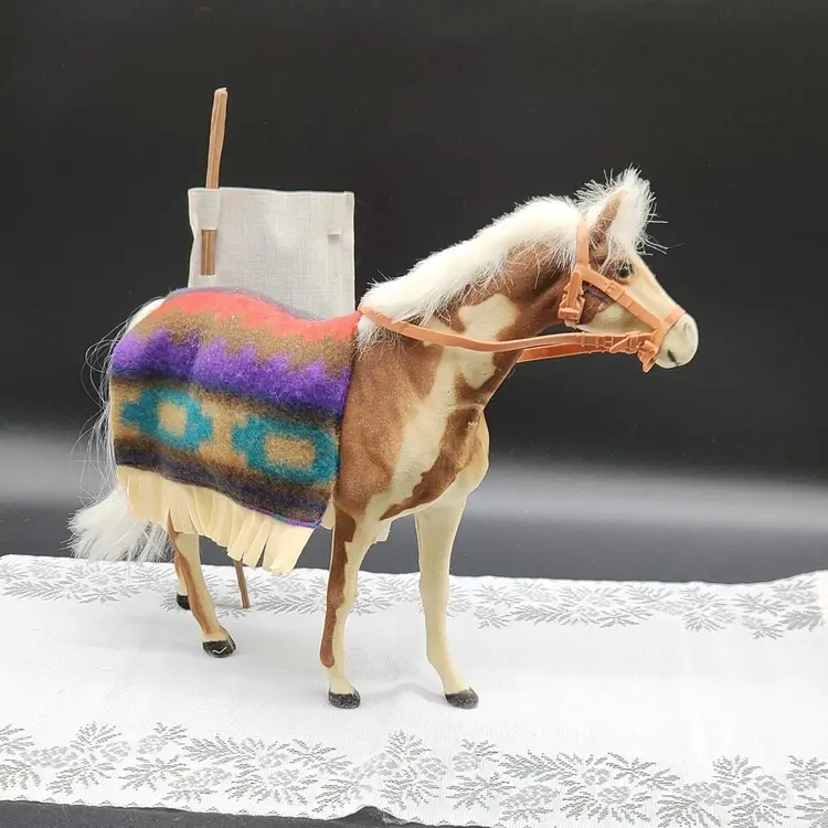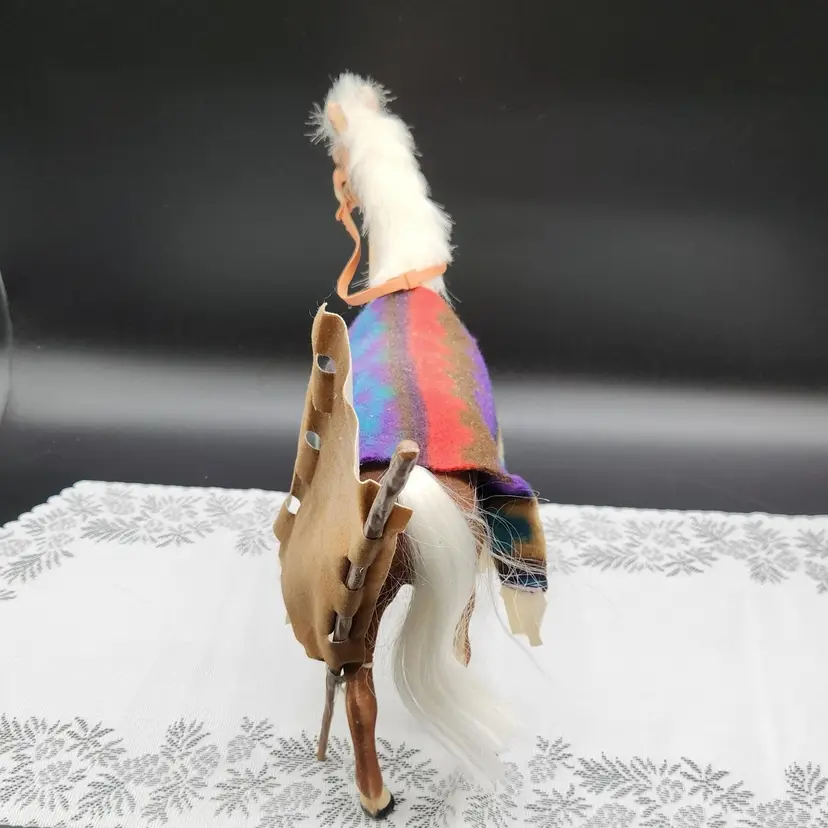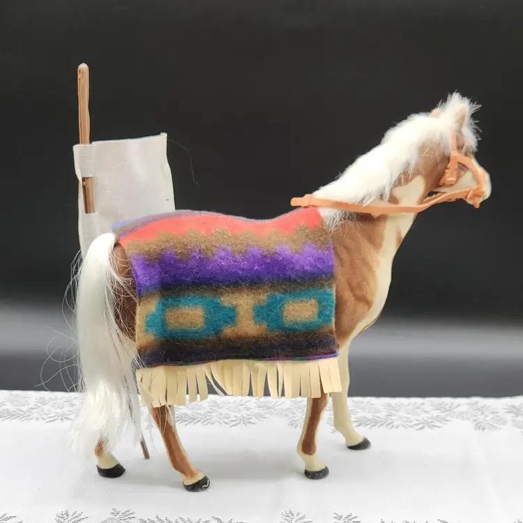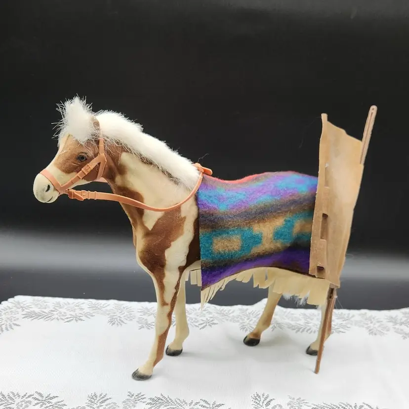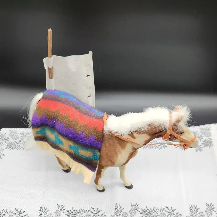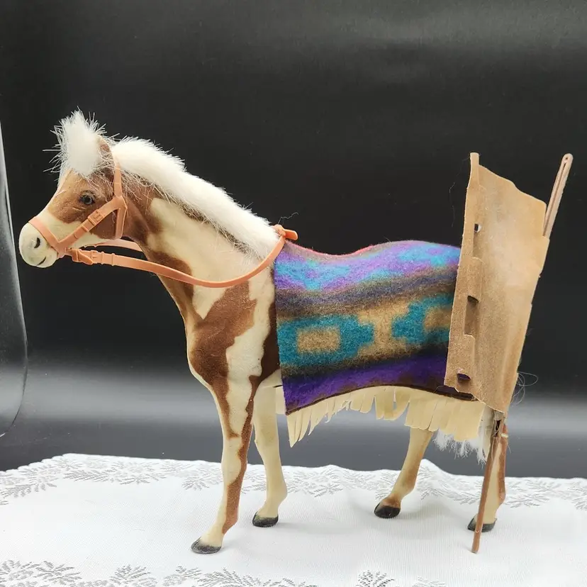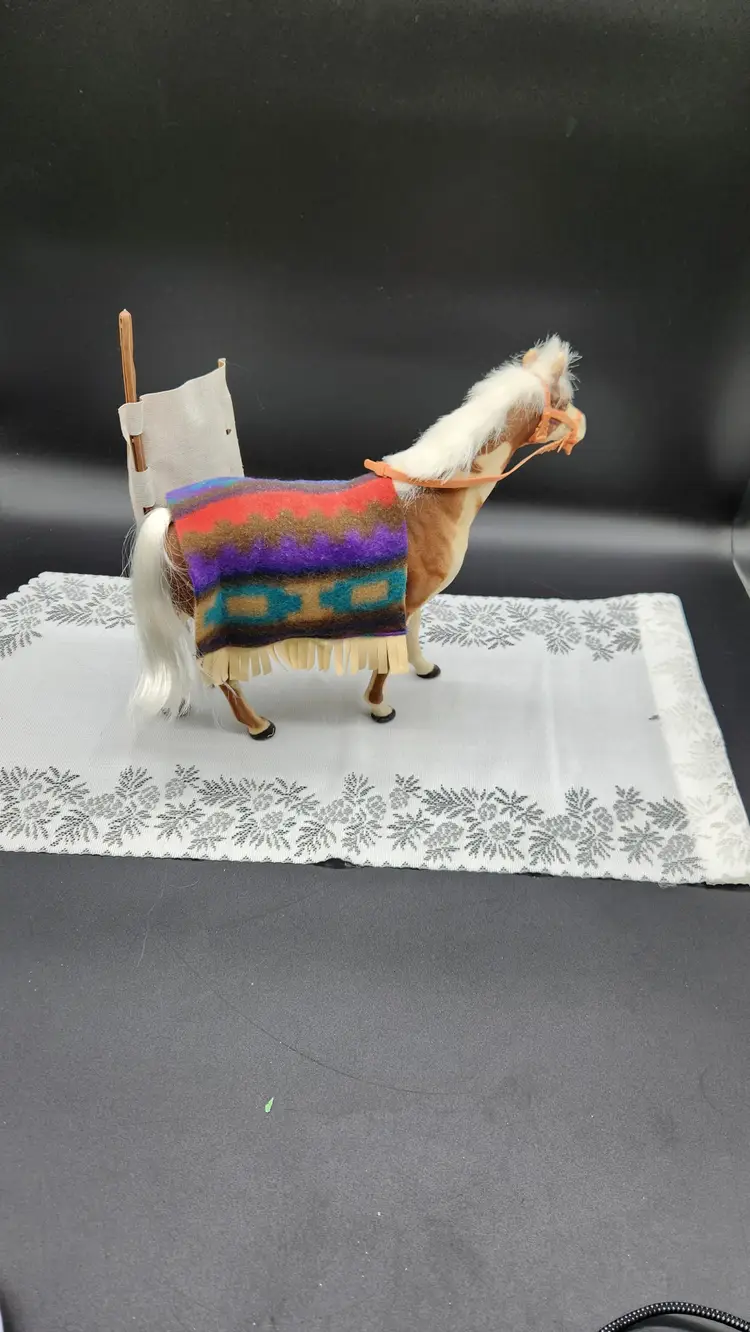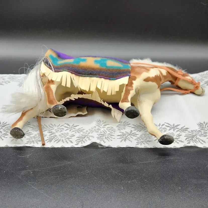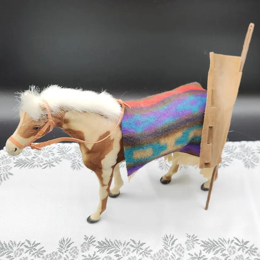 Charming vintage horse figurine featuring a colorful felt blanket and leather bridle. Perfect for collectors or Western decor enthusiasts. No visible damage. 10 in H 12 in L